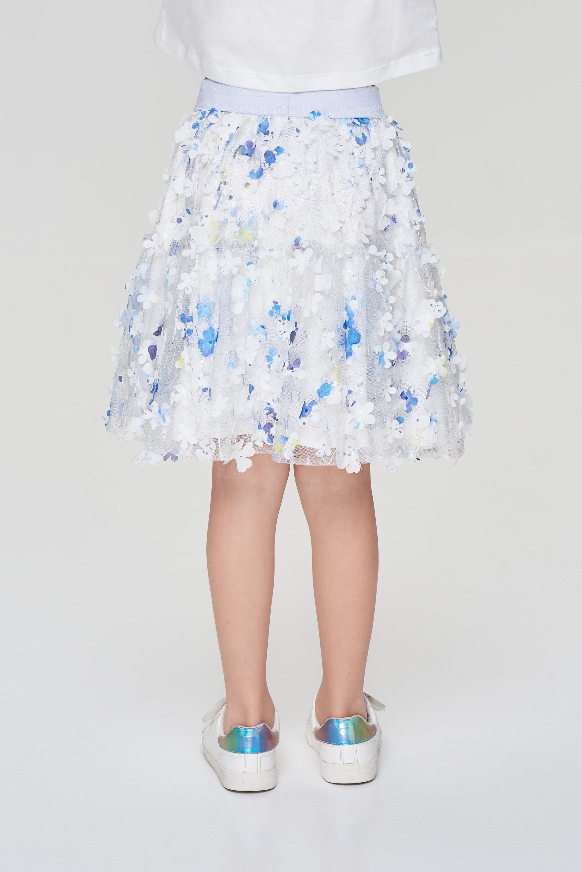 Lightness and tenderness. An elegant half-sun skirt in blue tones is decorated with a pattern with a 3D effect: blue flowers scattered on the surface of the fabric are made so skillfully that they seem alive. Along the bottom edge is a wide shuttlecock, from under which a pleated sub-skirt peeks out flirtatiously. A wide elastic belt of white color highlights the waist.
