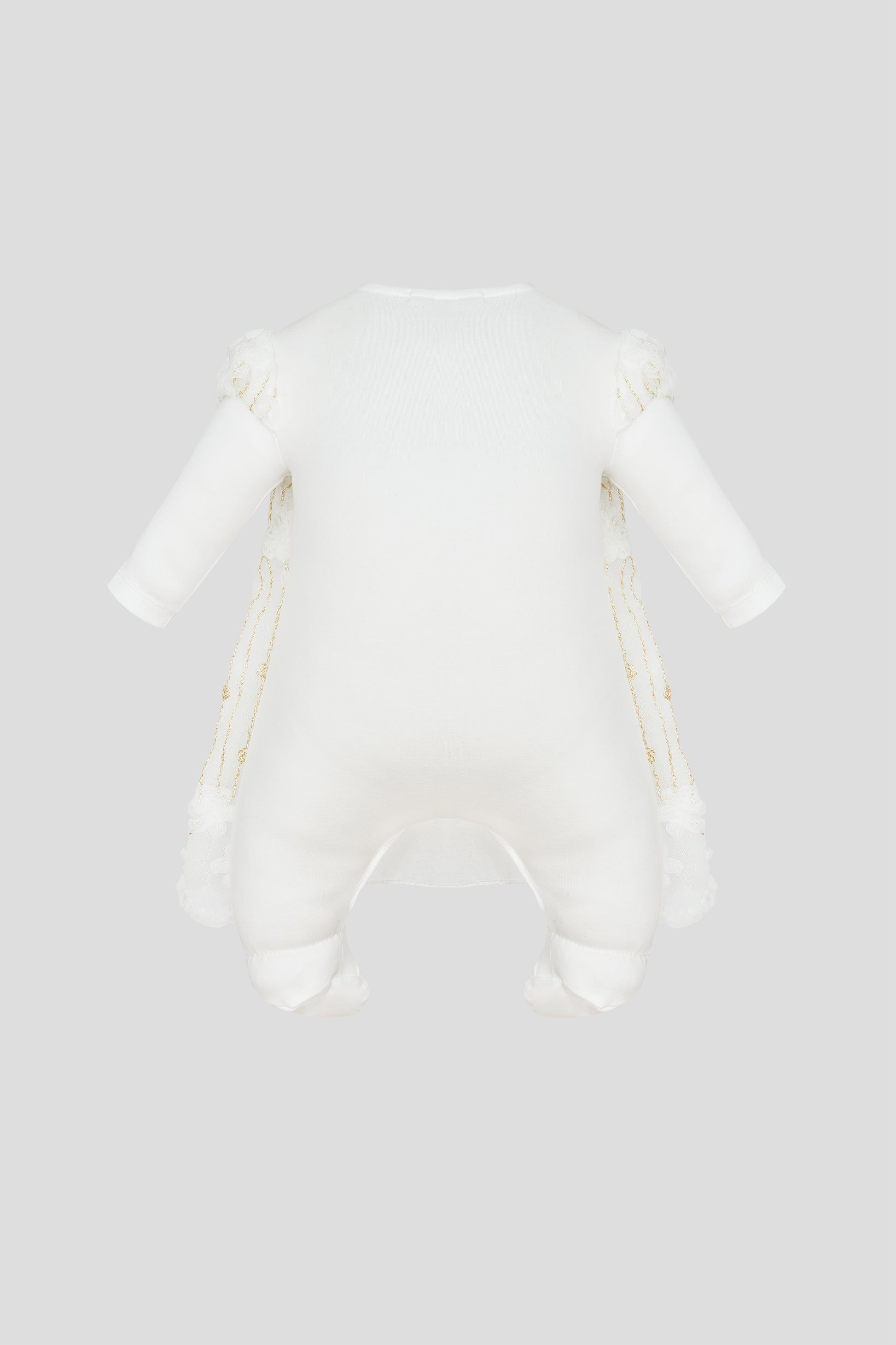 Very beautiful dress-jumpsuit for a girl. Light, comfortable, the baby will definitely like such a stylish and charming outfit. A gorgeous cut-off model in an elegant shade of ecru with gold is decorated with floral d?cor. Multi-layered skirt is lush as a cloud. The lining is made of natural cotton. Overalls with long sleeves and closed legs. Button closure. A perfect model for a little princess! Your sweet baby will be the tenderness itself.