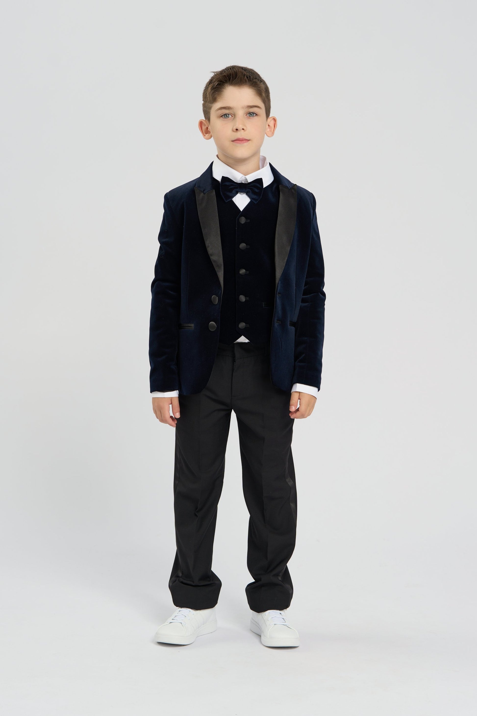 Indulge in luxury with our Velvet Tuxedo dark blue Blazer for boys. Crafted with elegant velvet, this blazer exudes sophistication and exclusivity. Perfect for special occasions, it offers a refined and tasteful look. Elevate your little one's style with this timeless piece.