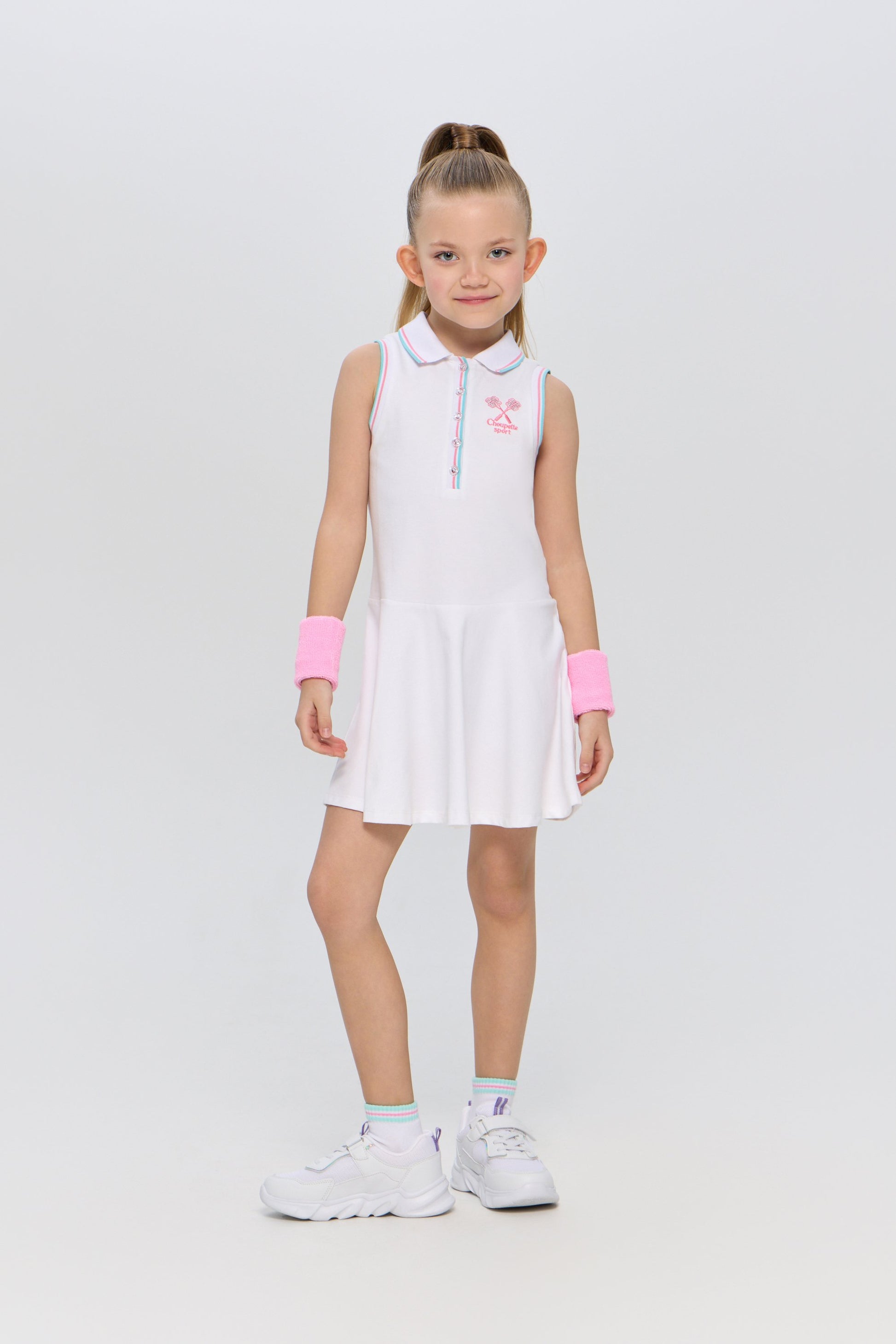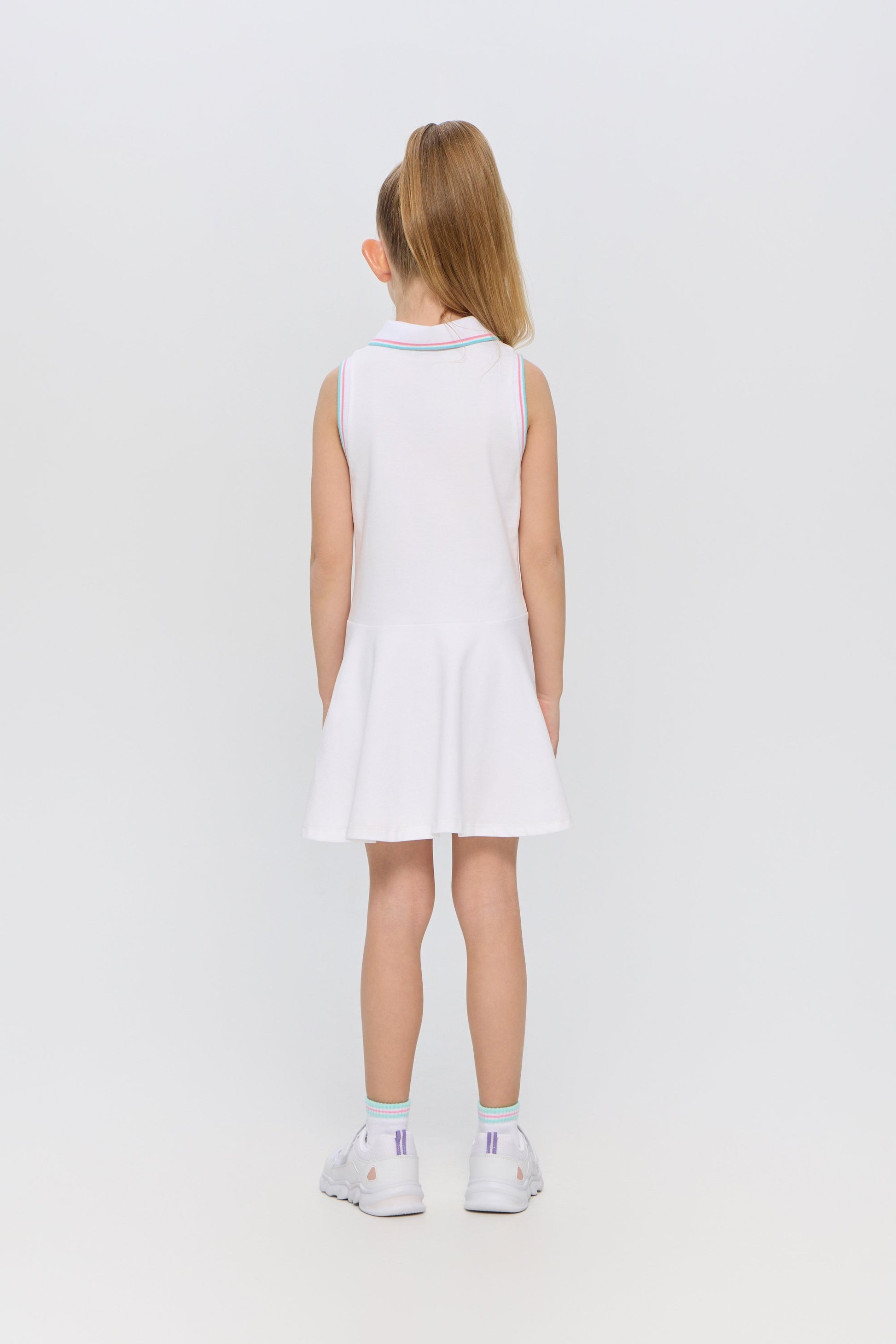 Let your little girl shine in this white Sports Polo Dress, featuring colorful accents and a sleeveless design for cool comfort. Perfect for sporty days and playful moments, it blends style with easy movement.