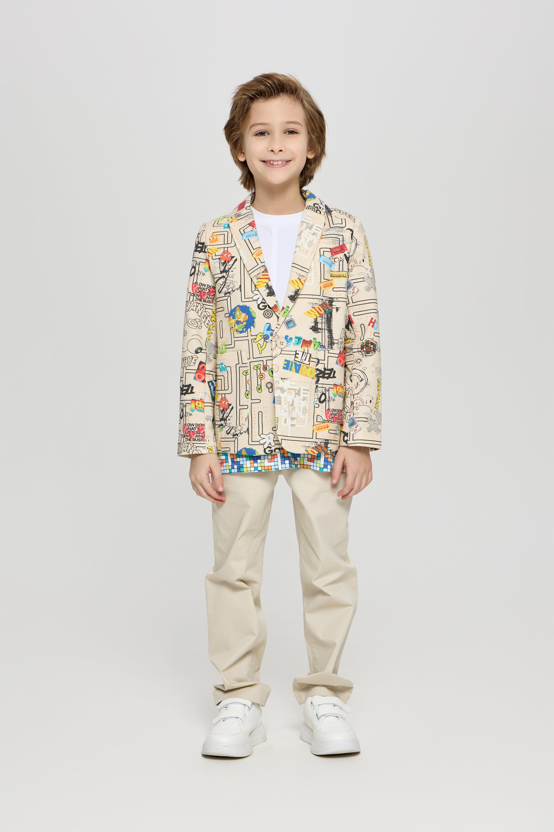Introducing the AOP Blazer, a must-have for any stylish boy. Crafted with expert attention to detail, this blazer features an all-over print for a unique touch. With its versatile design, it can be dressed up or down for any occasion. Elevate your young one's wardrobe with this statement piece.