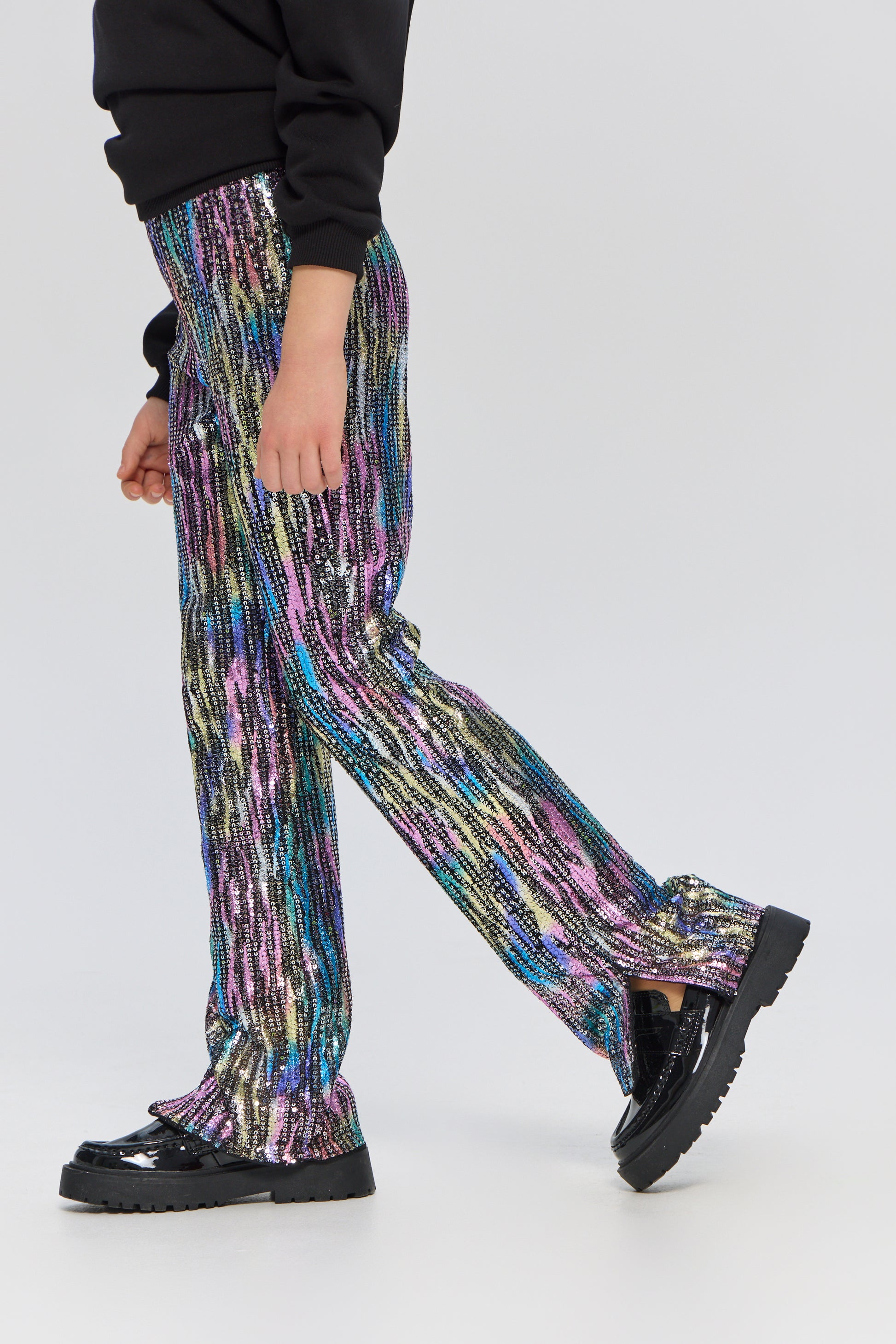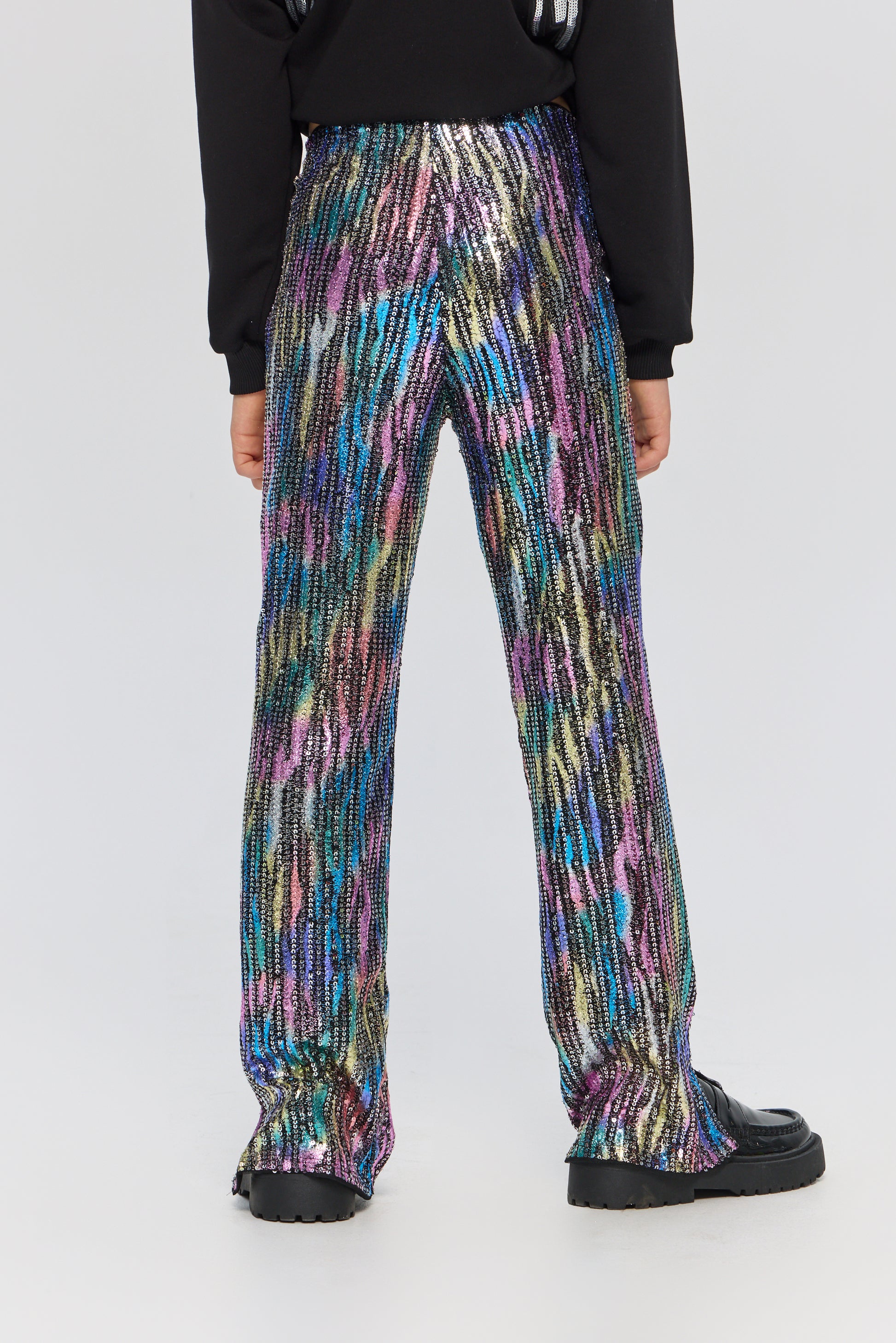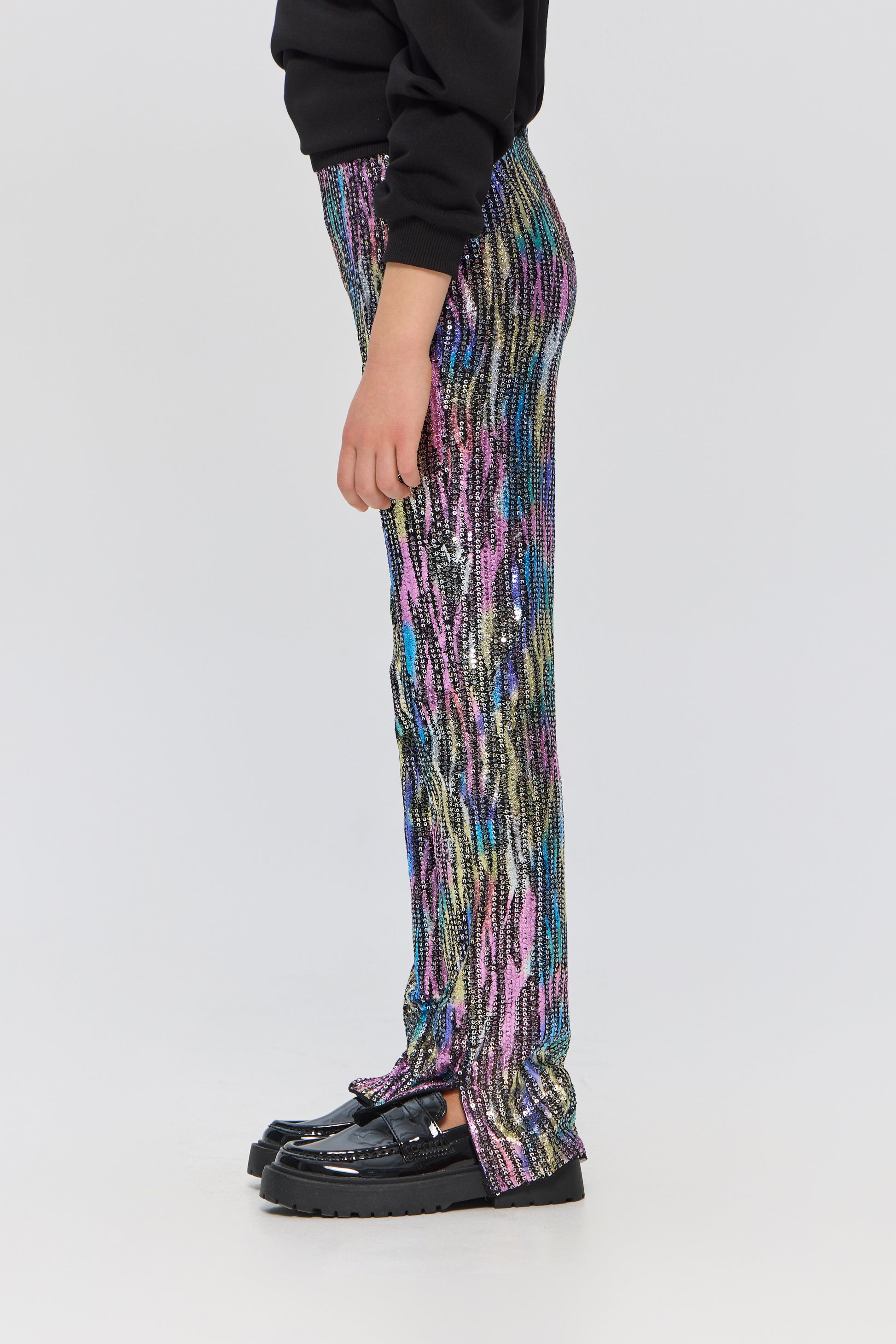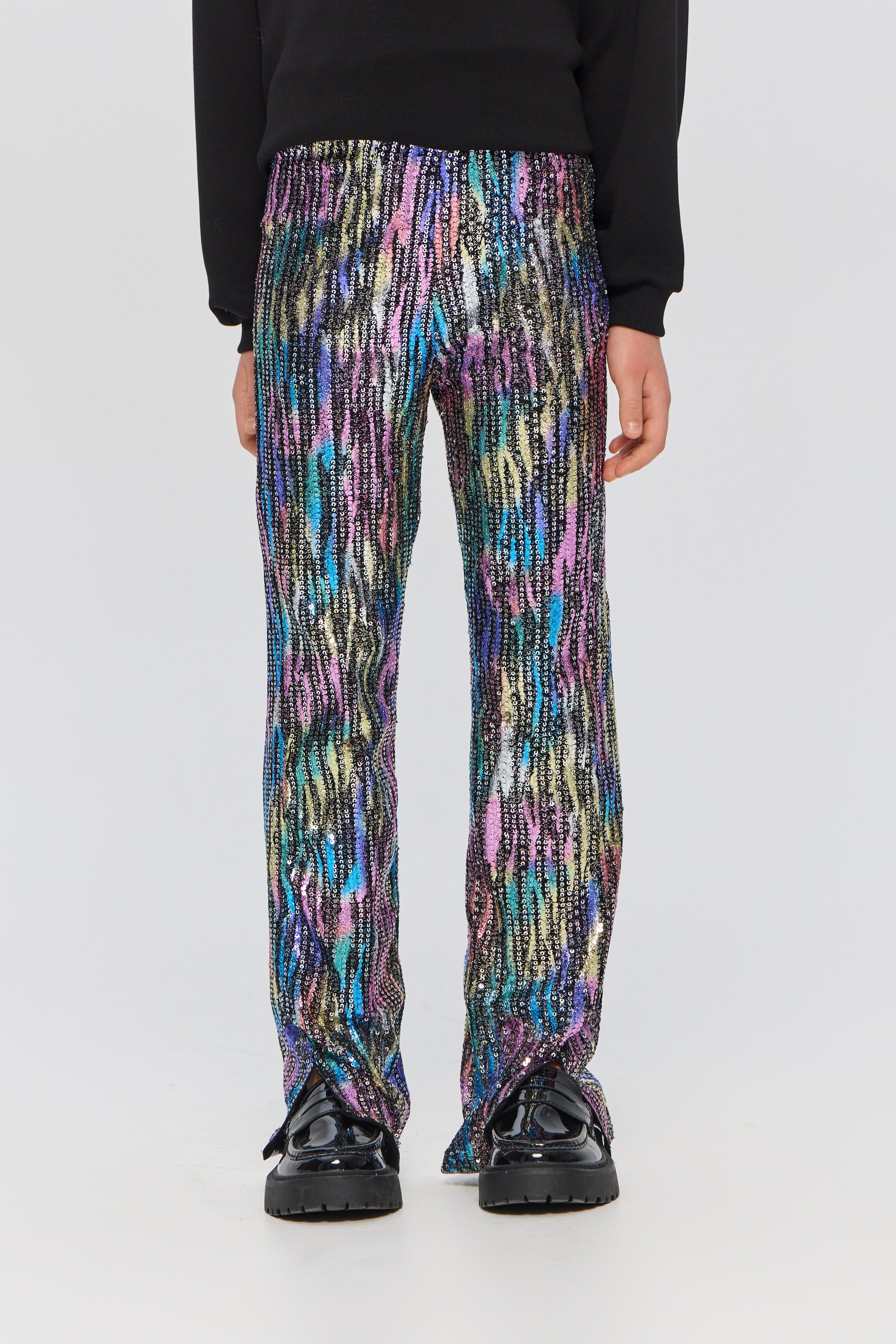 Shimmer and shine in these multicolored sequins trousers. Perfect for adding a touch of glam to any outfit. Whether you're hitting the dance floor or just want to stand out, these trousers are a fun and quirky addition to any wardrobe. (Disco ball not included.)