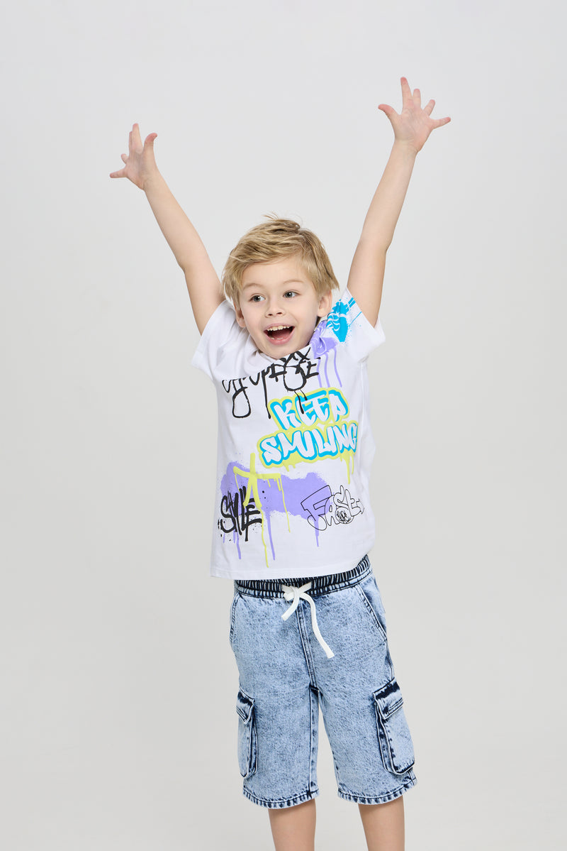 Add a pop of color and style to your little one's wardrobe with our Graffiti T-Shirt in ecru. Featuring eye-catching graphic design, this shirt is perfect for any young artist. Bring out their creative side and let them express themselves in a fun and unique way!
