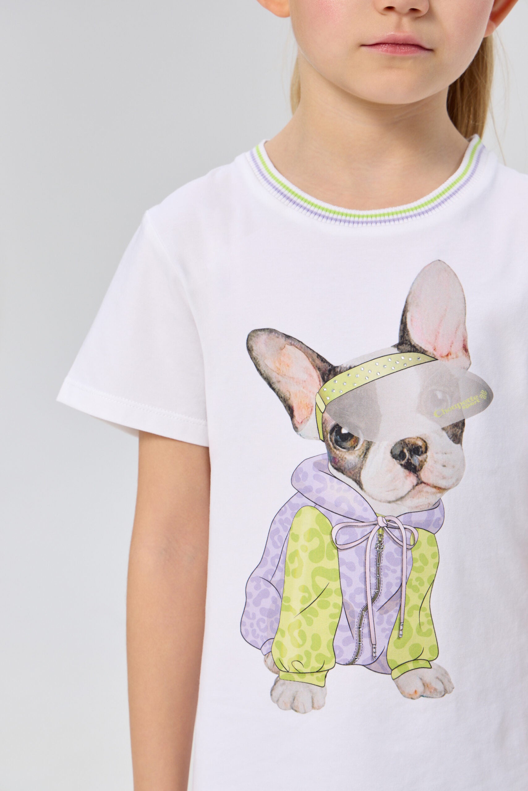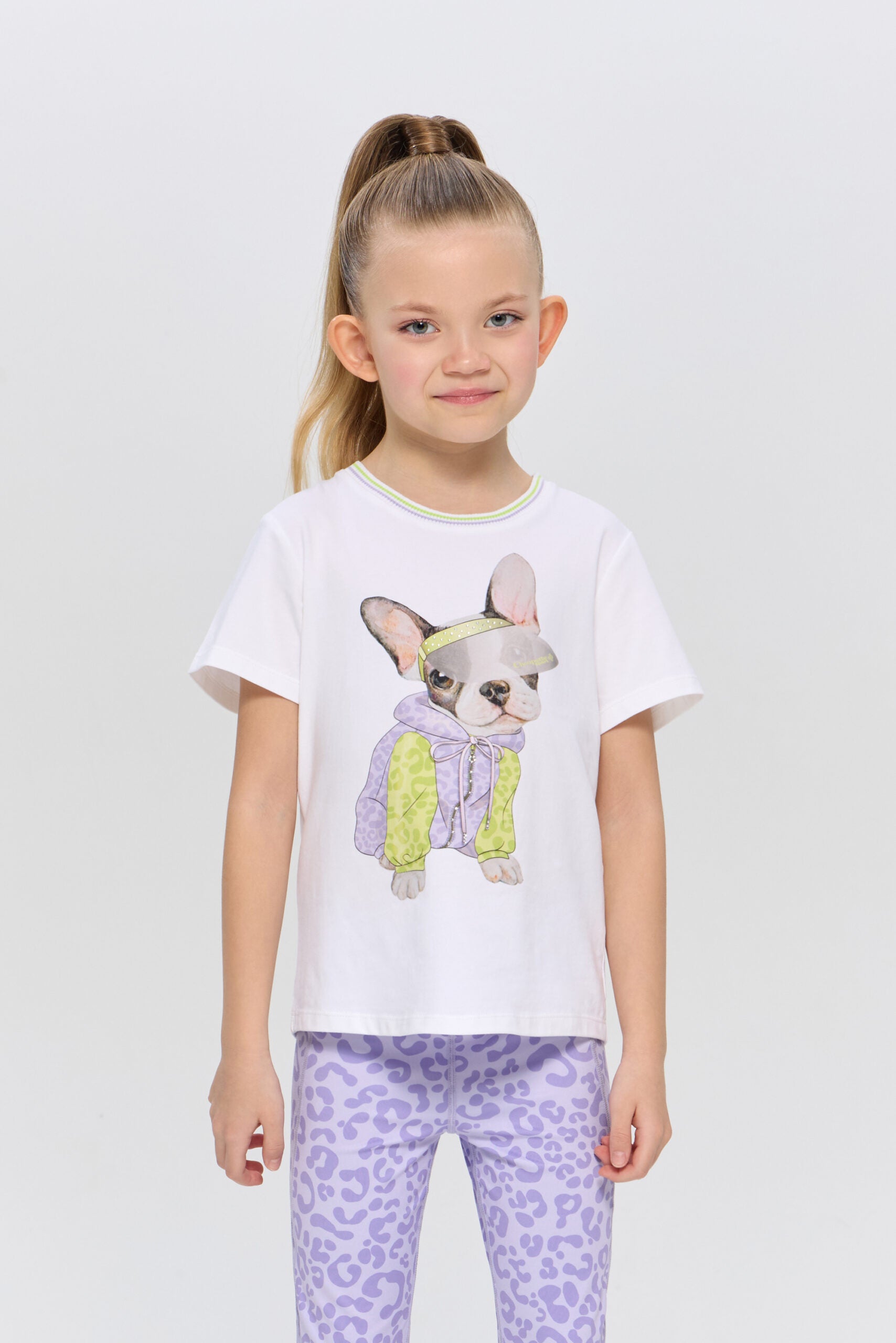 This adorable Doggy T-shirt in soft ecru is perfect for playful girls who love a touch of sparkle. Decorated with shimmering crystals, it adds a fun and stylish flair to any casual outfit. Comfortable and cute, it’s a delightful way to brighten up your day with a little sparkle and charm.