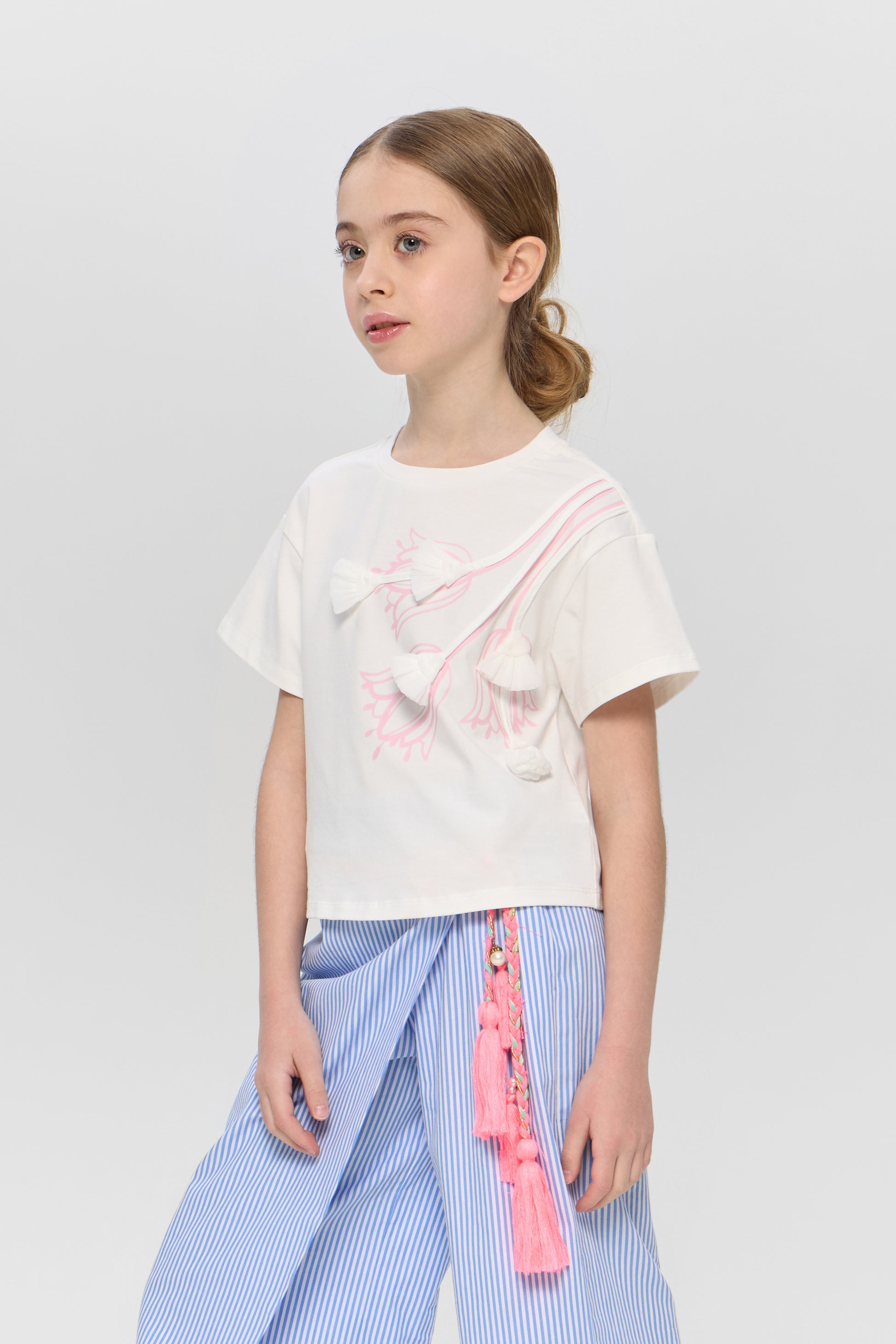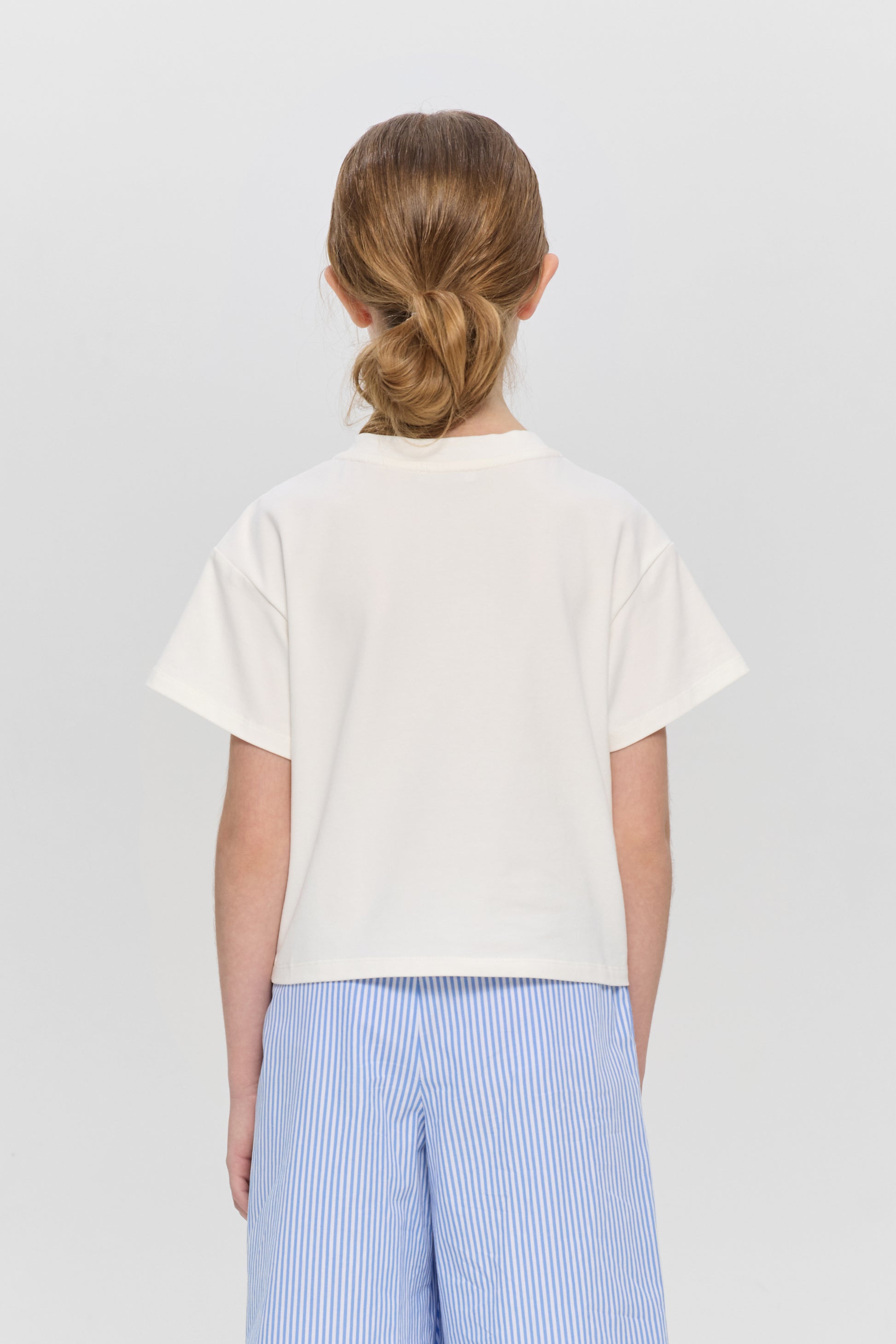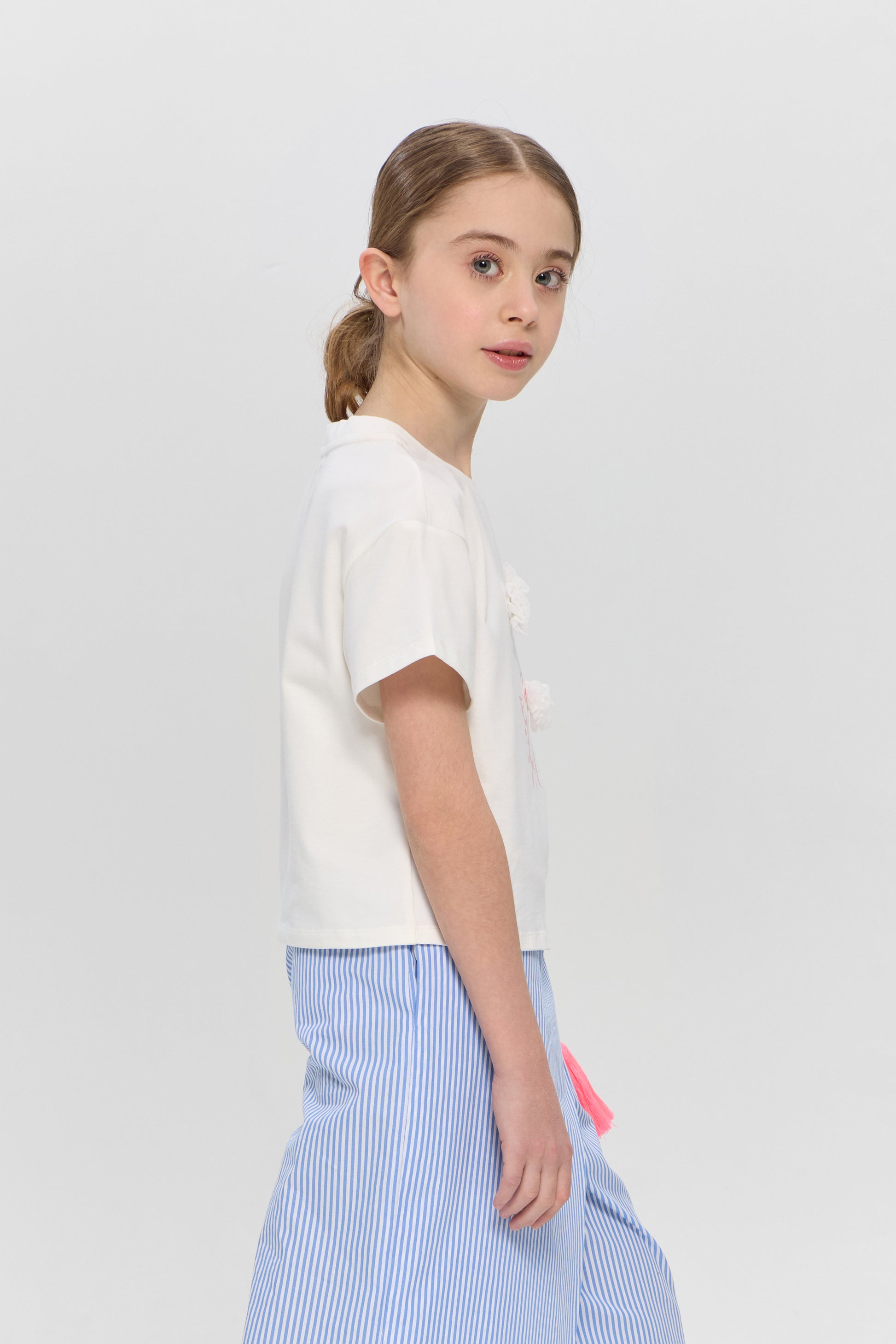This T-Shirt is decorated and cropped for a fun and unique look! Show off your playful side with this quirky and stylish top.
