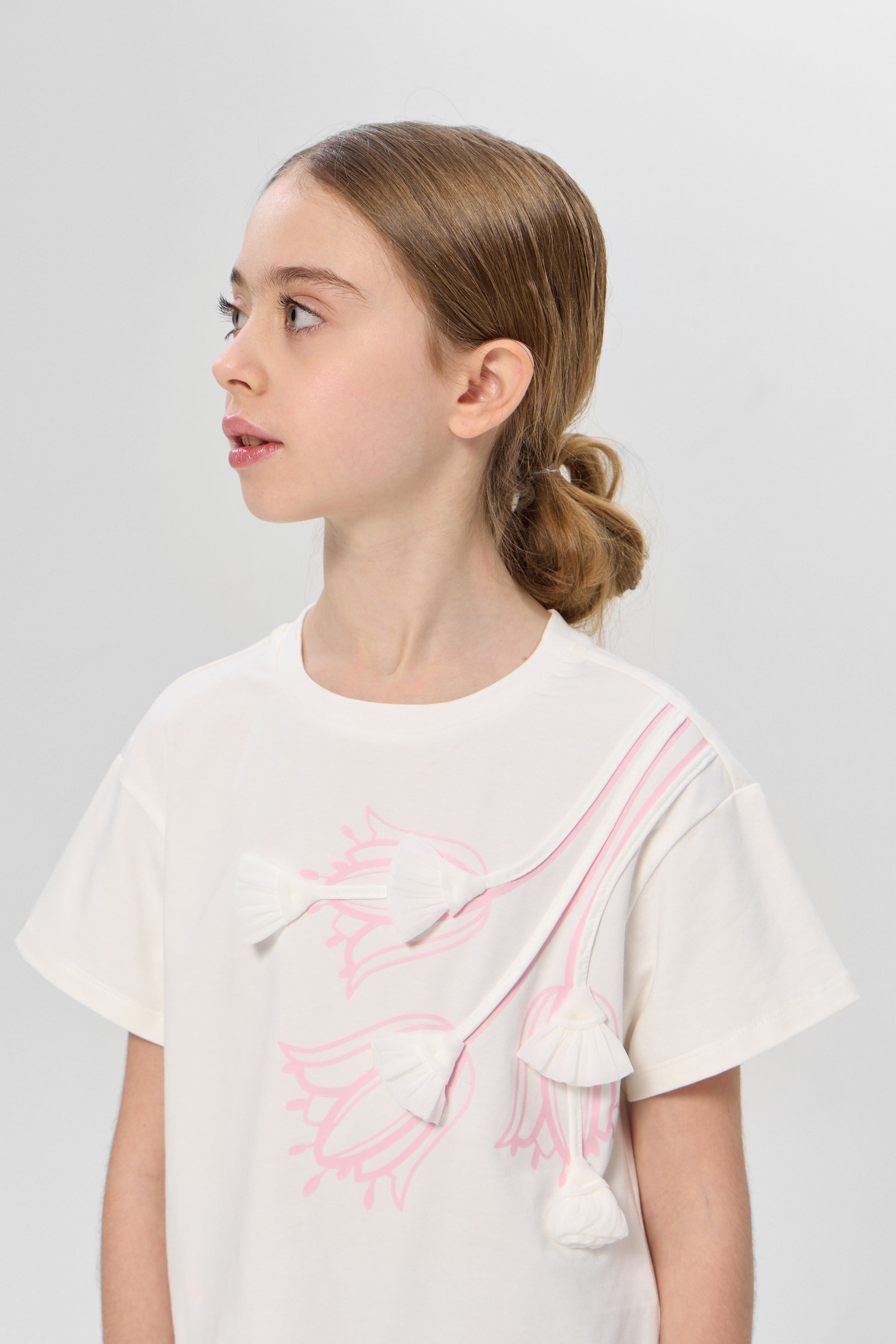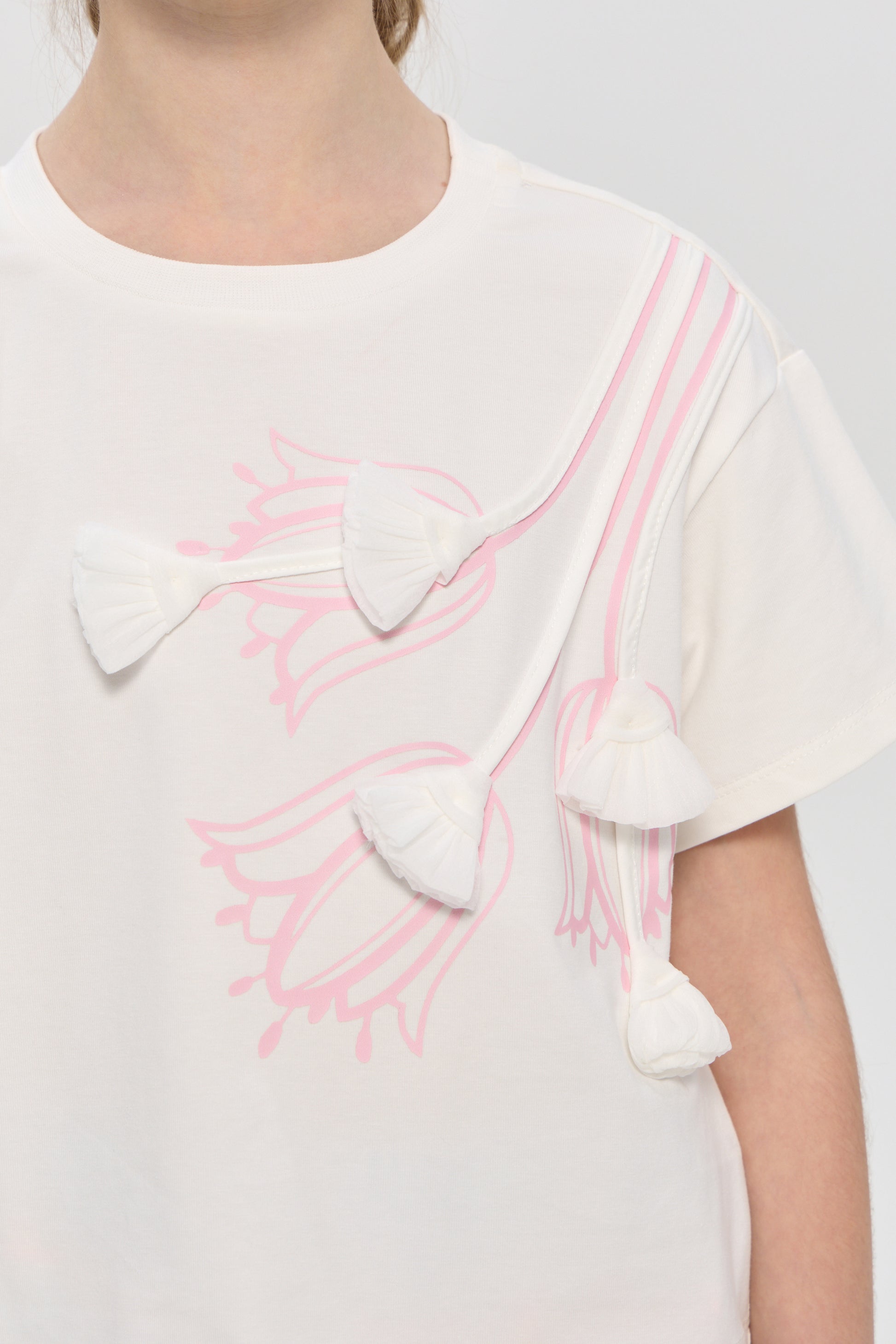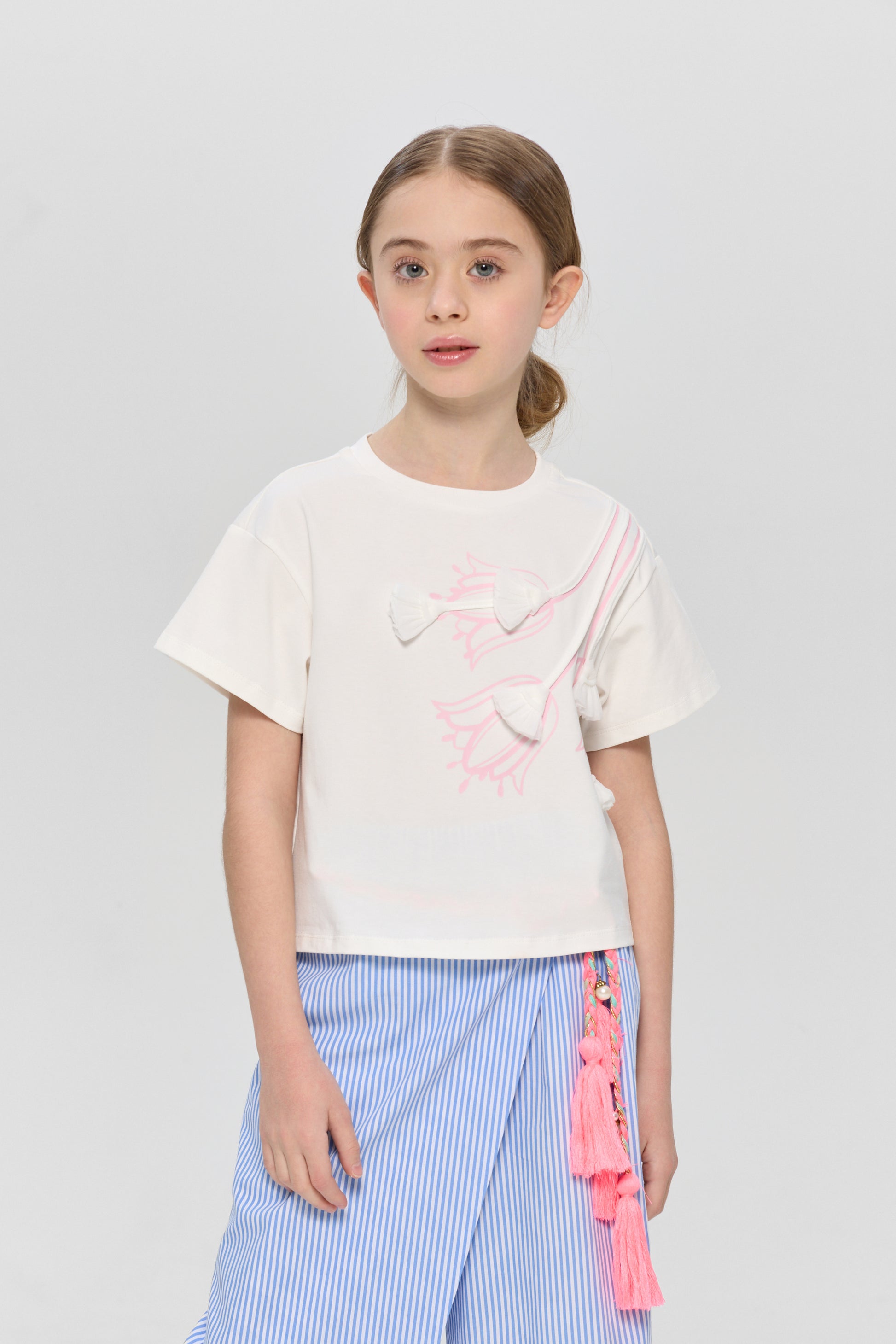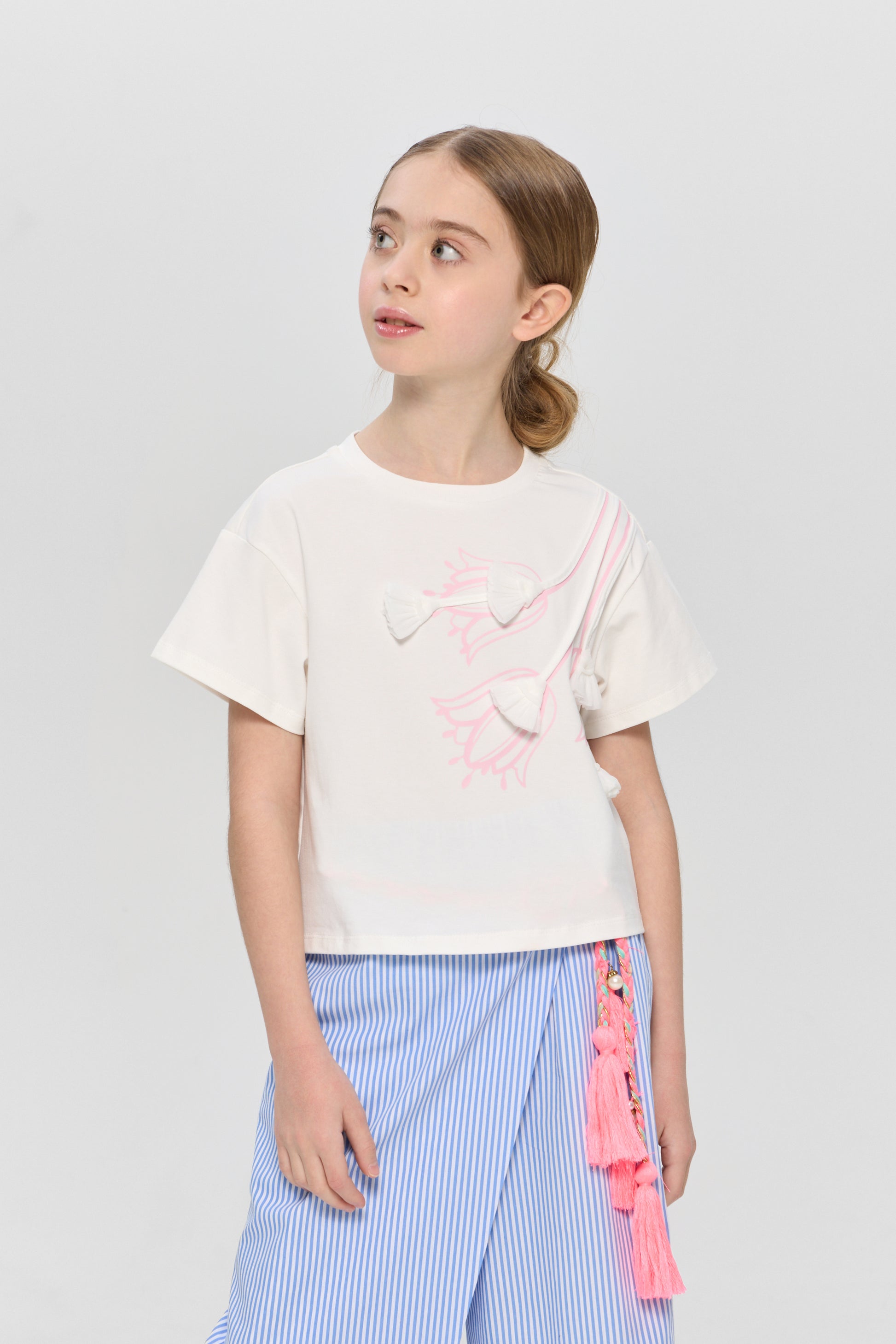 This T-Shirt is decorated and cropped for a fun and unique look! Show off your playful side with this quirky and stylish top.