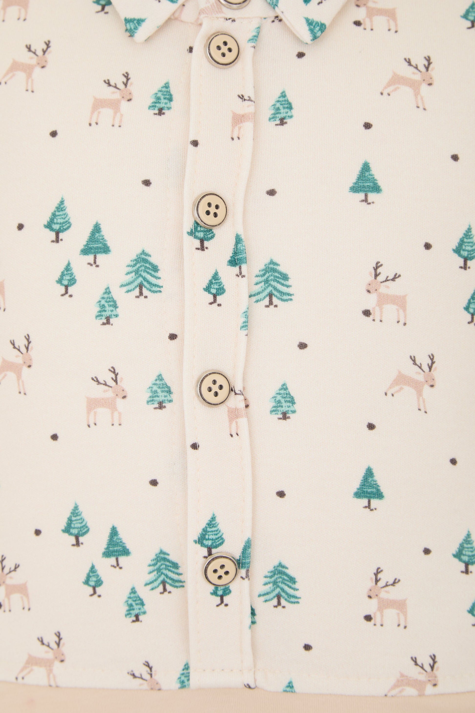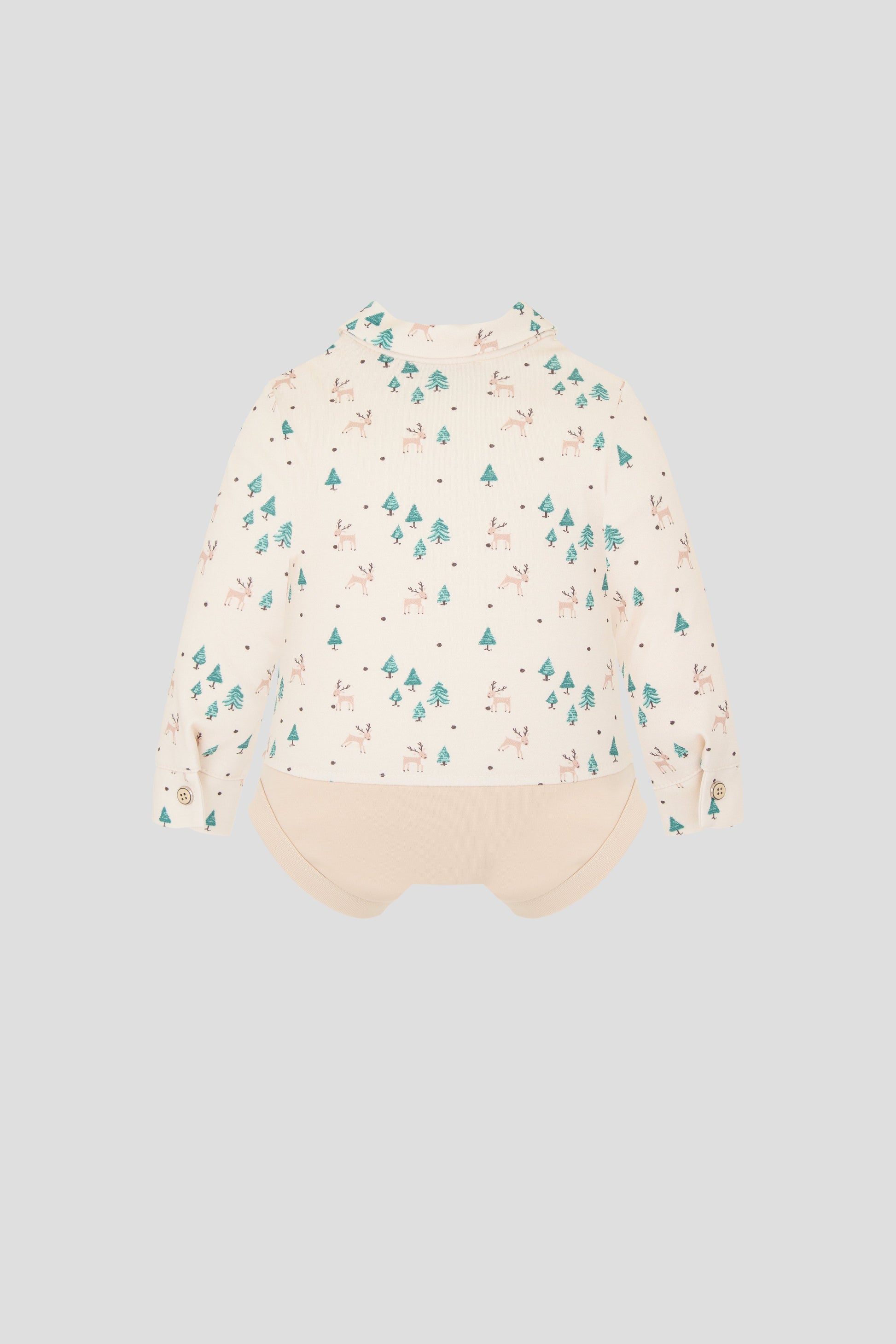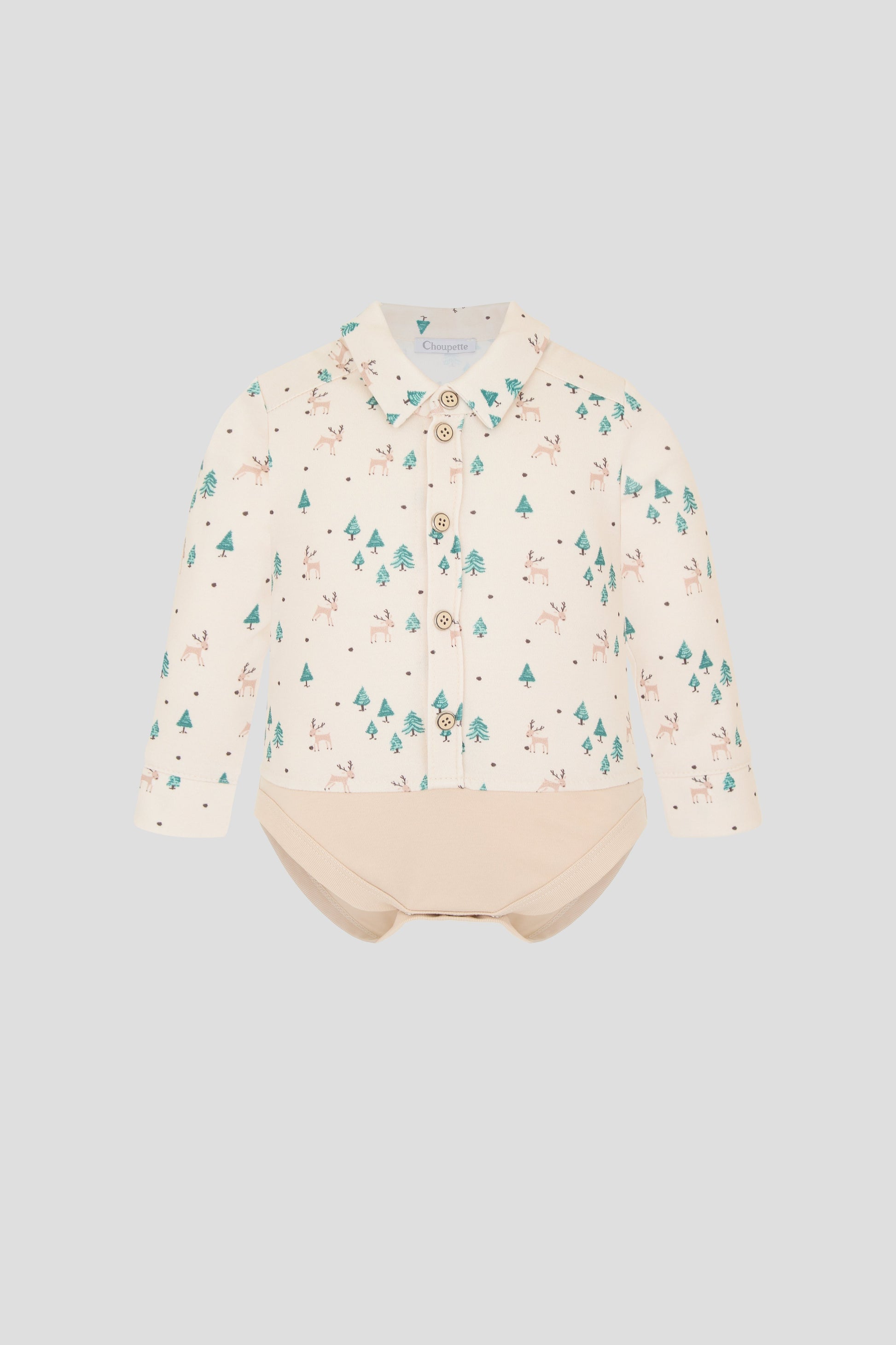 Expertly designed, this AOP bodysuit-shirt in beige offers comfort and style. Made from high-quality fabric, it boasts a unique all-over print and a convenient bodysuit fit. Perfect for any occasion, it effortlessly combines fashion and function.