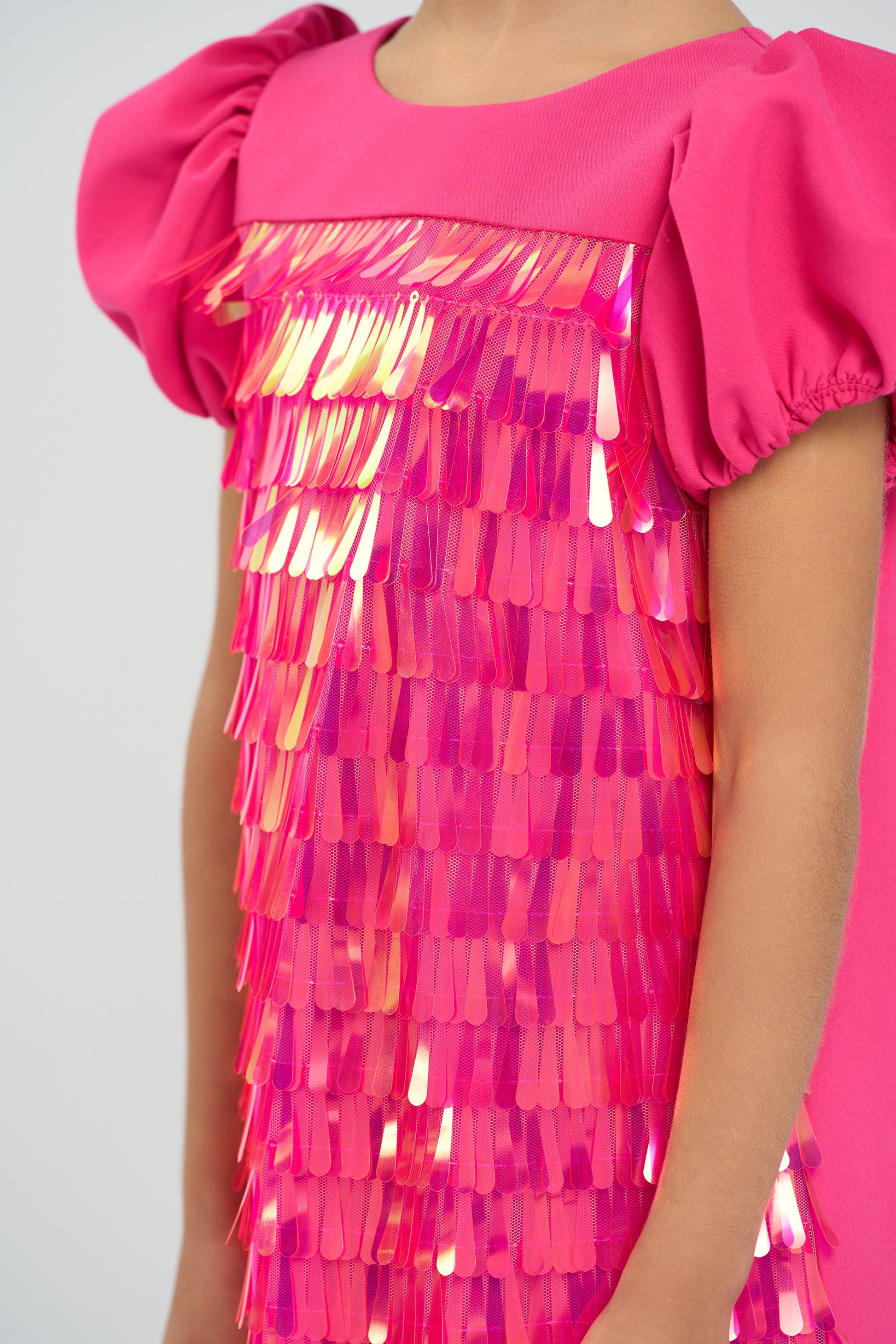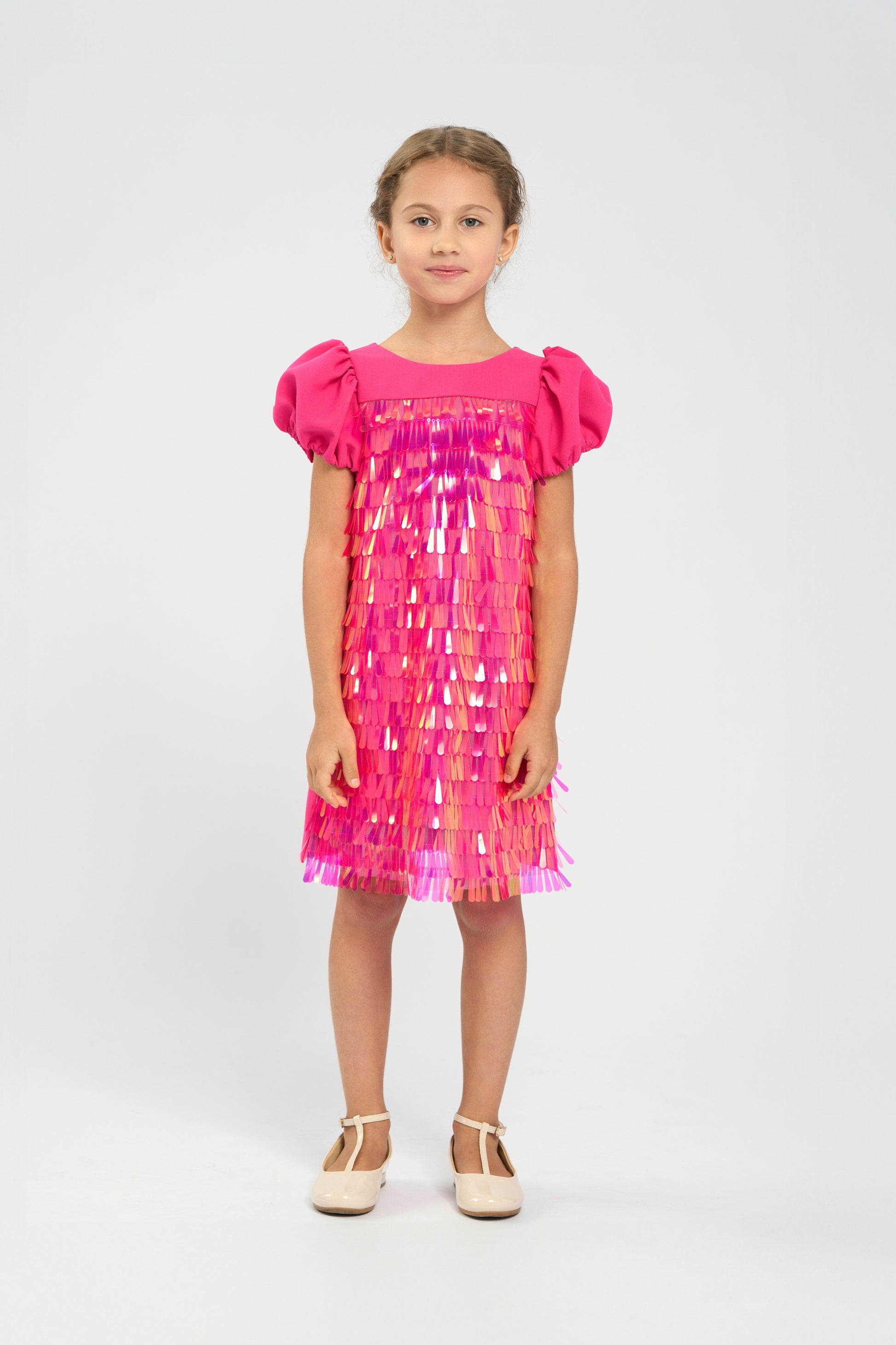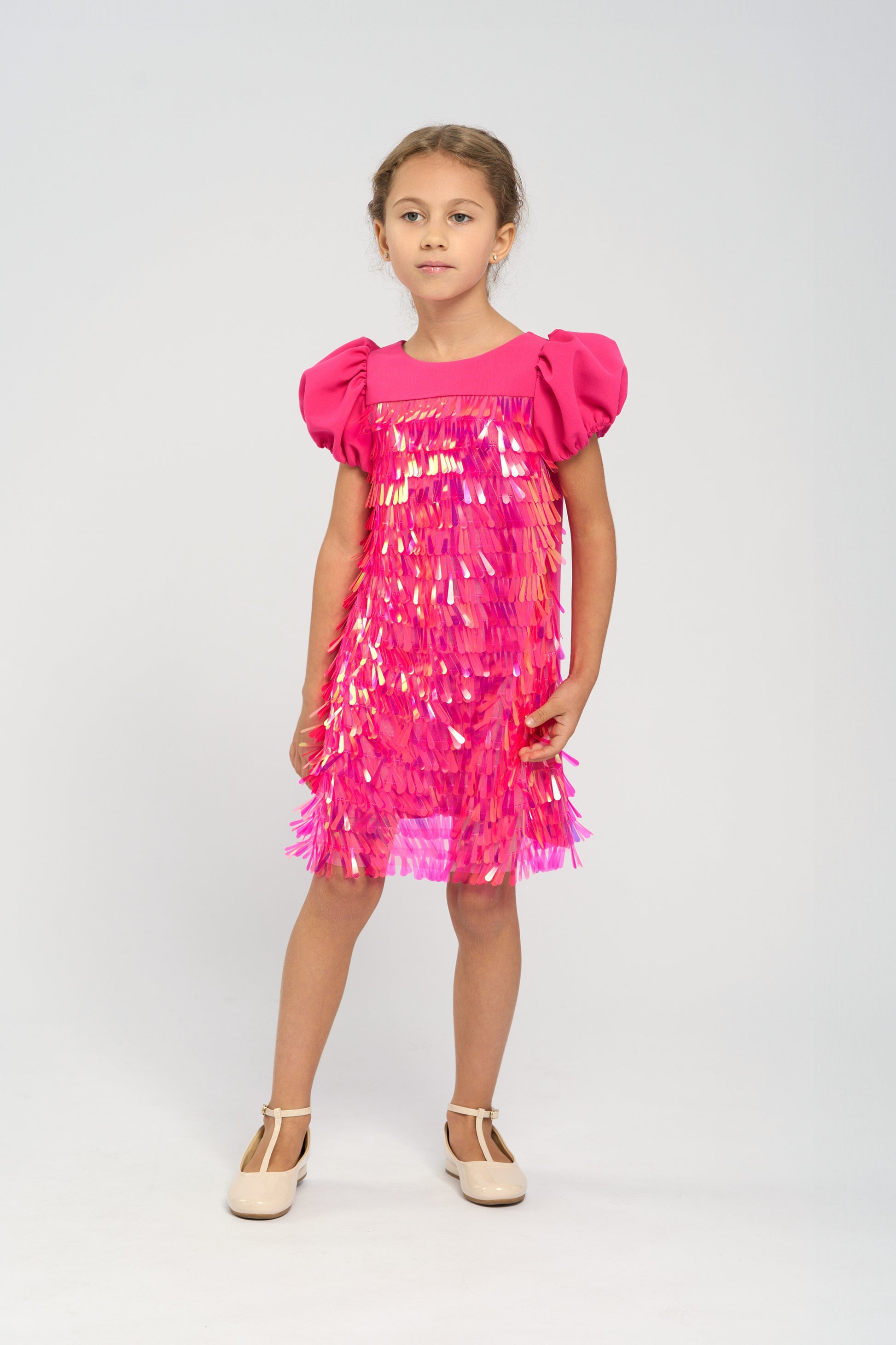 Dress with large long sequins for girls is made in a fashionable bright pink color, which attracts attention and creates a festive mood. Large sequins are evenly distributed over dress, creating a spectacular glamorous shine and play of light, which makes the model especially elegant. Short lantern sleeves add a romantic look to the dress. The dress is fastened with a zipper on the back. The lining made of natural cotton provides comfort for the child.