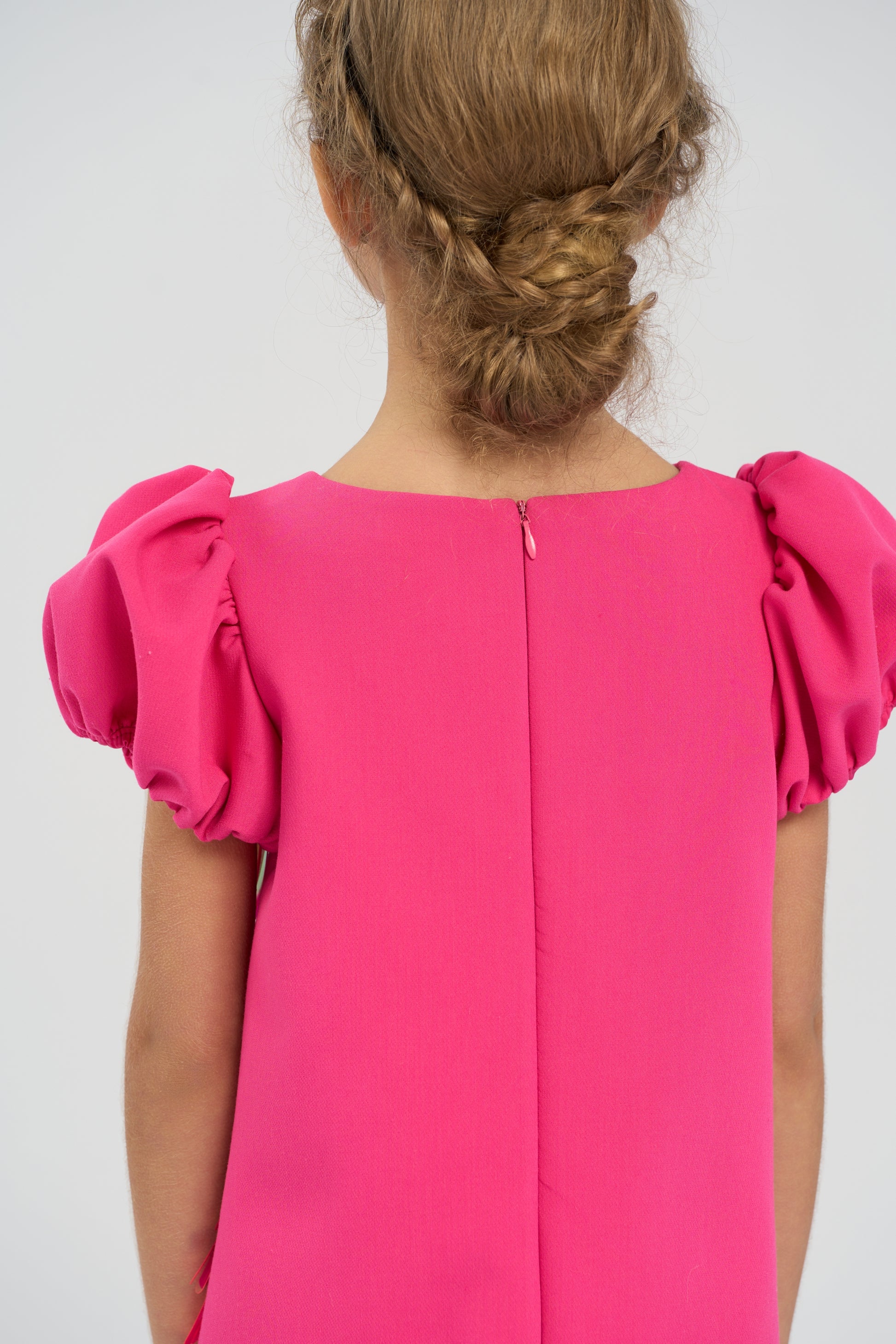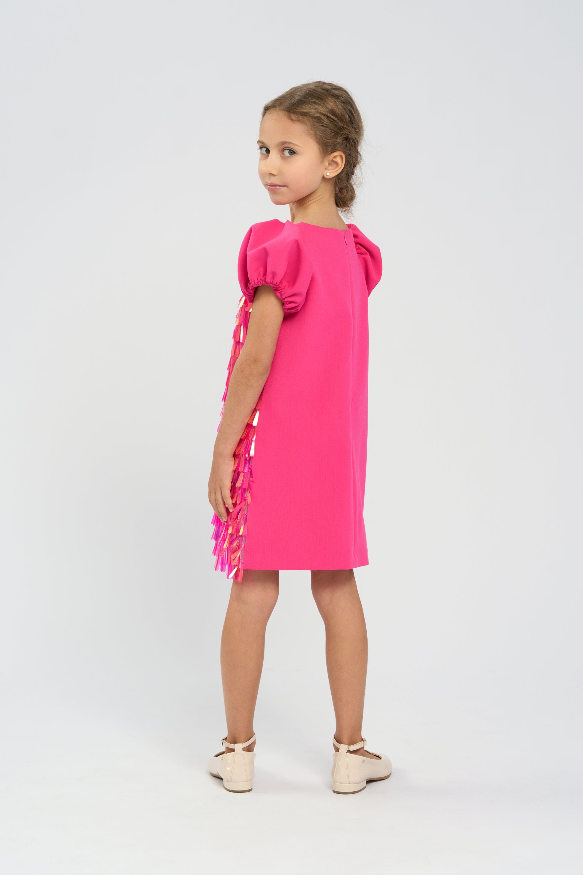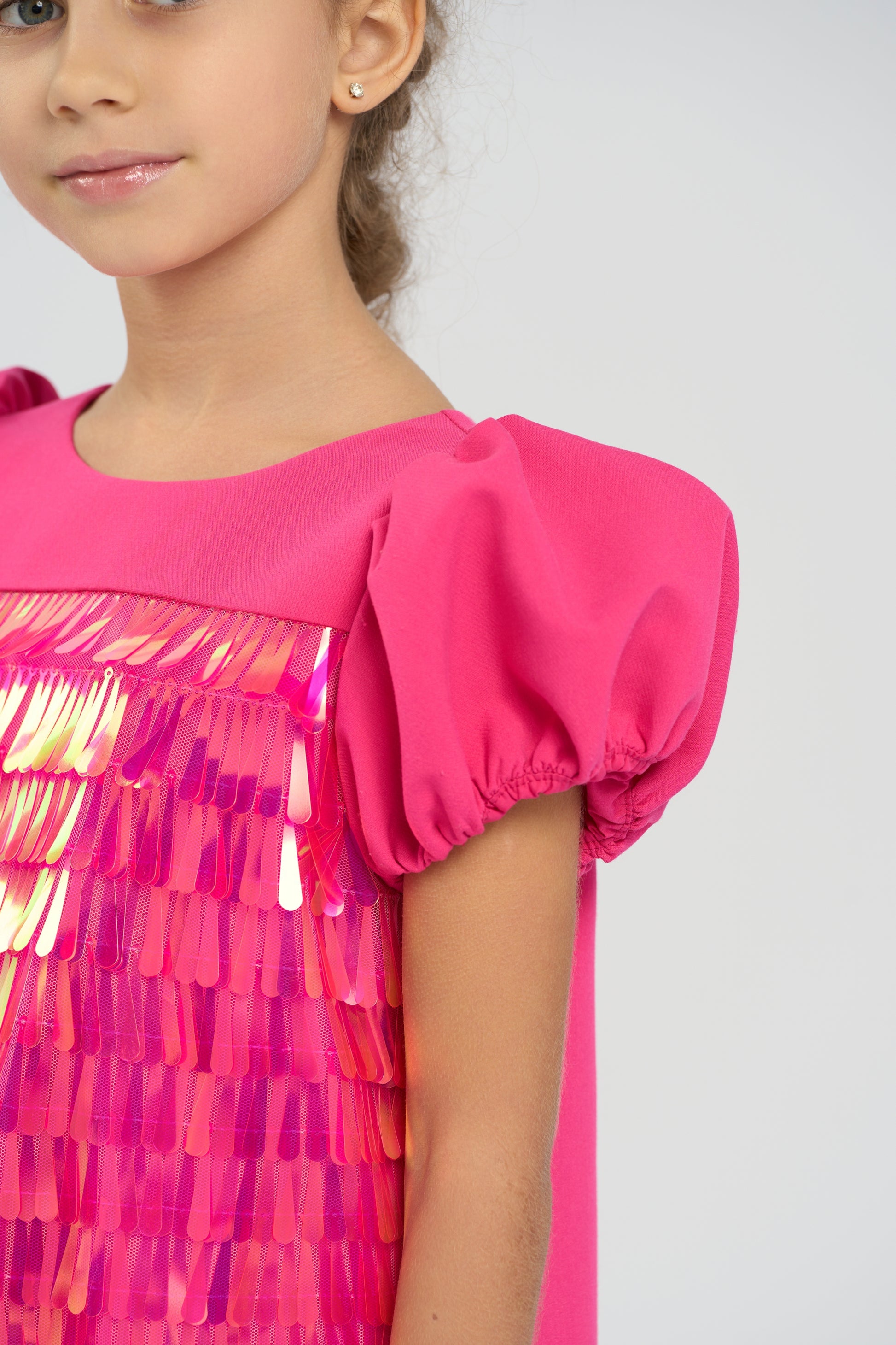 Dress with large long sequins for girls is made in a fashionable bright pink color, which attracts attention and creates a festive mood. Large sequins are evenly distributed over dress, creating a spectacular glamorous shine and play of light, which makes the model especially elegant. Short lantern sleeves add a romantic look to the dress. The dress is fastened with a zipper on the back. The lining made of natural cotton provides comfort for the child.