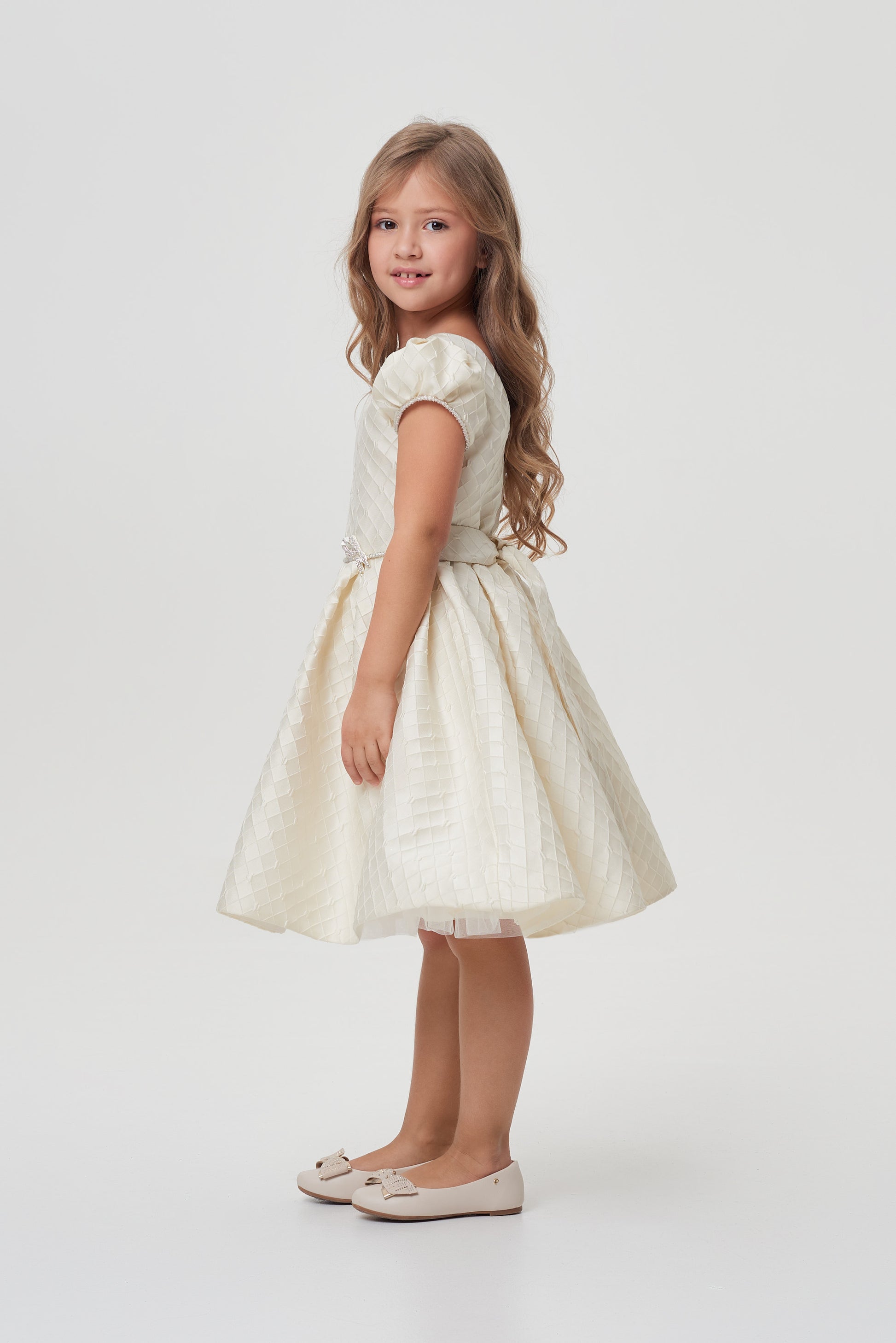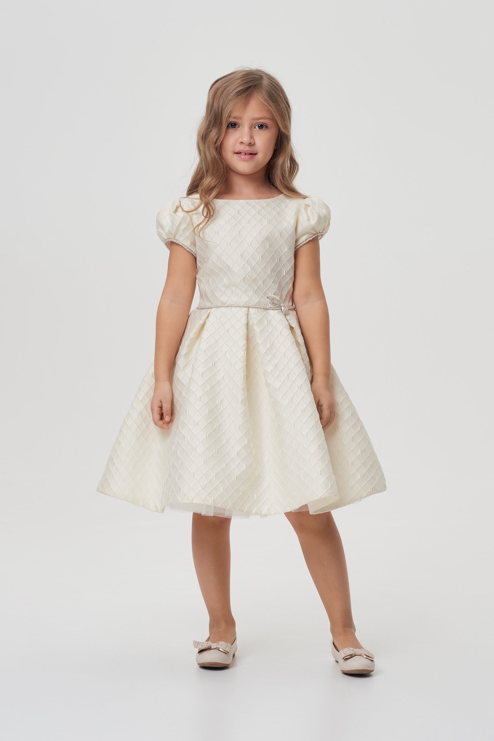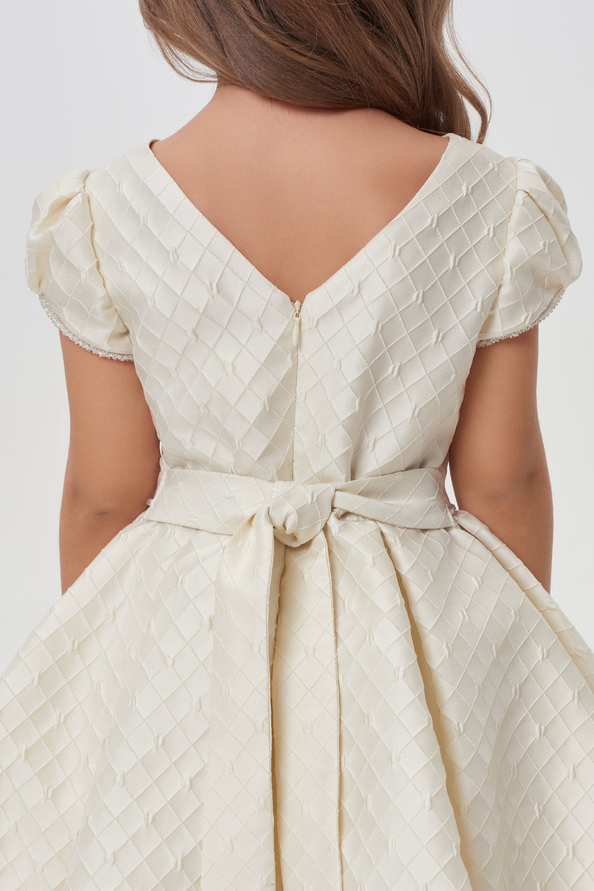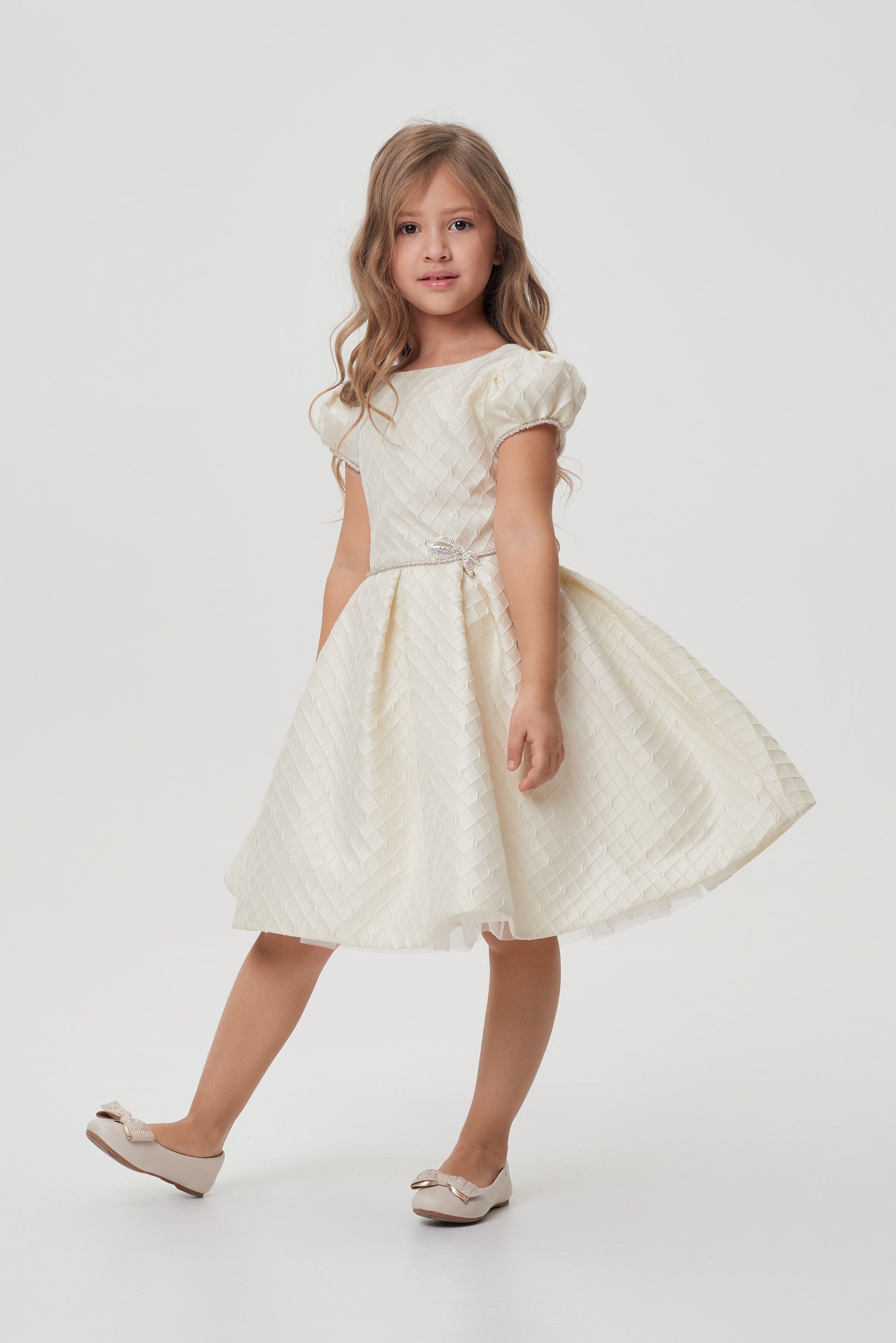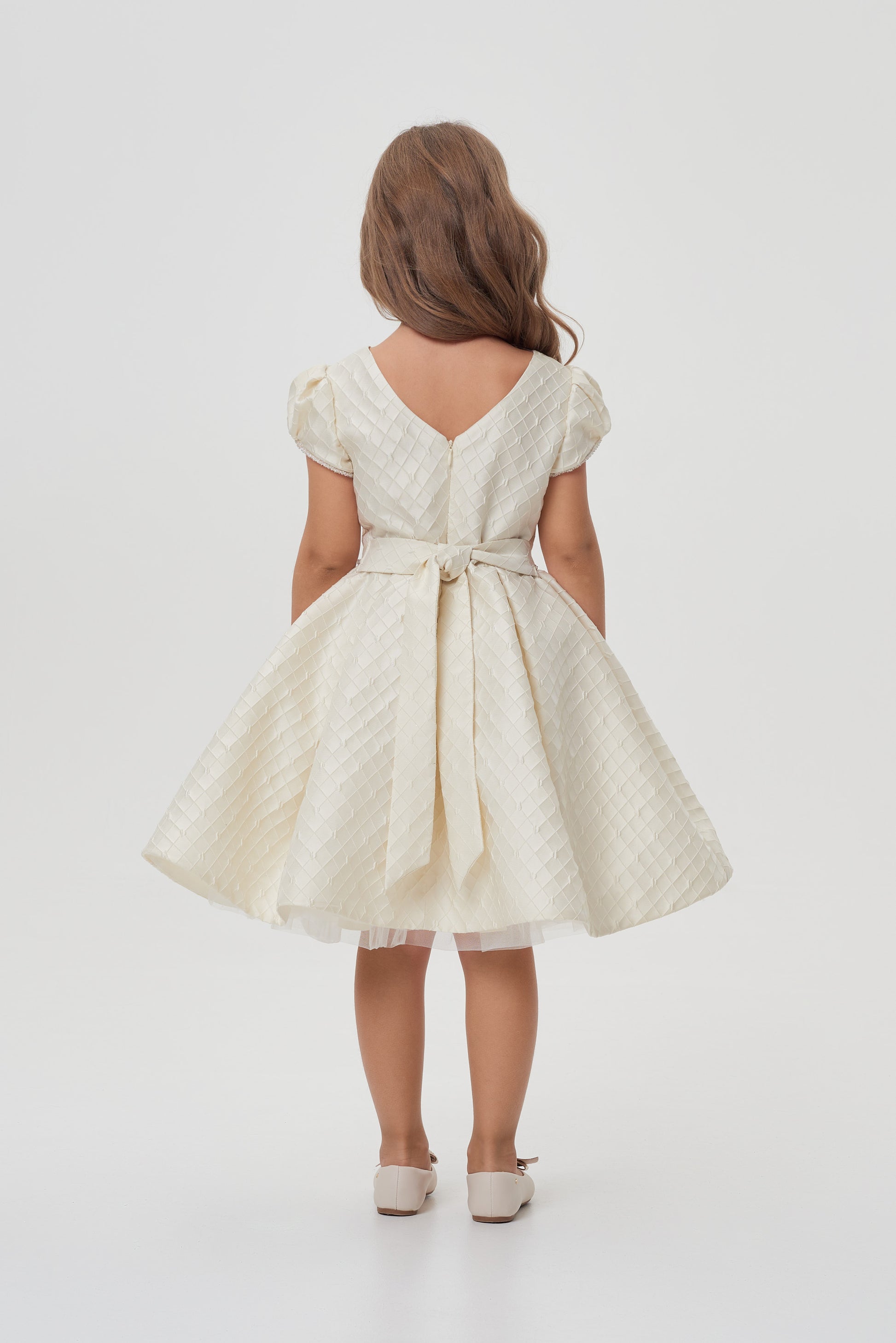 This half sleeve quilted dress for girl boasts a cream colour that is both stylish and versatile. The quilted design provides comfort, making it perfect for any occasion. Crafted with quality materials, this dress ensures long-lasting wear for your little fashionista.