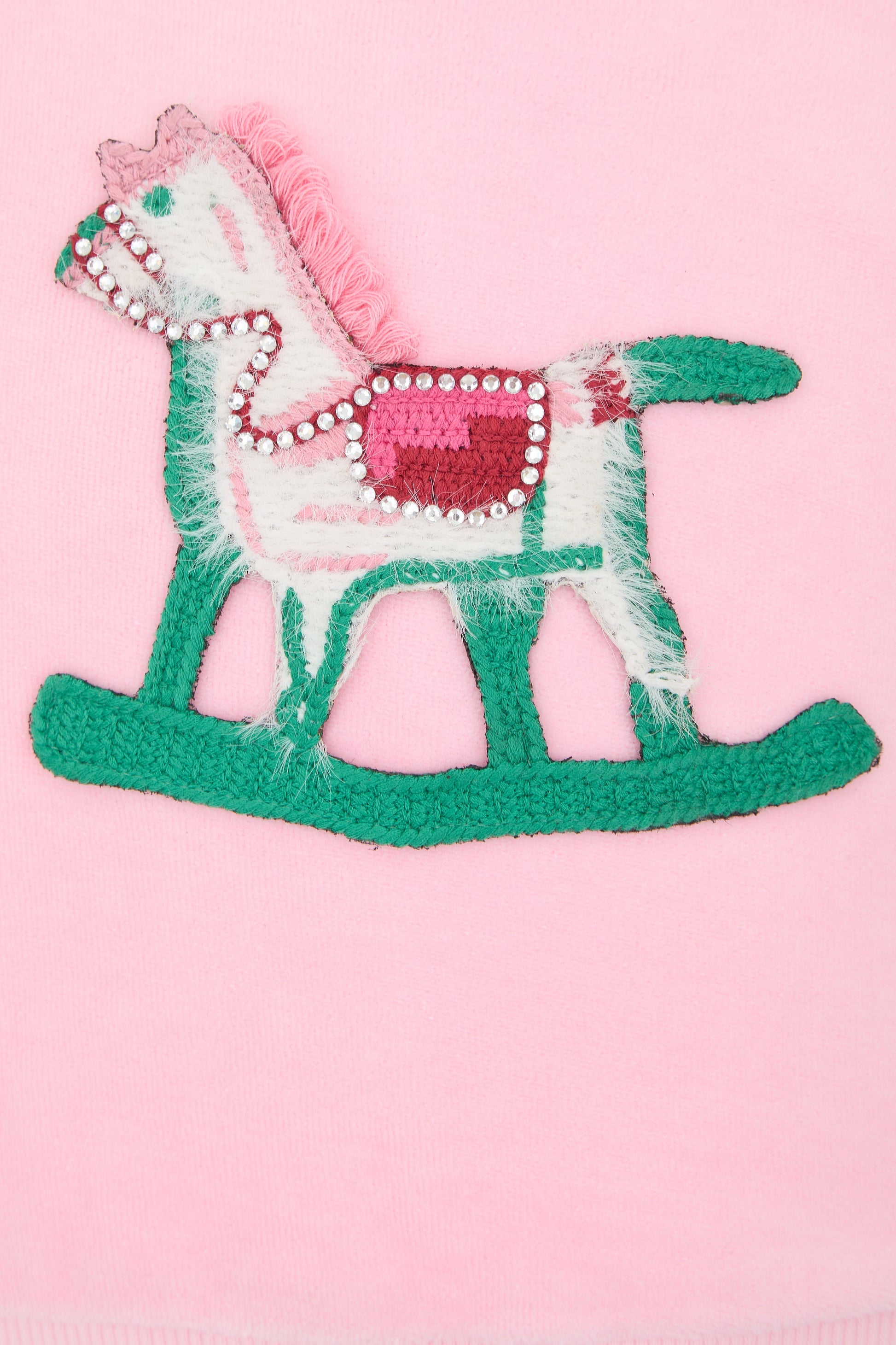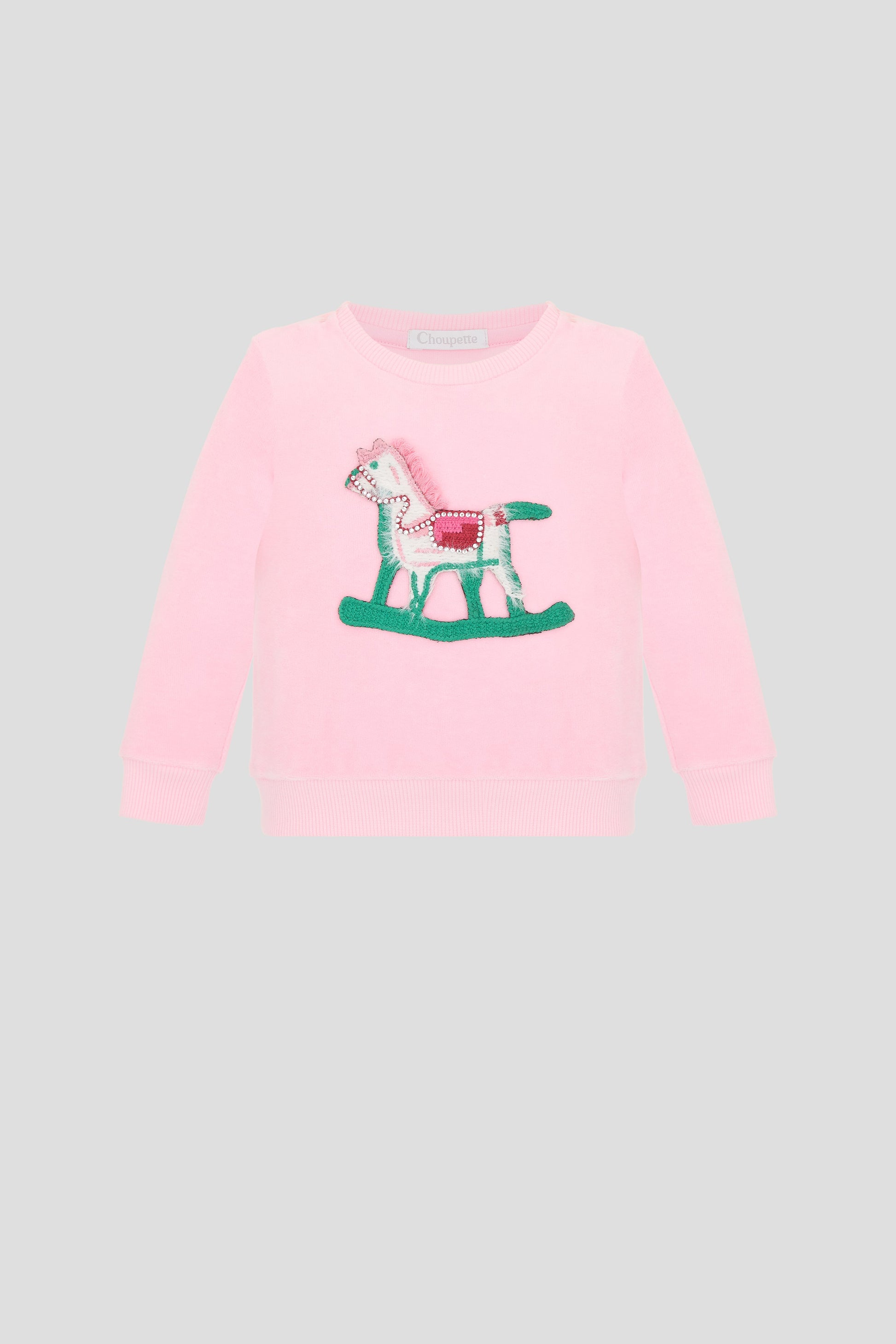 This pink velour sweater is a must-have for your baby girl's wardrobe. The handmade horse applique adds a touch of charm and uniqueness to the design. Made from soft 100% cotton, it provides comfort and warmth for your little one. A perfect combination of style and functionality.