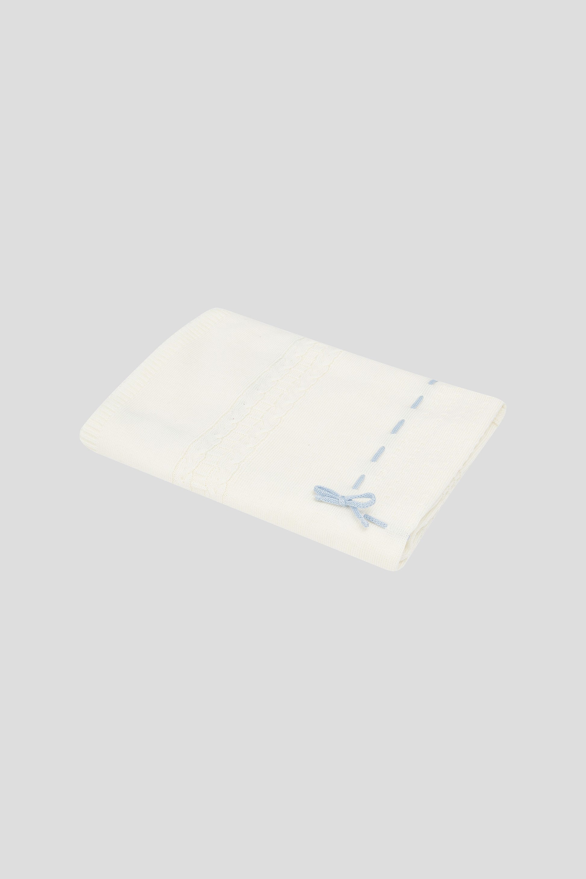 Introducing our Knitted Blanket for Boys, designed for both discharge from the maternity hospital and stroller walks. Made with soft, natural cotton, it provides warmth and comfort for sensitive baby skin. The elegant cream with light grey/blue lace embroidery adds a luxurious touch, perfect for cool weather.