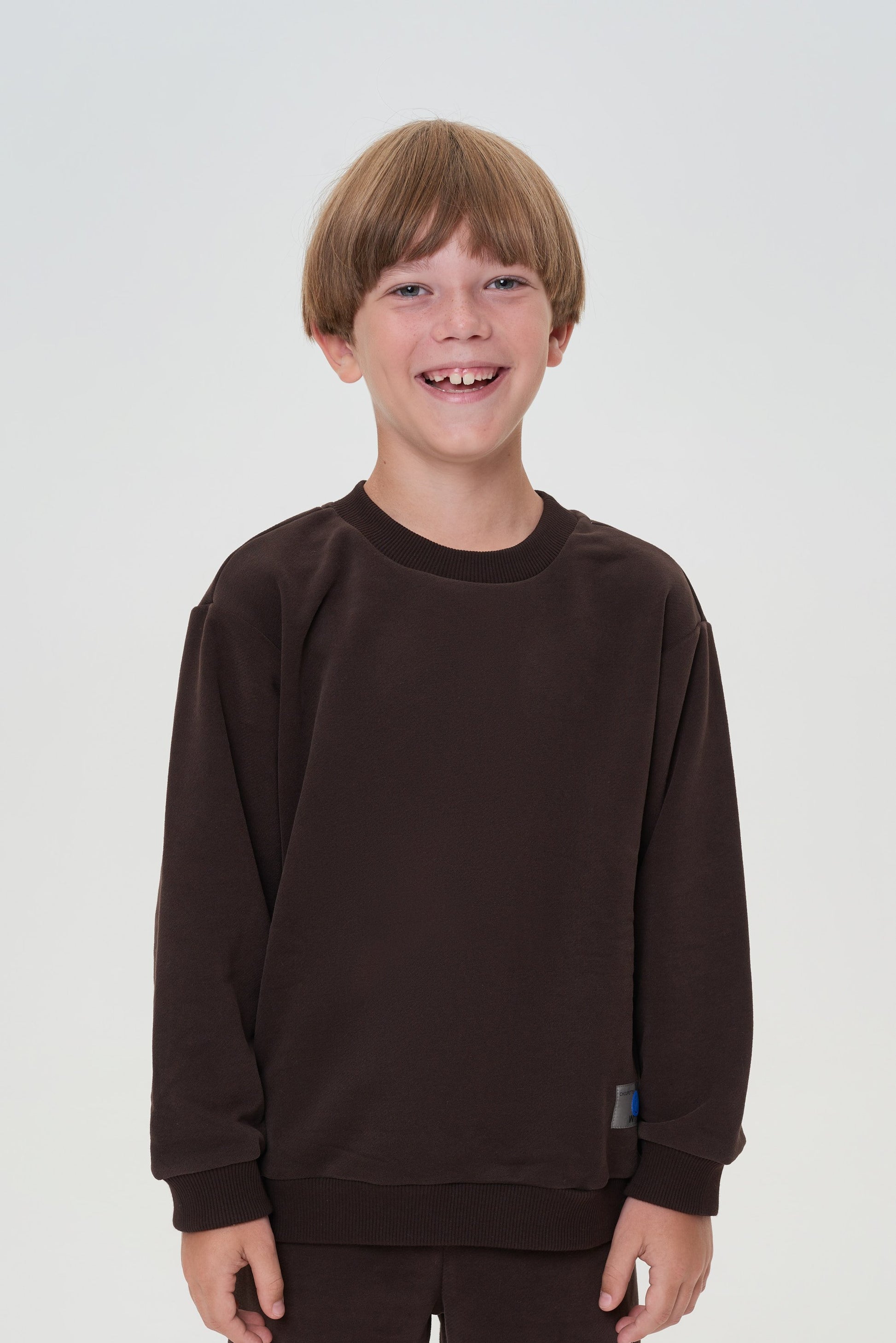 A modern teenager's wardrobe should have a sufficient variety of items for diverse outfits. This preppy-style model for boys, an elegant sweatshirt made from bitter chocolate-colored cotton knitwear, is a fantastic choice. How to wear such a sweater? To create an impressive layered look, consider pairing it with a vibrant or patterned shirt, allowing the collar, sleeves, and hem to peek through.