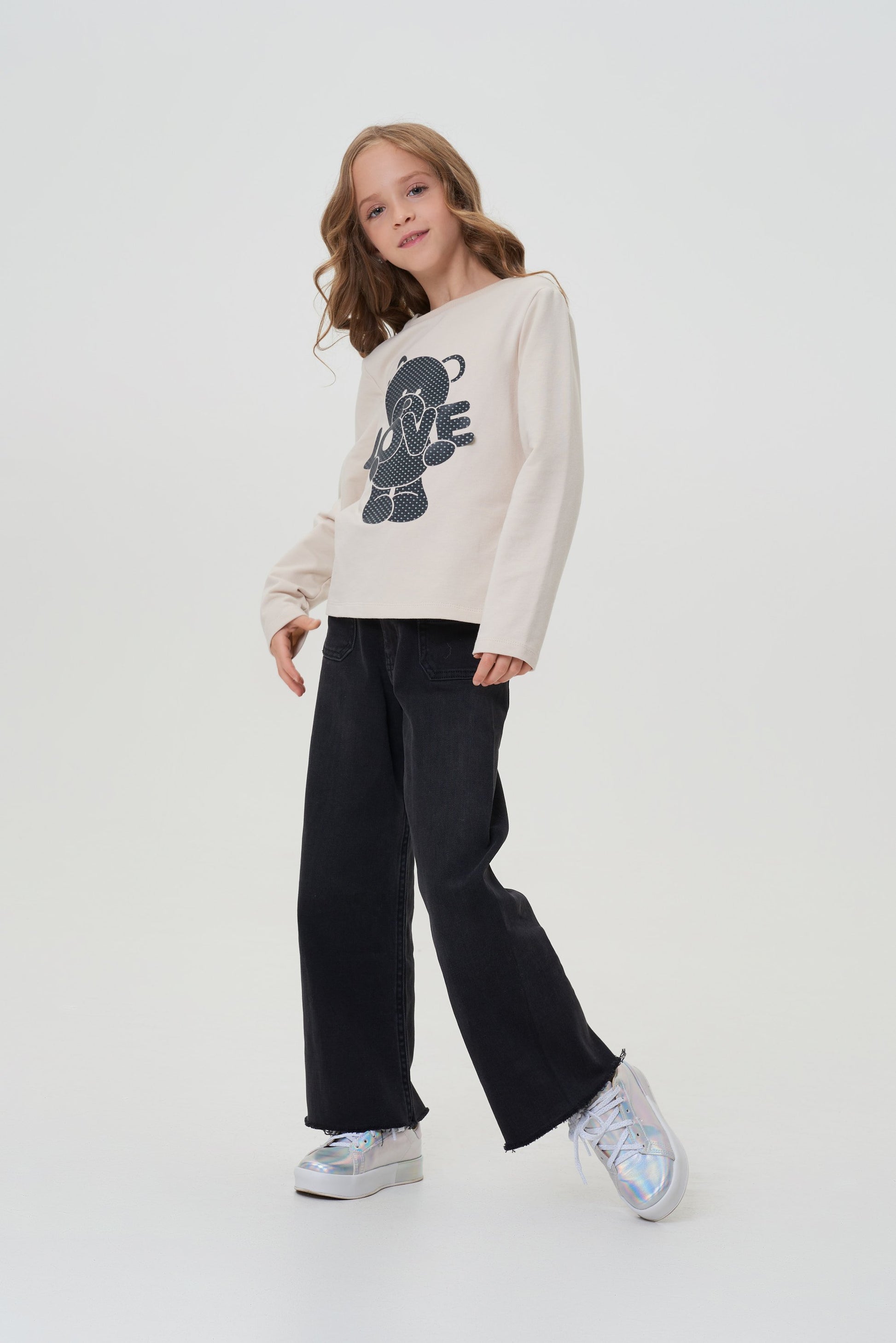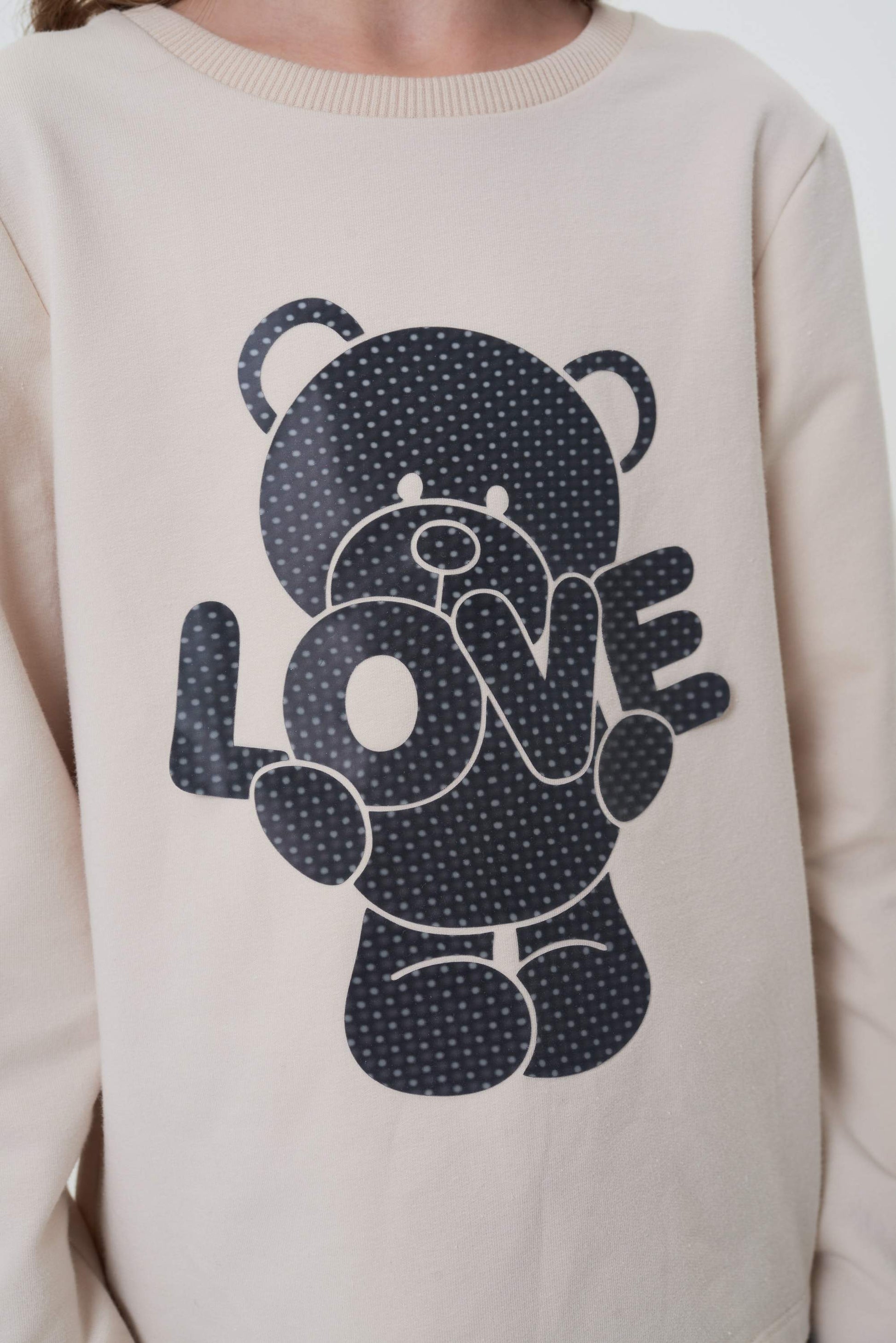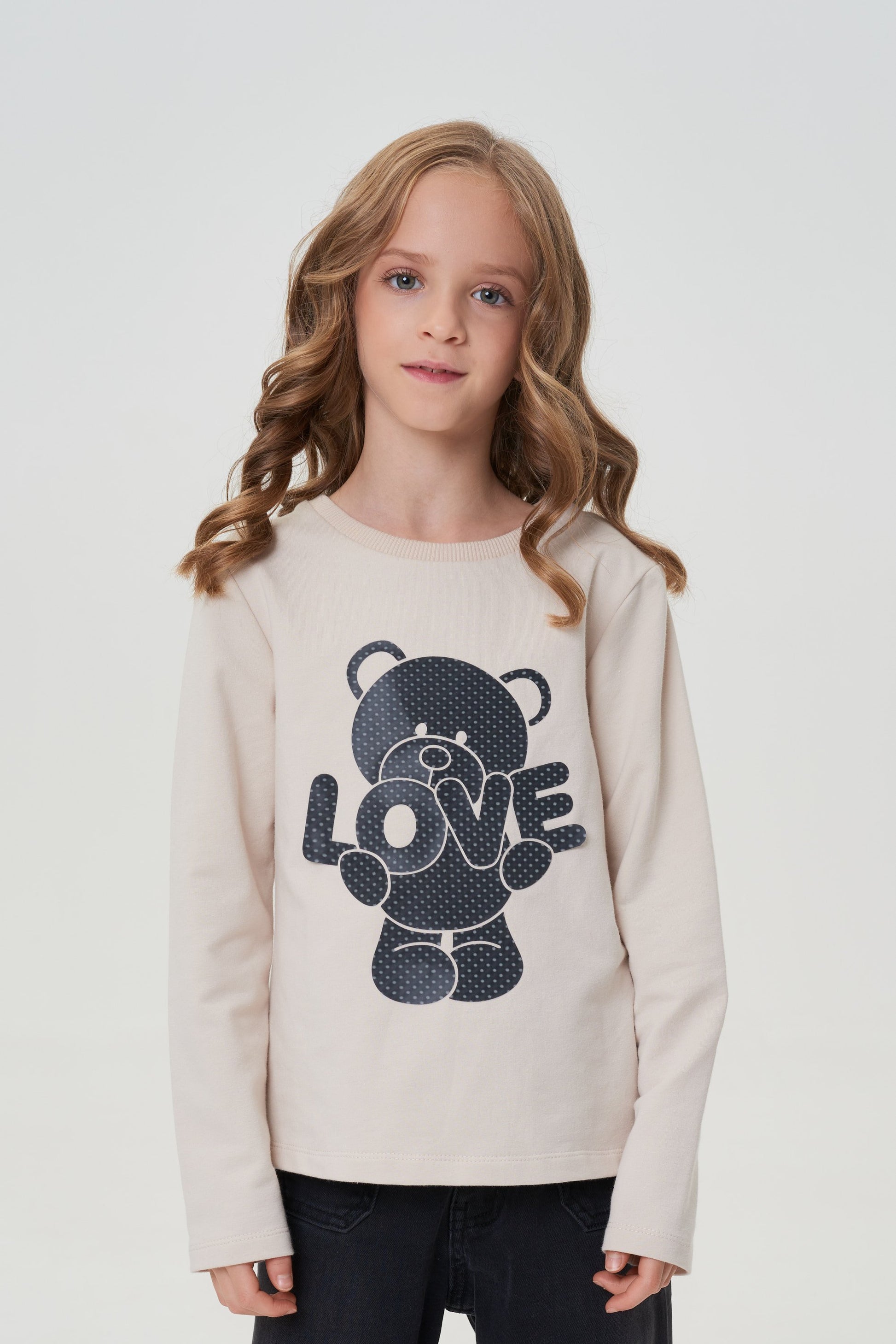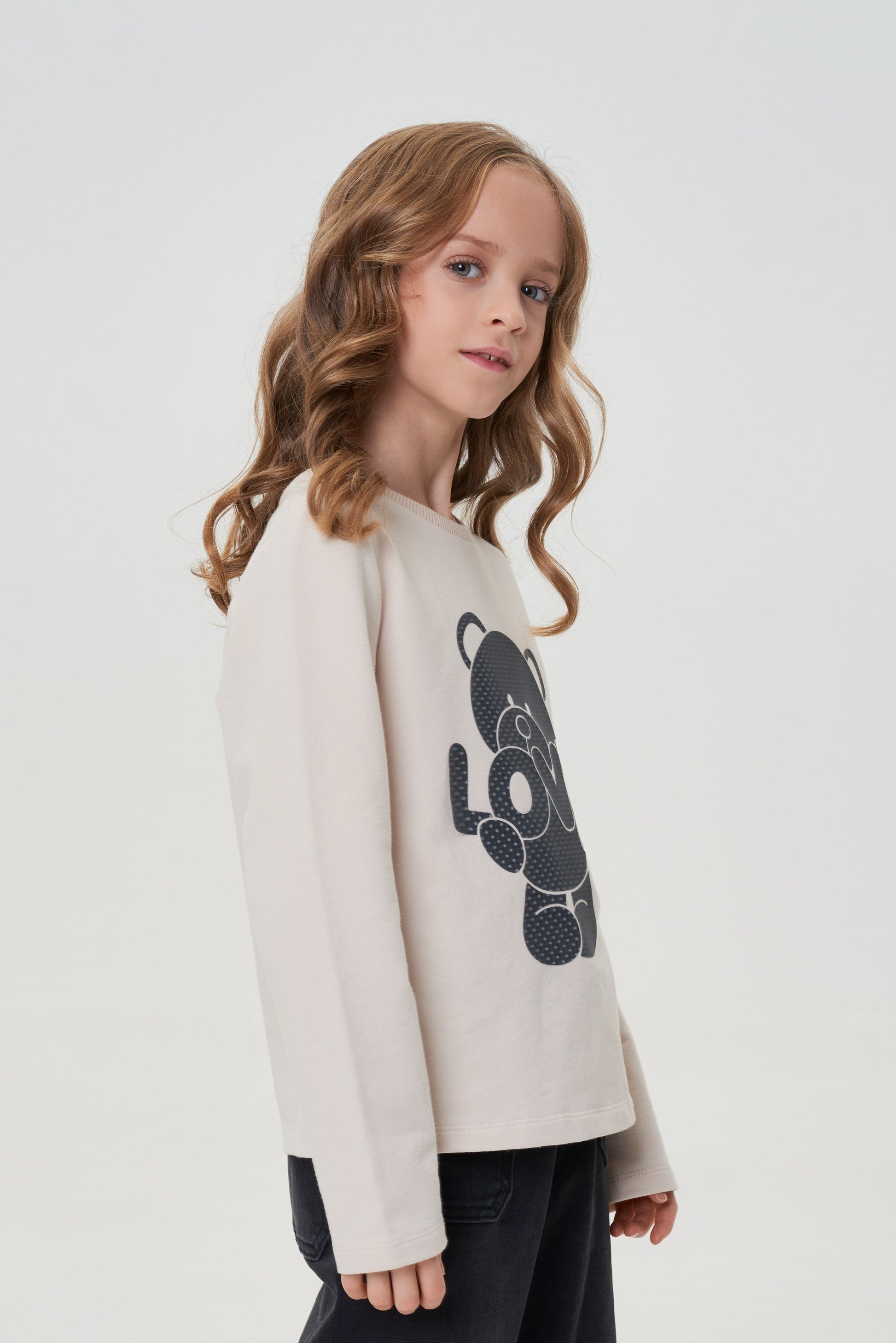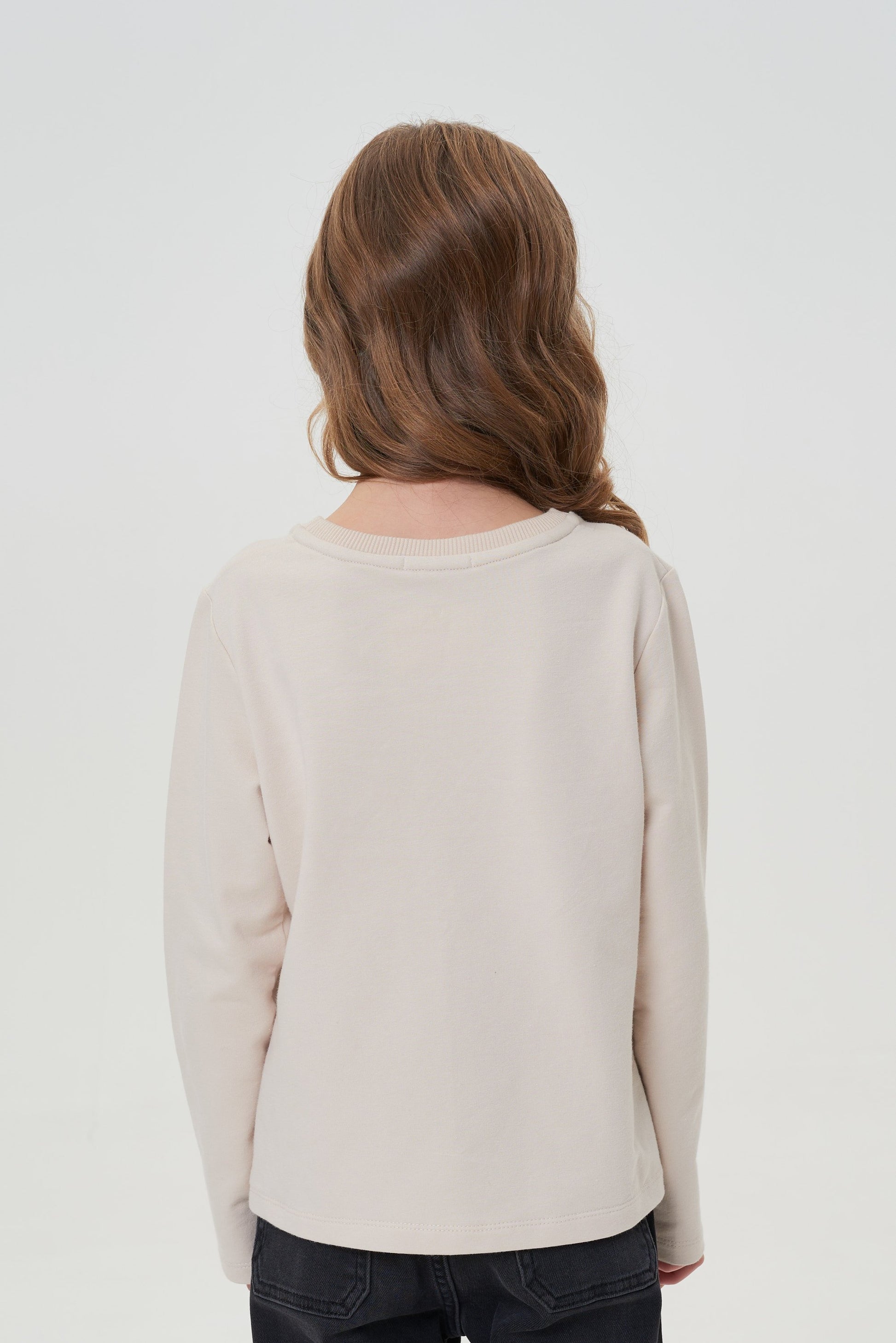 A great choice for cool days! This item will delight friends; the charming loose-fitting model allows for creating bright, original looks. The beige jumper with long sleeves looks very cute, providing comfort and style for a teenage girl. Clothing with fun prints helps teenagers express themselves freely. The long-sleeve is made from high-quality knit fabric based on cotton.