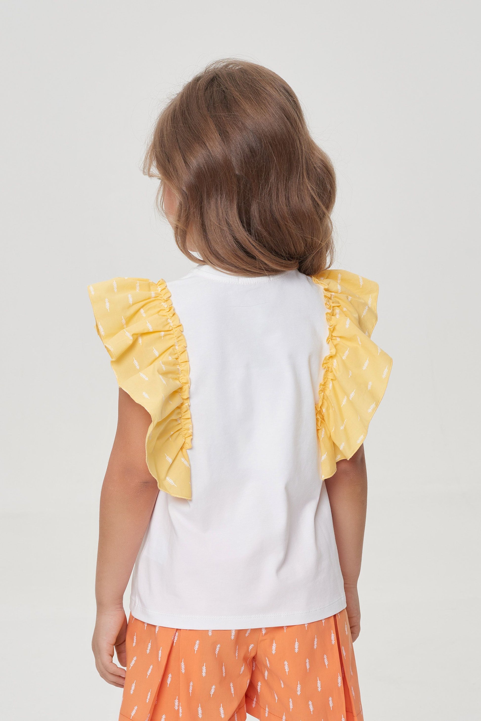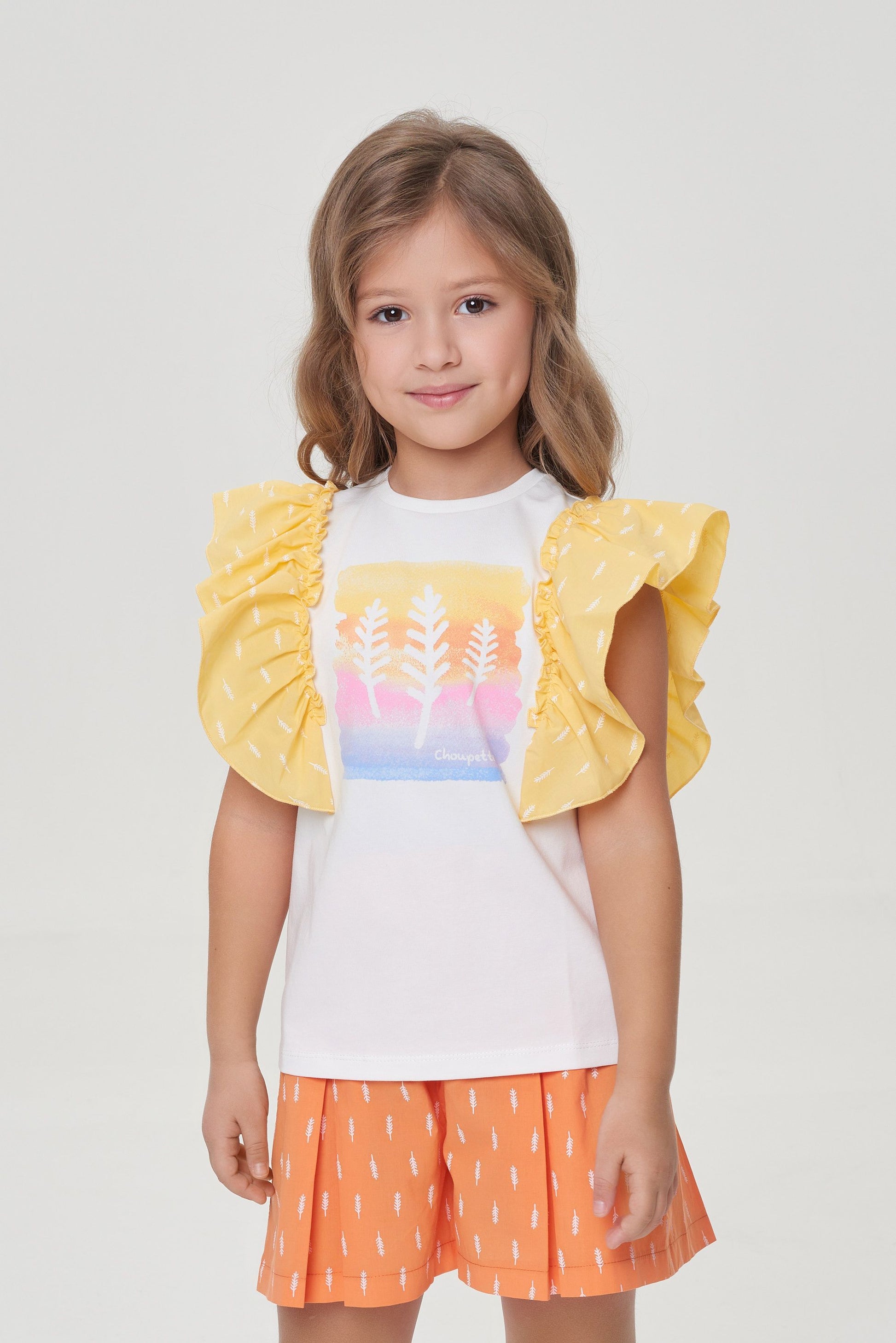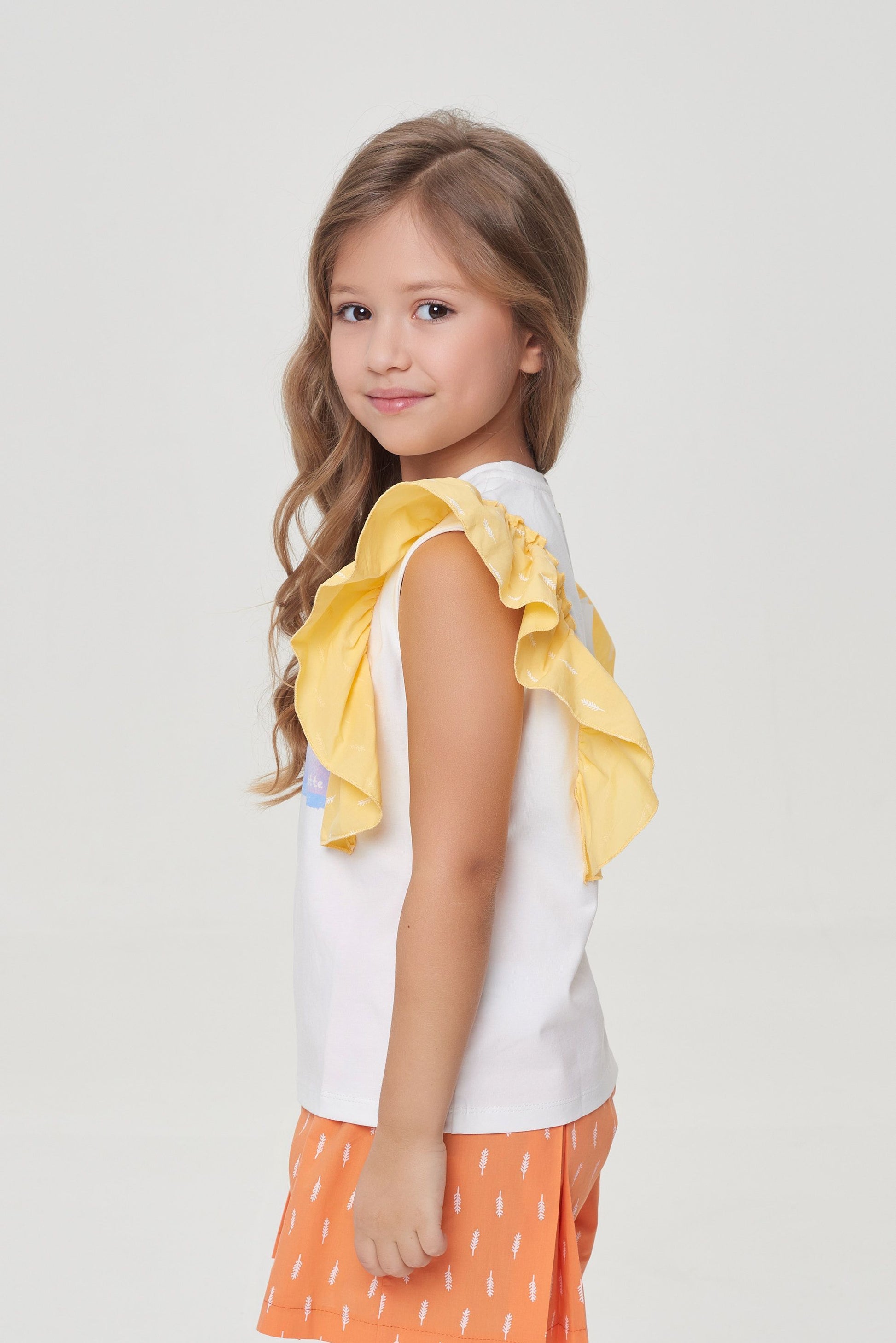 -A fashionable blouse with sewing is made in the actual color of the ecru. Lush Kryllya sleeves give the design a romantic note. Model of a comfortable direct silhouette. A print in the center in the form of a girl with her hair loose and a wreath of bright colors will appeal to every girl. Natural fabric is pleasant to the body, has high hygienic properties, which is especially important for delicate children's skin
