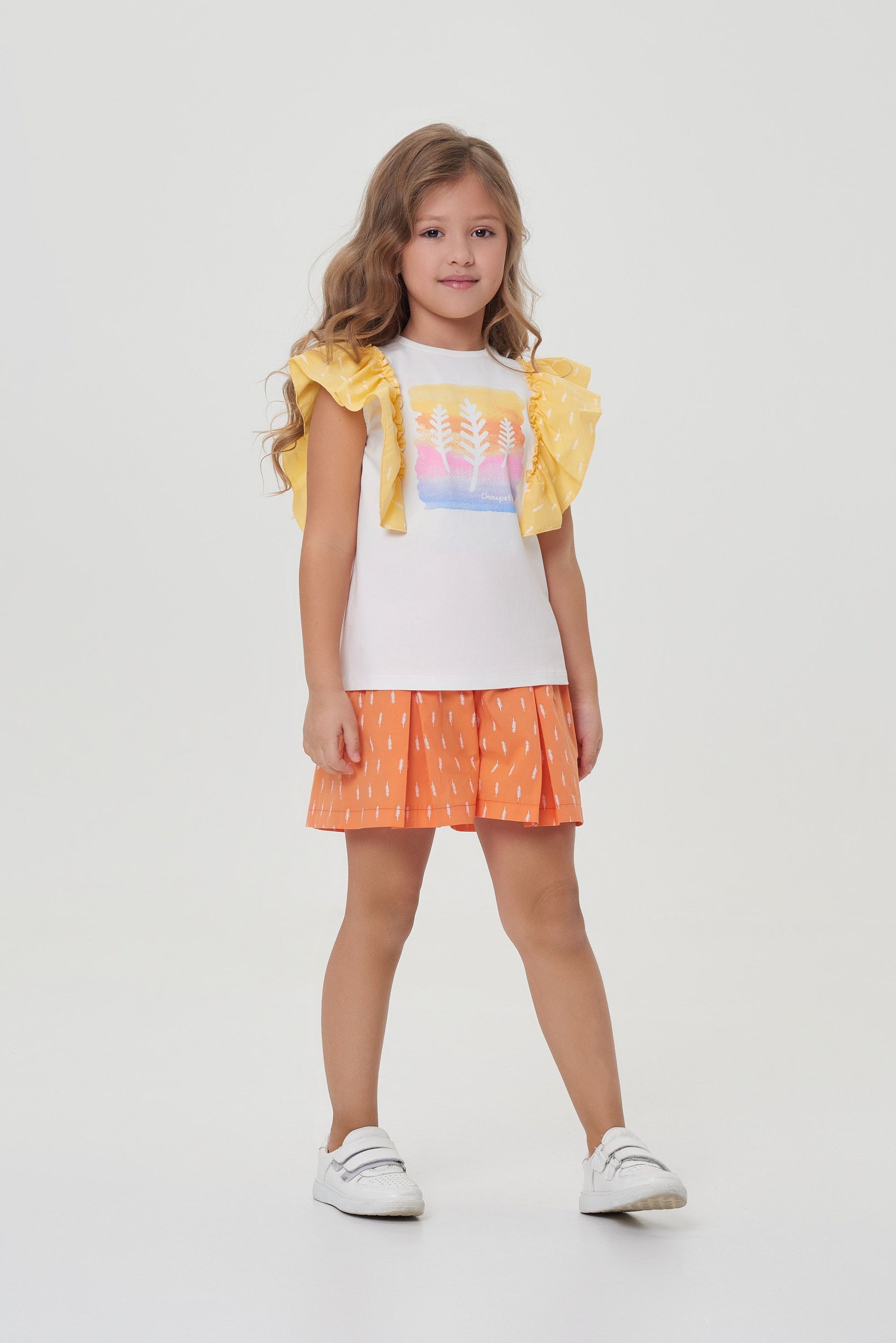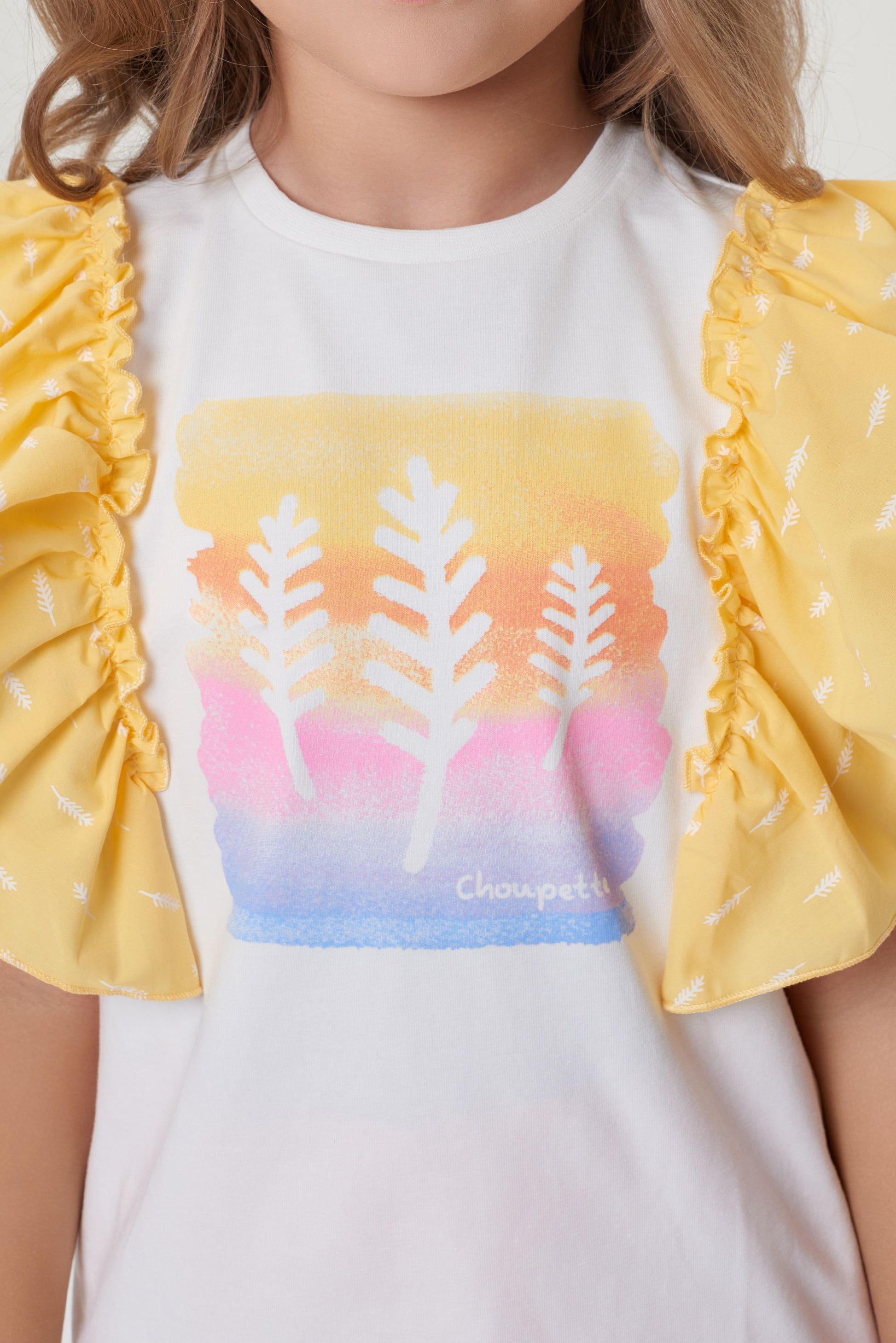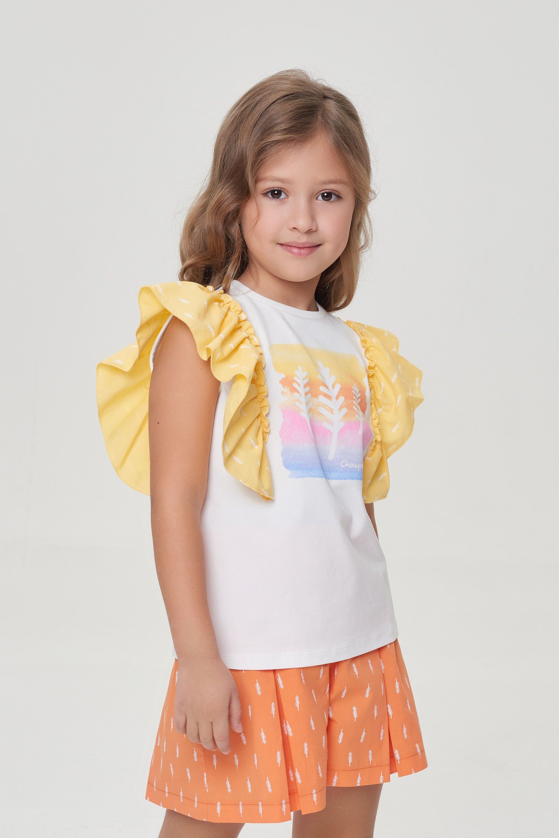 -A fashionable blouse with sewing is made in the actual color of the ecru. Lush Kryllya sleeves give the design a romantic note. Model of a comfortable direct silhouette. A print in the center in the form of a girl with her hair loose and a wreath of bright colors will appeal to every girl. Natural fabric is pleasant to the body, has high hygienic properties, which is especially important for delicate children's skin