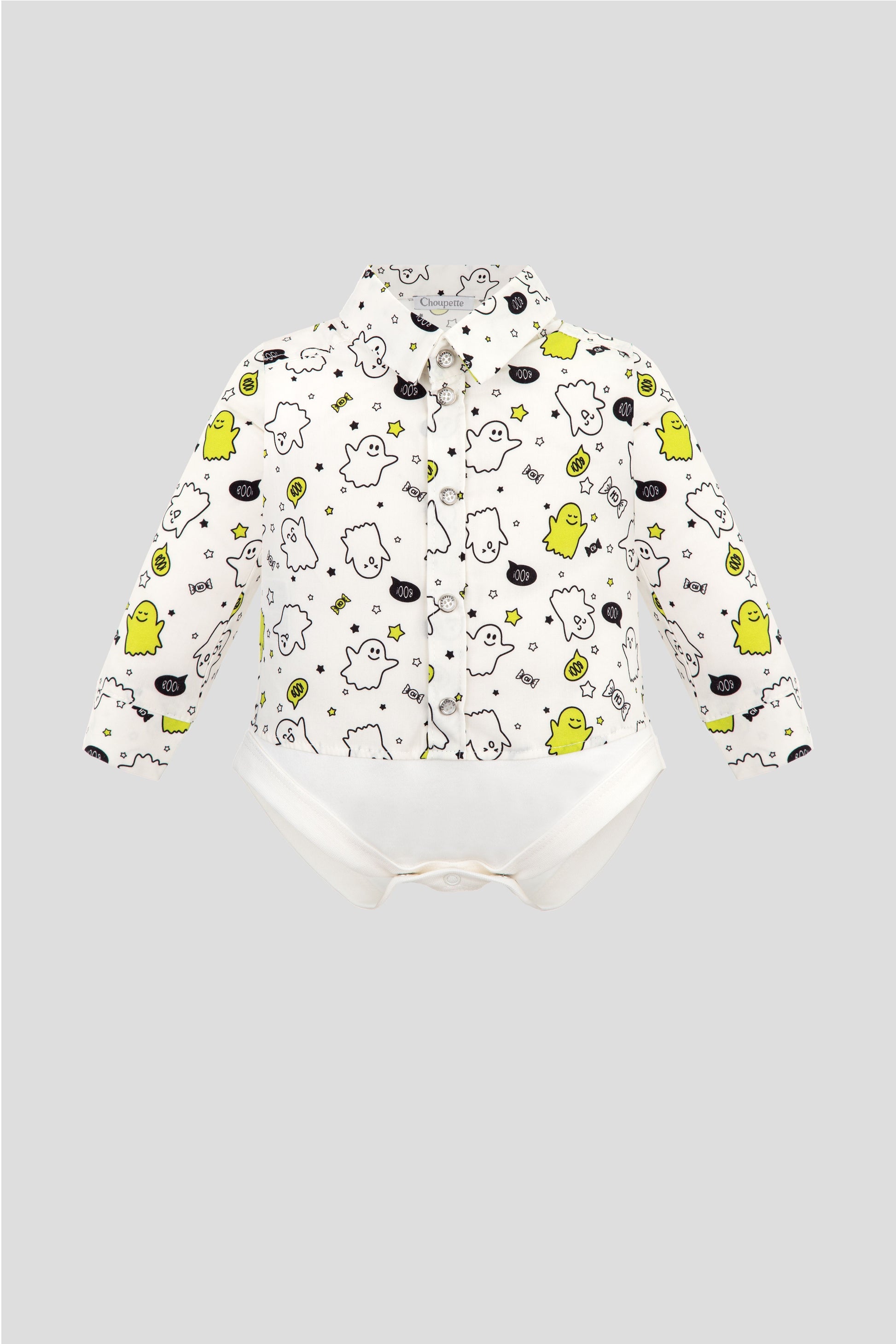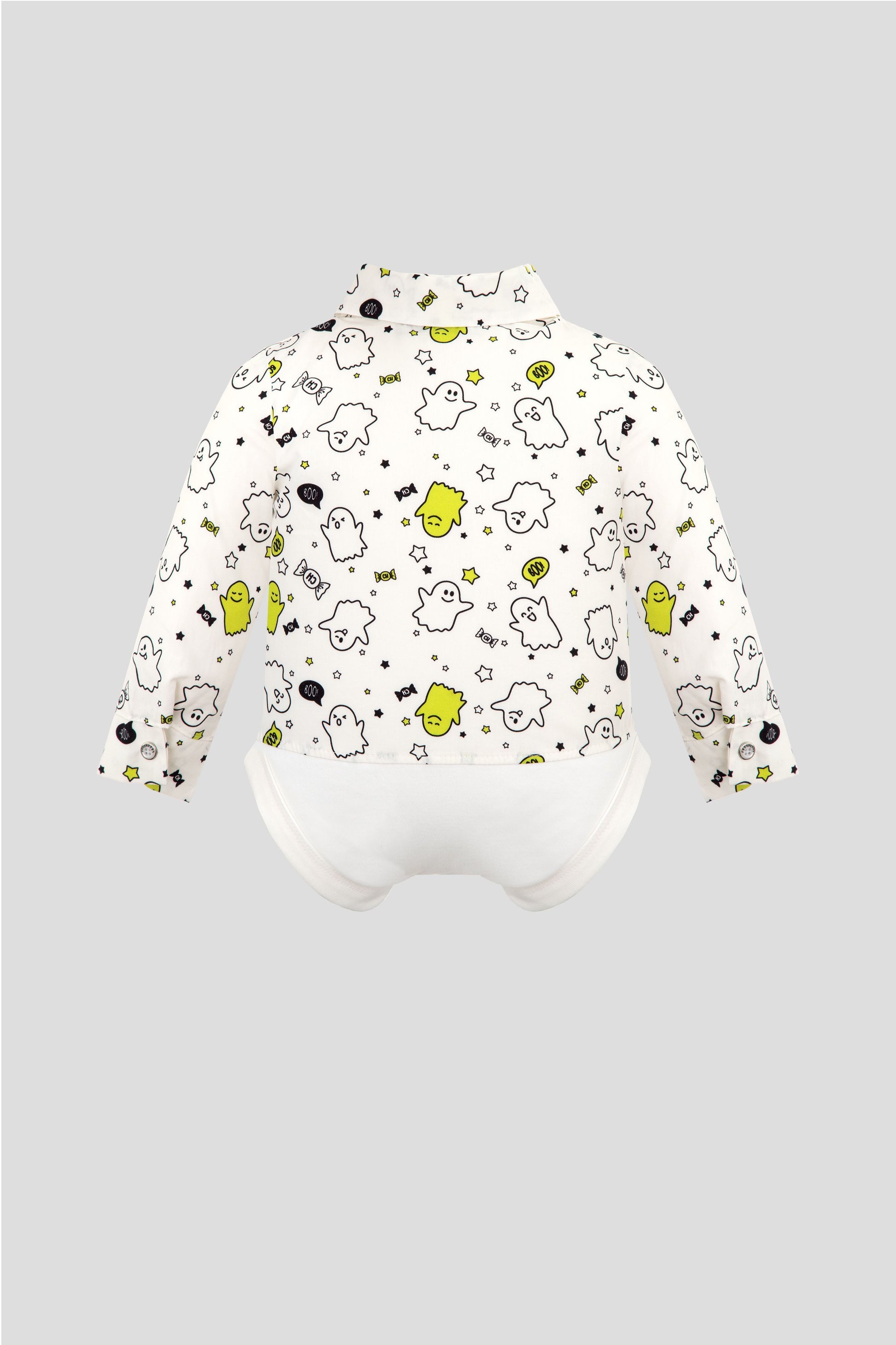 An elegant bodysuit for a boy has a festive look, such shirt is combined with any jackets and trousers. The fastener at the bottom of the product will allow to change the diaper easily, and the upper part with a classic collar will create an elegant image on any occasion. The model is made of 100% cotton will all over branded print of Phantom Collection for babies.