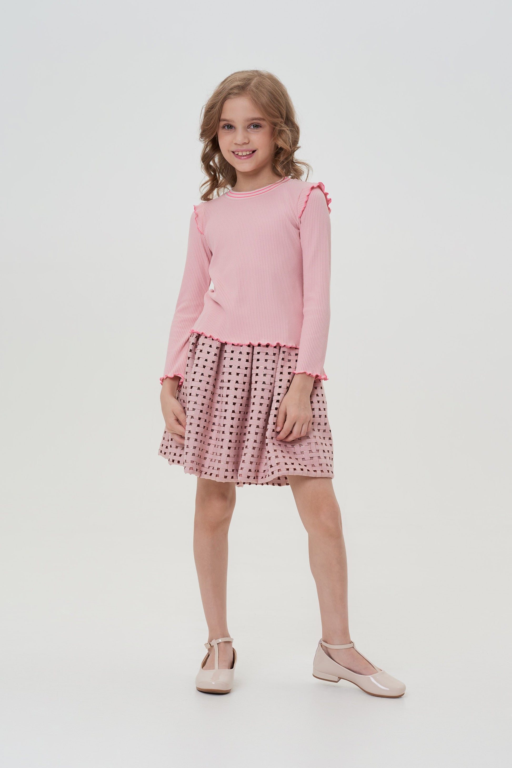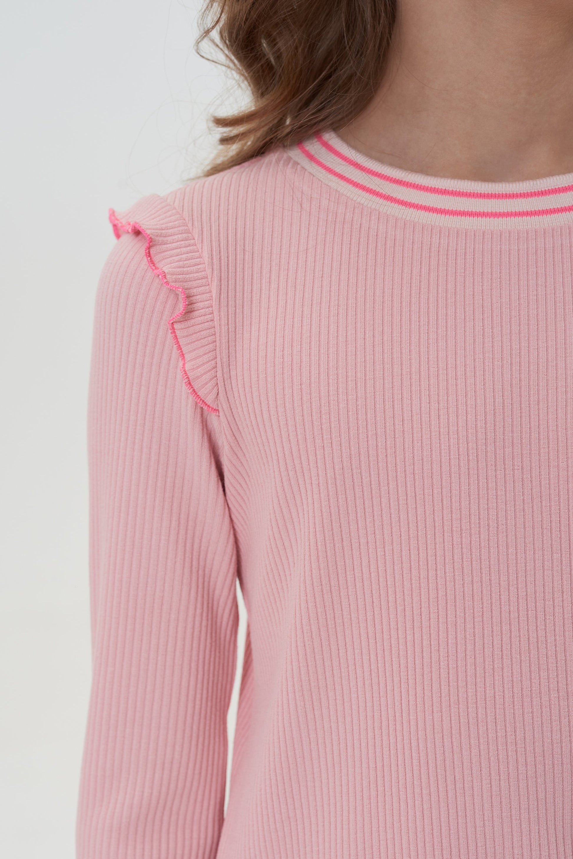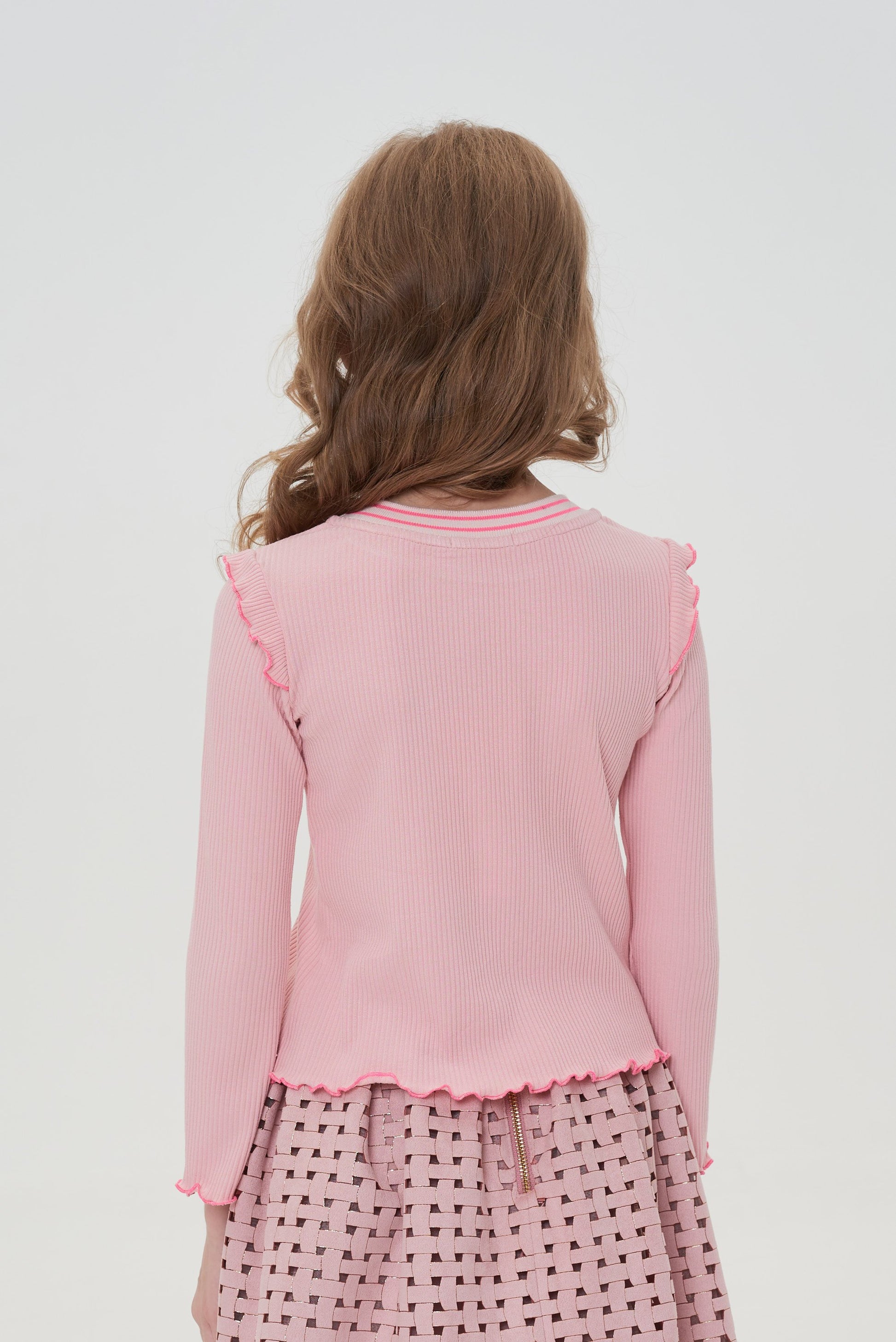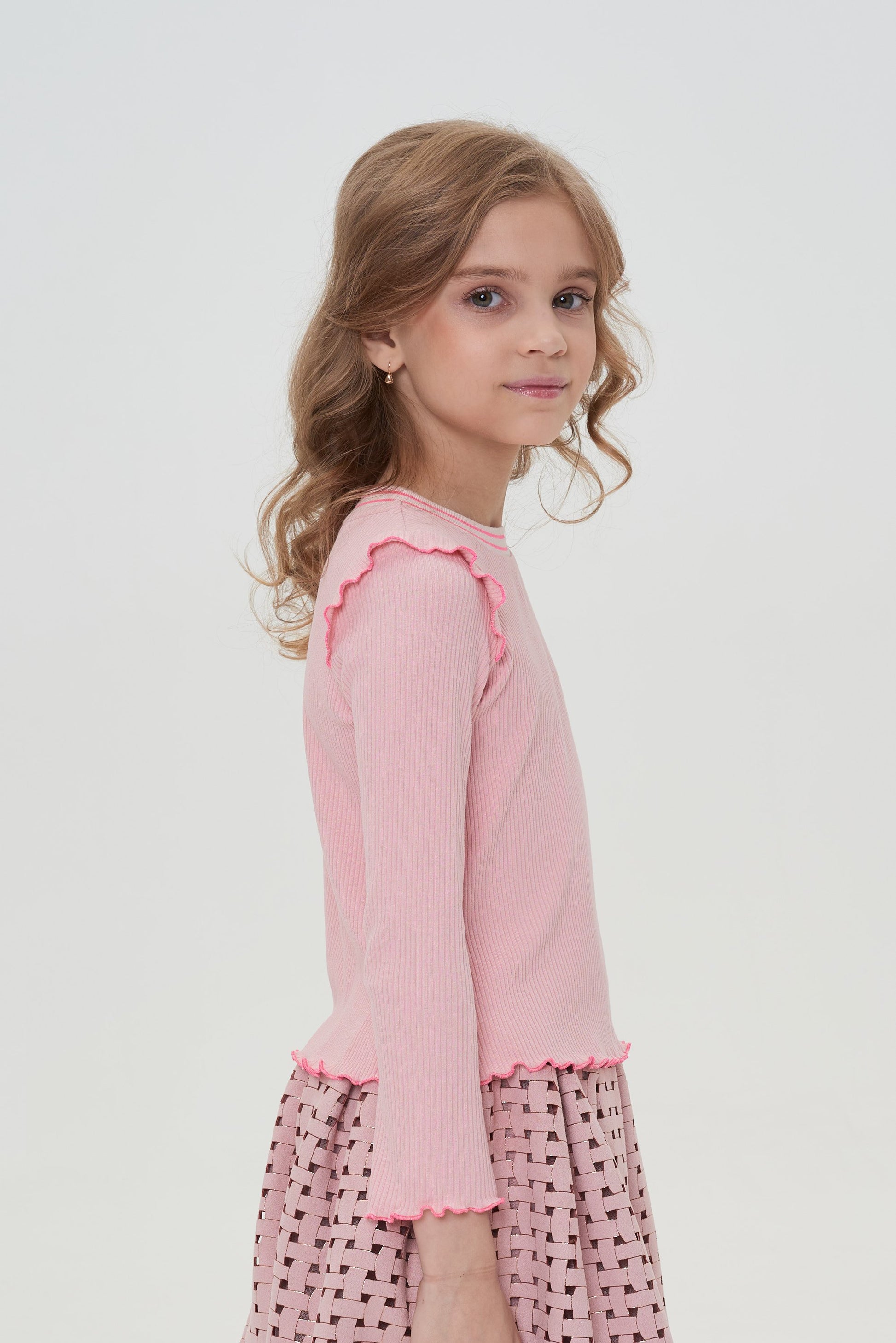 Miss Elegance. This elegant and comfortable pink blouse for girls is made from solid ""noodle"" texture jersey fabric. The waist-cut model features a wide peplum in the same fabric. The shoulders have miniature wings with magenta trim. The same trim accentuates the edges of the long sleeves, the hem of the garment, and the round neckline, which is adorned with a ruffle resembling a stand-up collar.