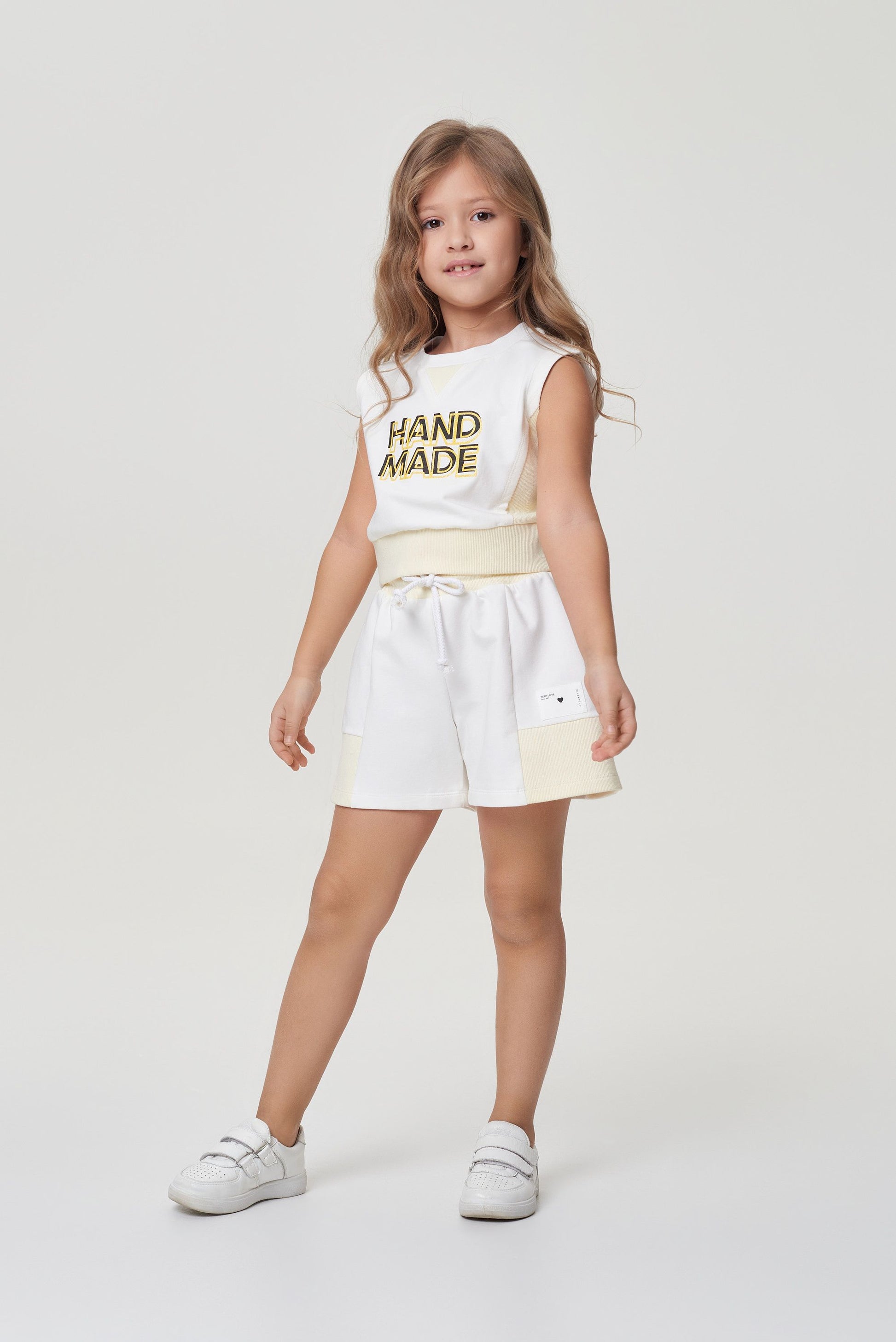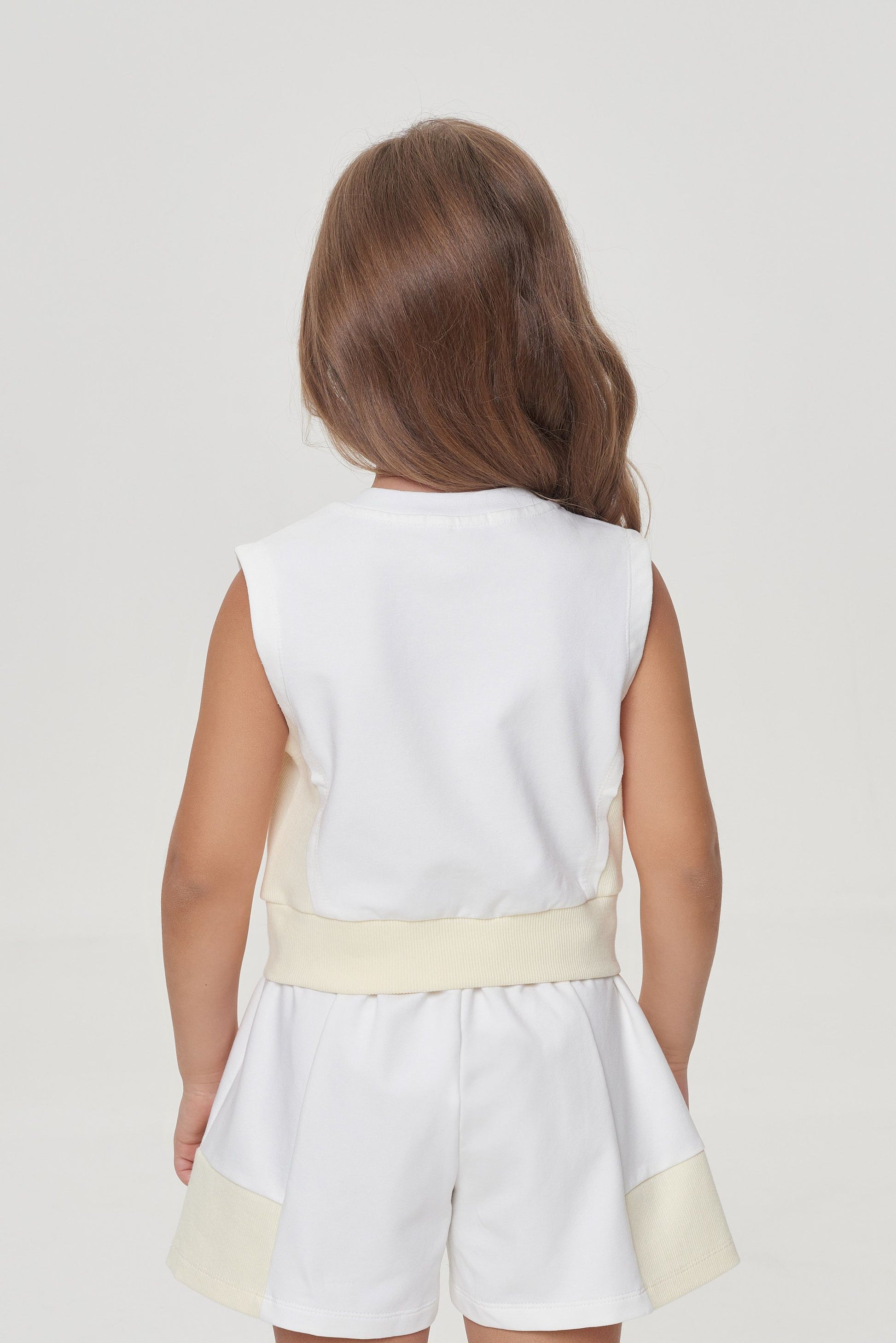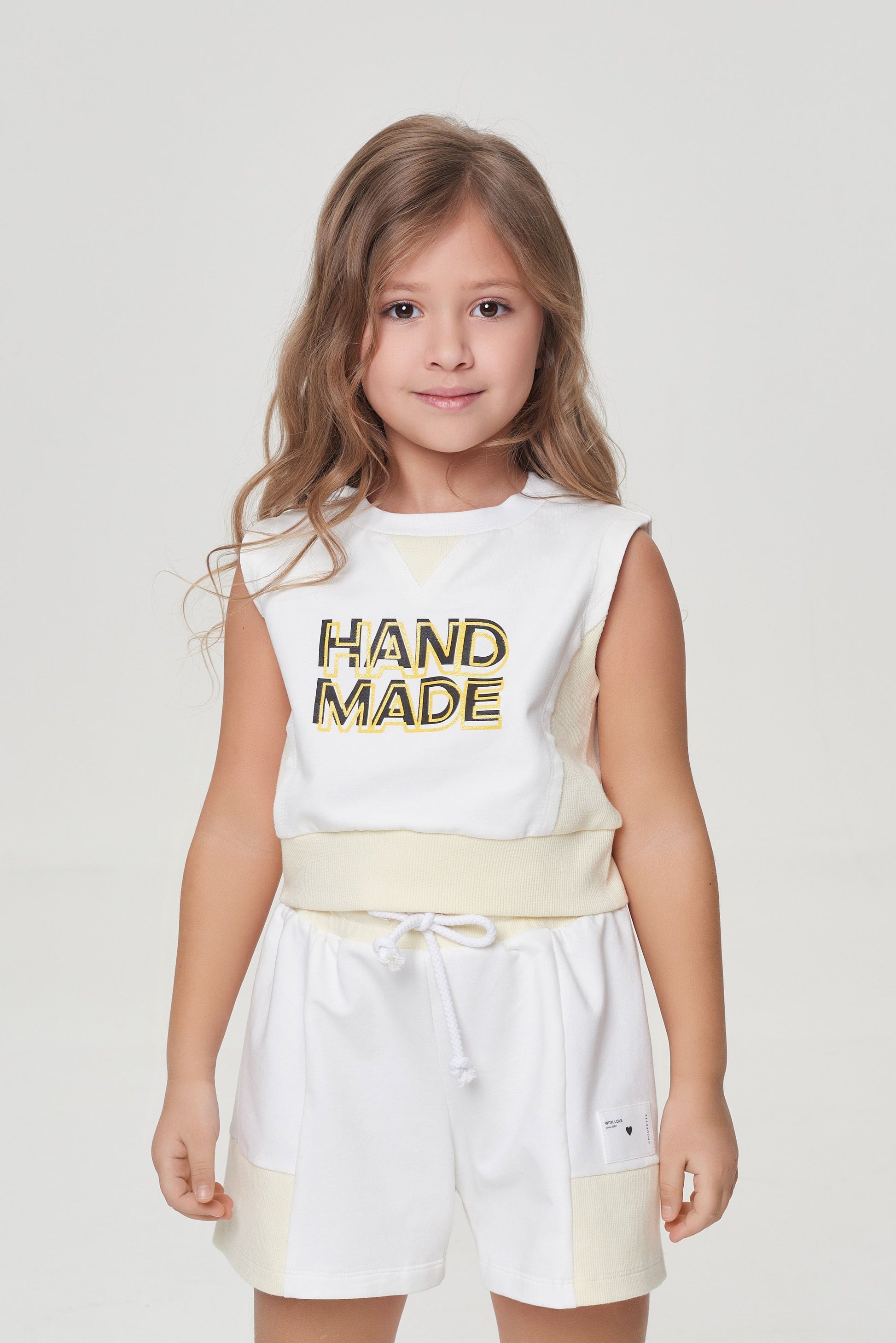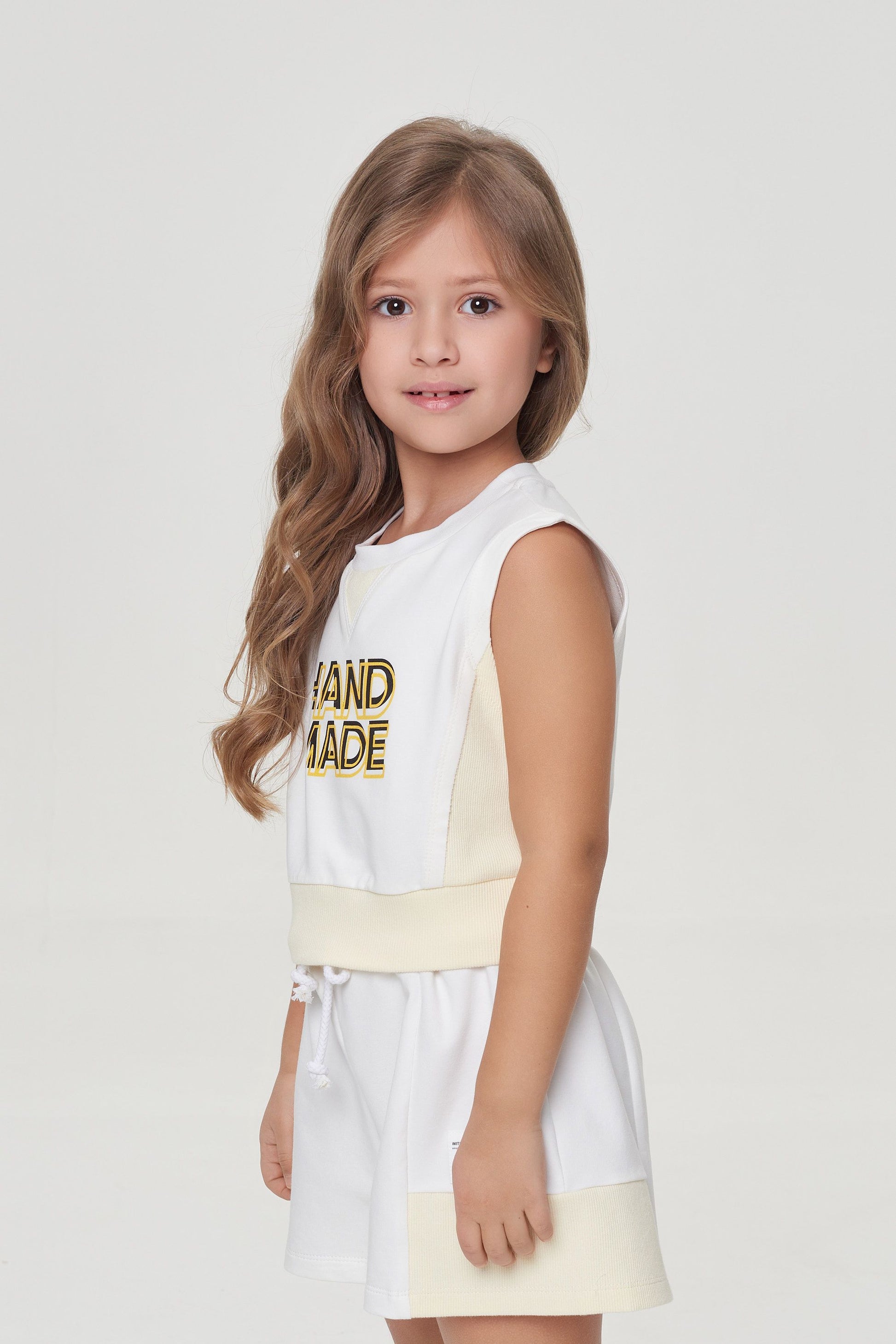 A wonderful crop top for a girl. Crop-tops confidently ascended the fashion podium this season! Such an element of the wardrobe approaches any style of clothing and sits perfectly on the figure. The short top of the stylish shade of Ecrew goes well with various skirts, trousers and shorts. A cotton model with wing sleeves is decorated with a bright design print.