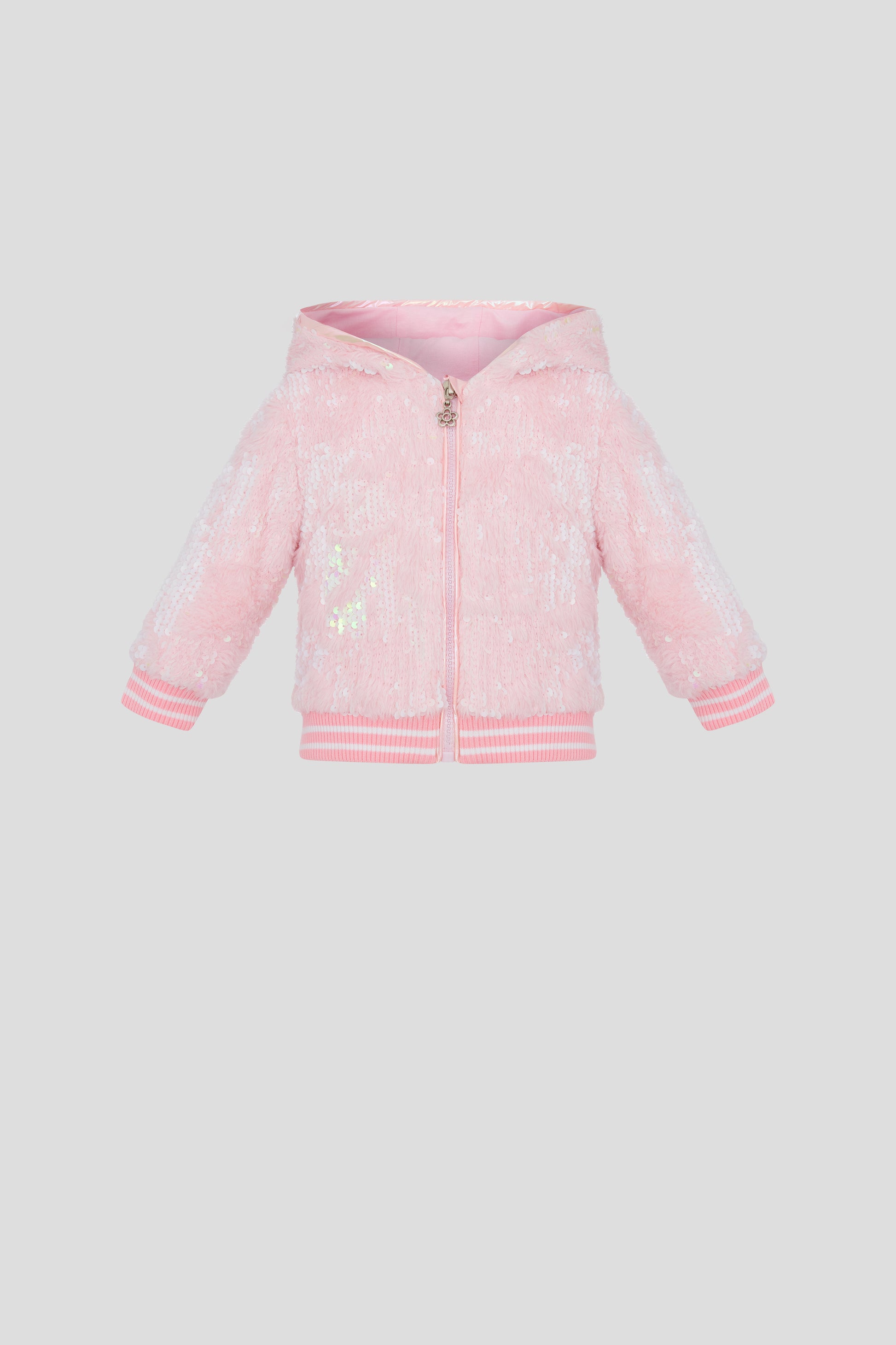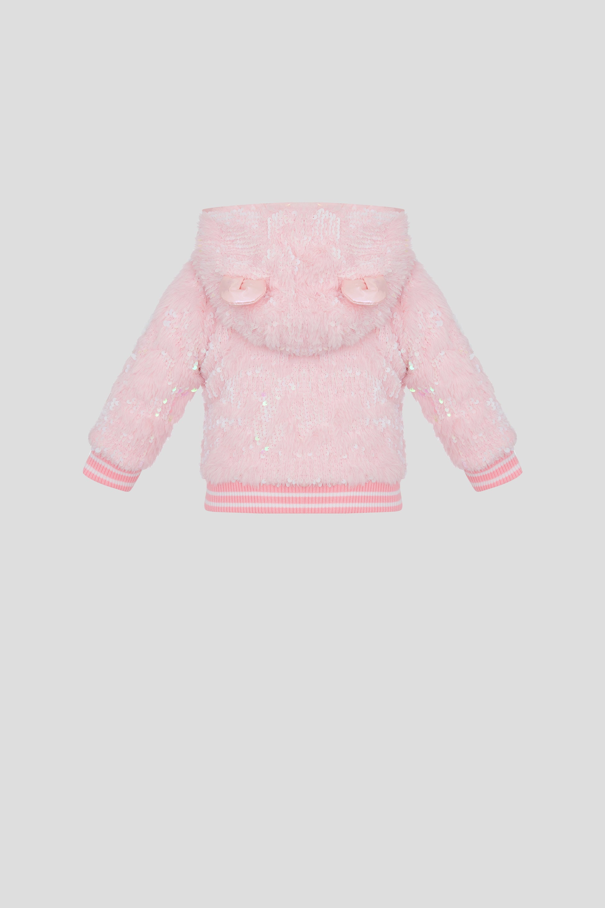 This warm fur jacket for girls will make your baby look like a fairy-tale princess. The pink model is decorated with sequins, while the front zip fastening, hem, and cuffs feature knitted elastic for a comfortable fit. The addition of funny ears on the hood adds a playful touch. Perfect for keeping your little one cozy and stylish.