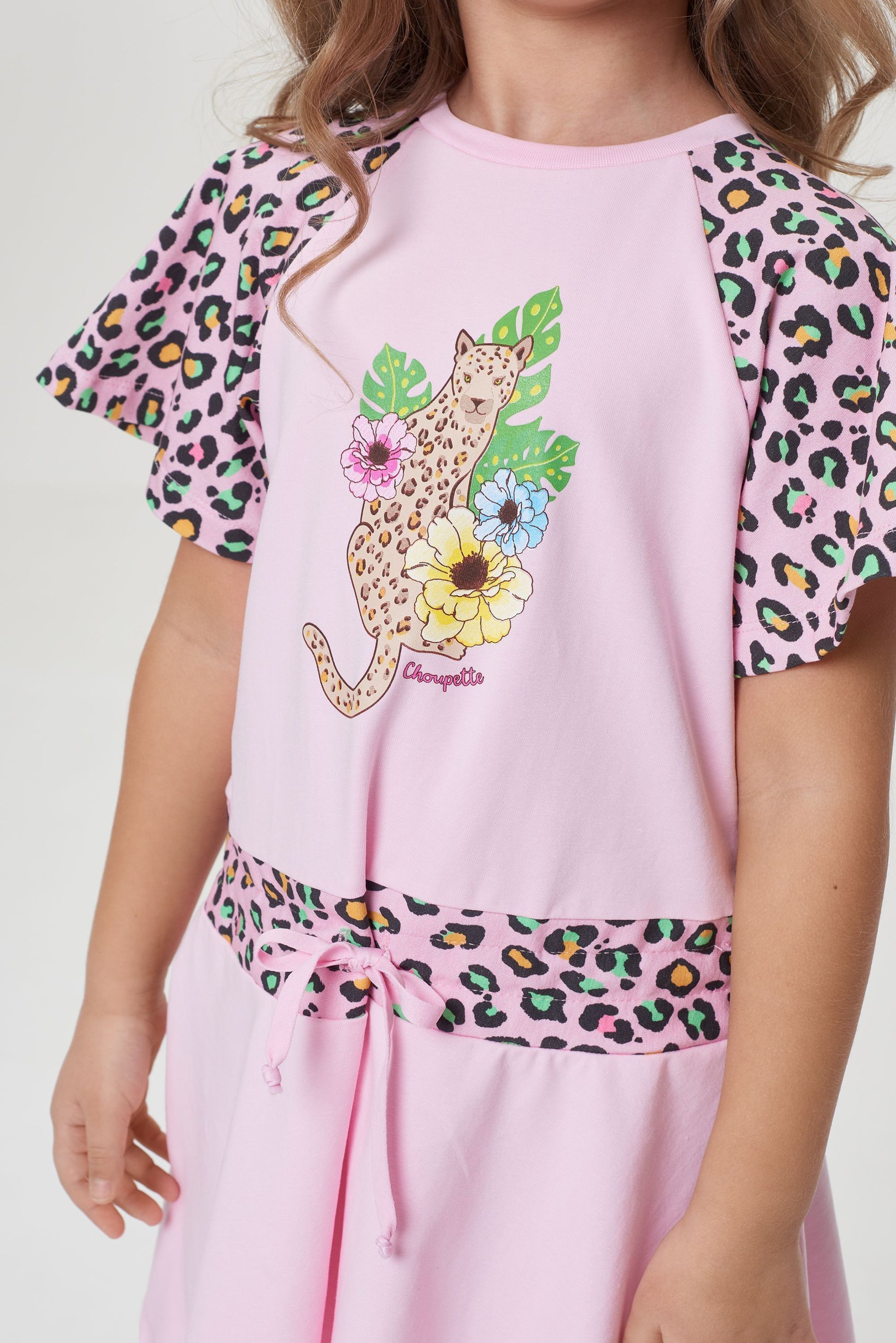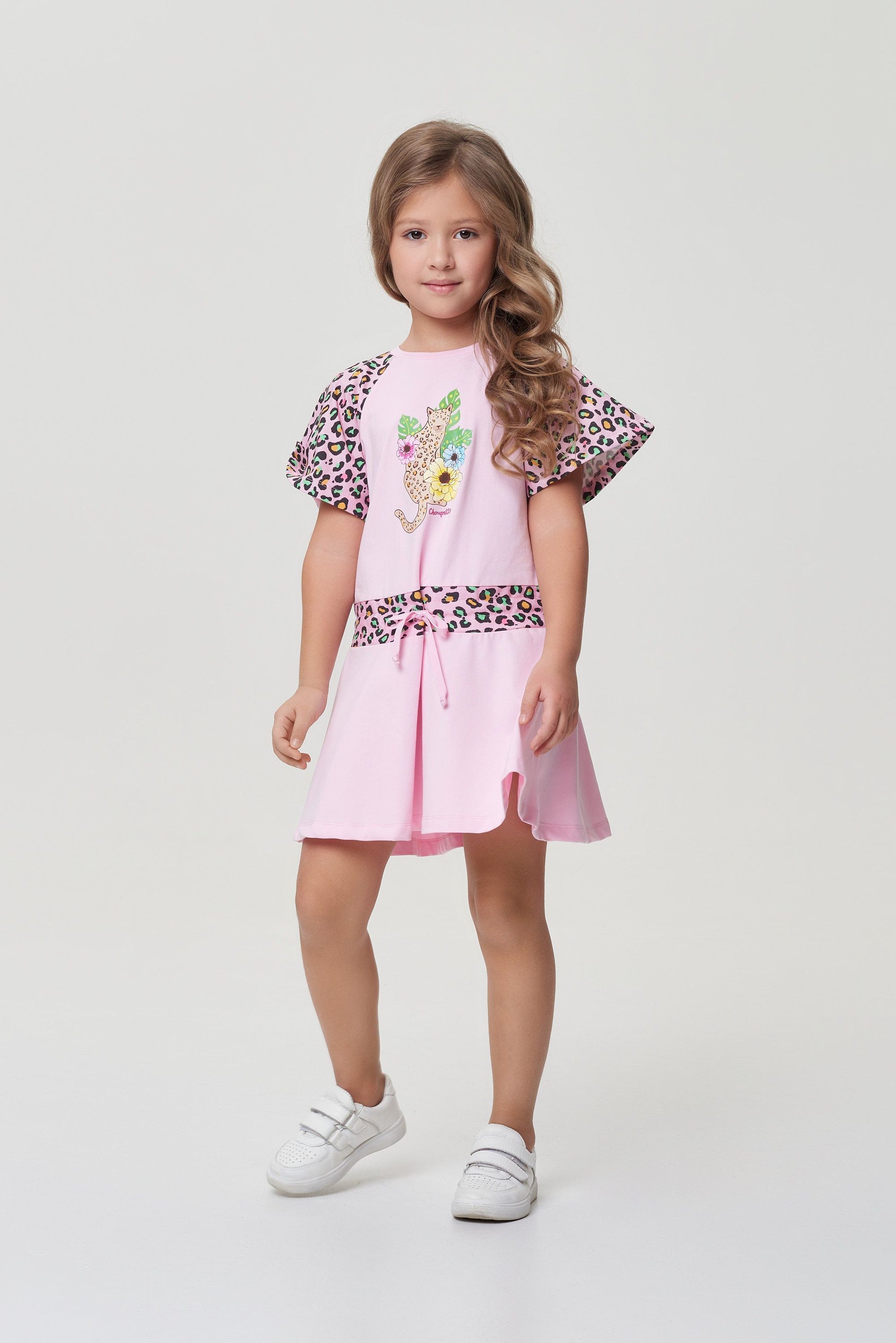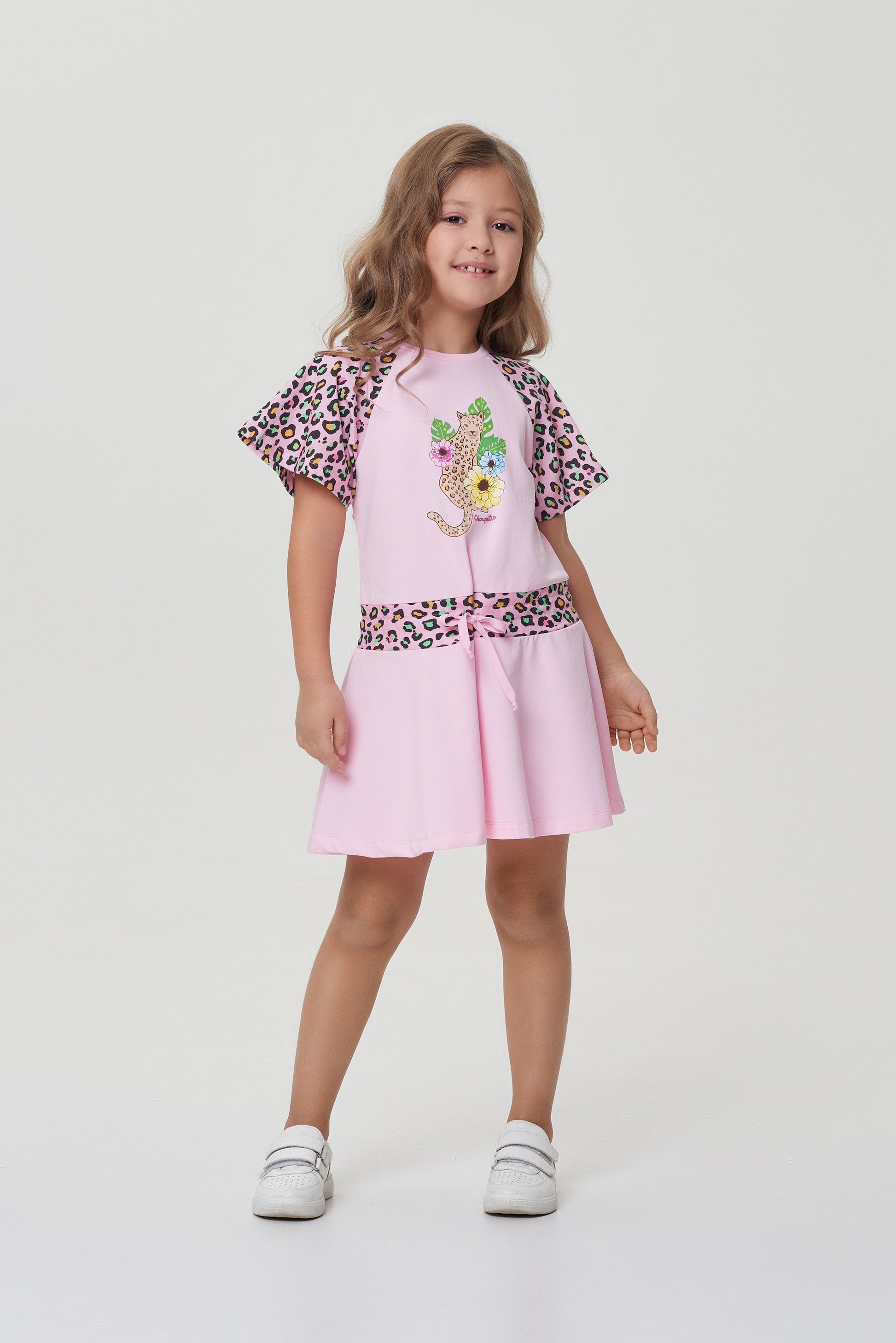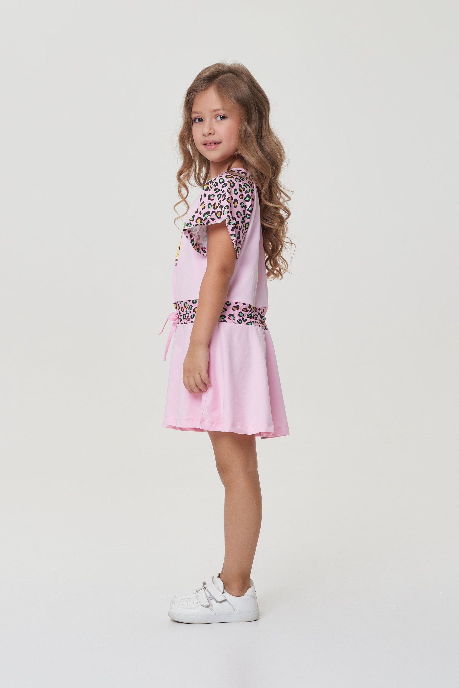 A combined dress for a girl combines all fashion trends. The laconic design of the model fits perfectly with bright and fashionable prints. This dress features leopard print on the sleeves and waistband. This element is a current trend in the fashion industry and emphasizes the individuality of the little fashionista. The top of the dress is decorated with an animal print, which adds a touch of fantasy and mystery to the child?s image. This detail will make the dress truly unique and stylish. Using a drawstring belt with ties, you can easily adjust the fit of the dress to suit your child's individual preferences.
