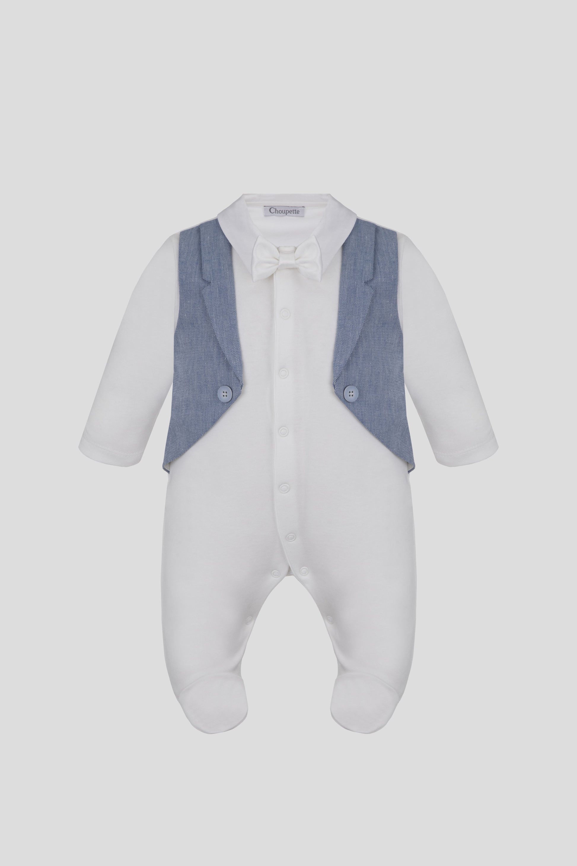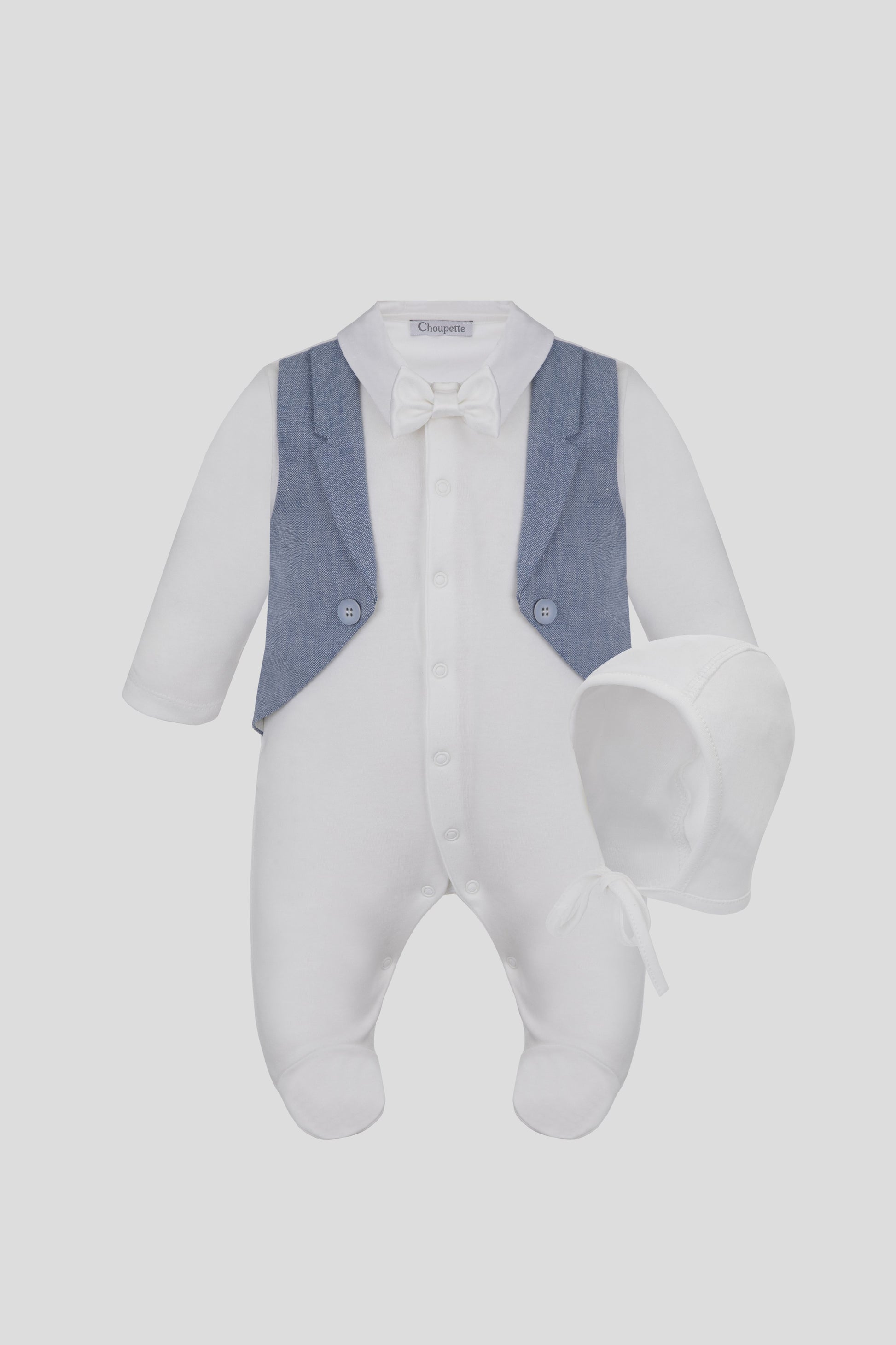 Smart Set ( Tuxedo Immitation Overall and Bonnet )with a blue vest This set is expertly crafted from high-quality materials to provide both style and comfort for your little one. The tuxedo imitation overall paired with a stunning blue vest is sure to make them stand out at any special occasion. With this outfit, your child will look sharp and stylish while feeling comfortable and confident.
