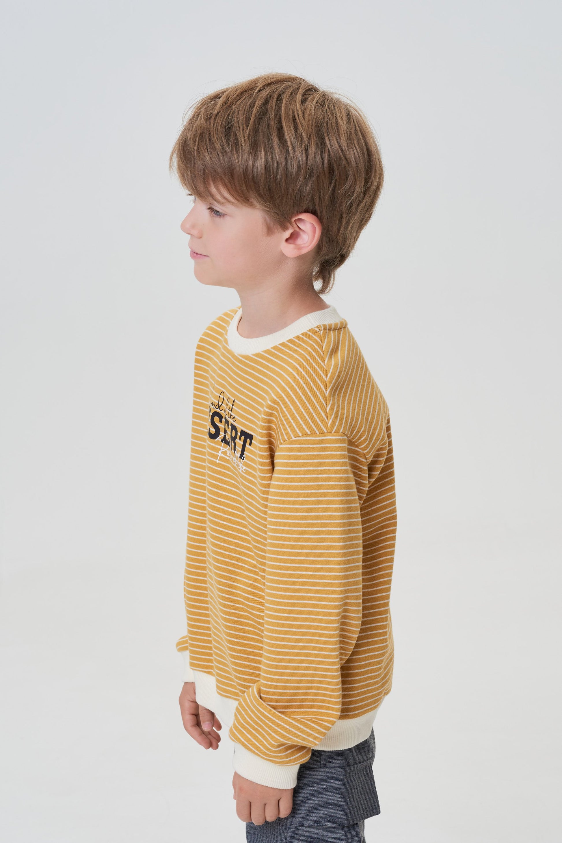 Cartoon characters, comic book images, and similar prints are gradually taking a back seat in fashion. Today, designers catering to teenagers offer more subdued options? Minimalistic, stylish, and featuring concise lettering. This stylish striped sweatshirt for boys, made from juicy 'ochre' cotton jersey with contrasting sleeve and collar trim, adds a vibrant touch to a teenager's wardrobe.