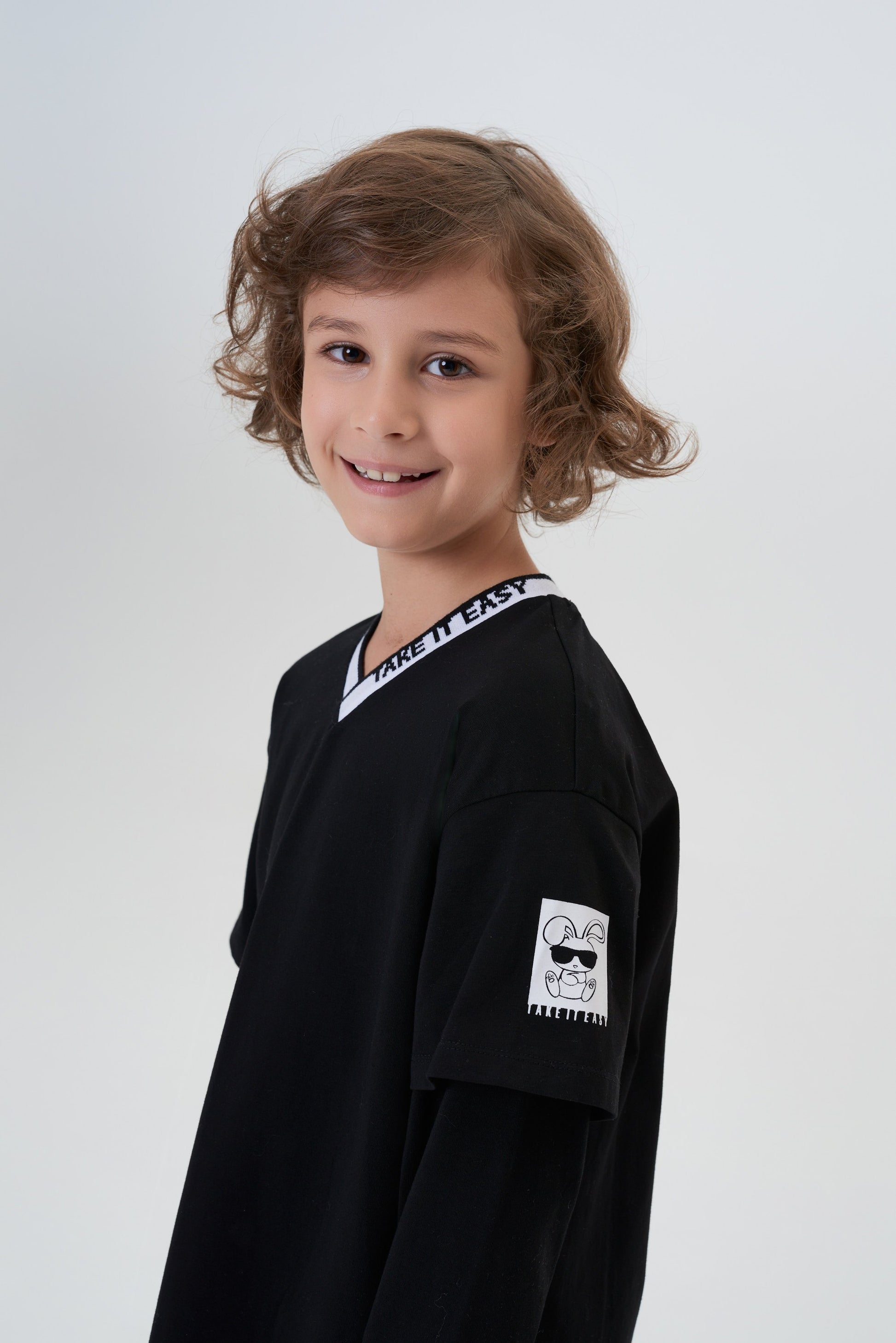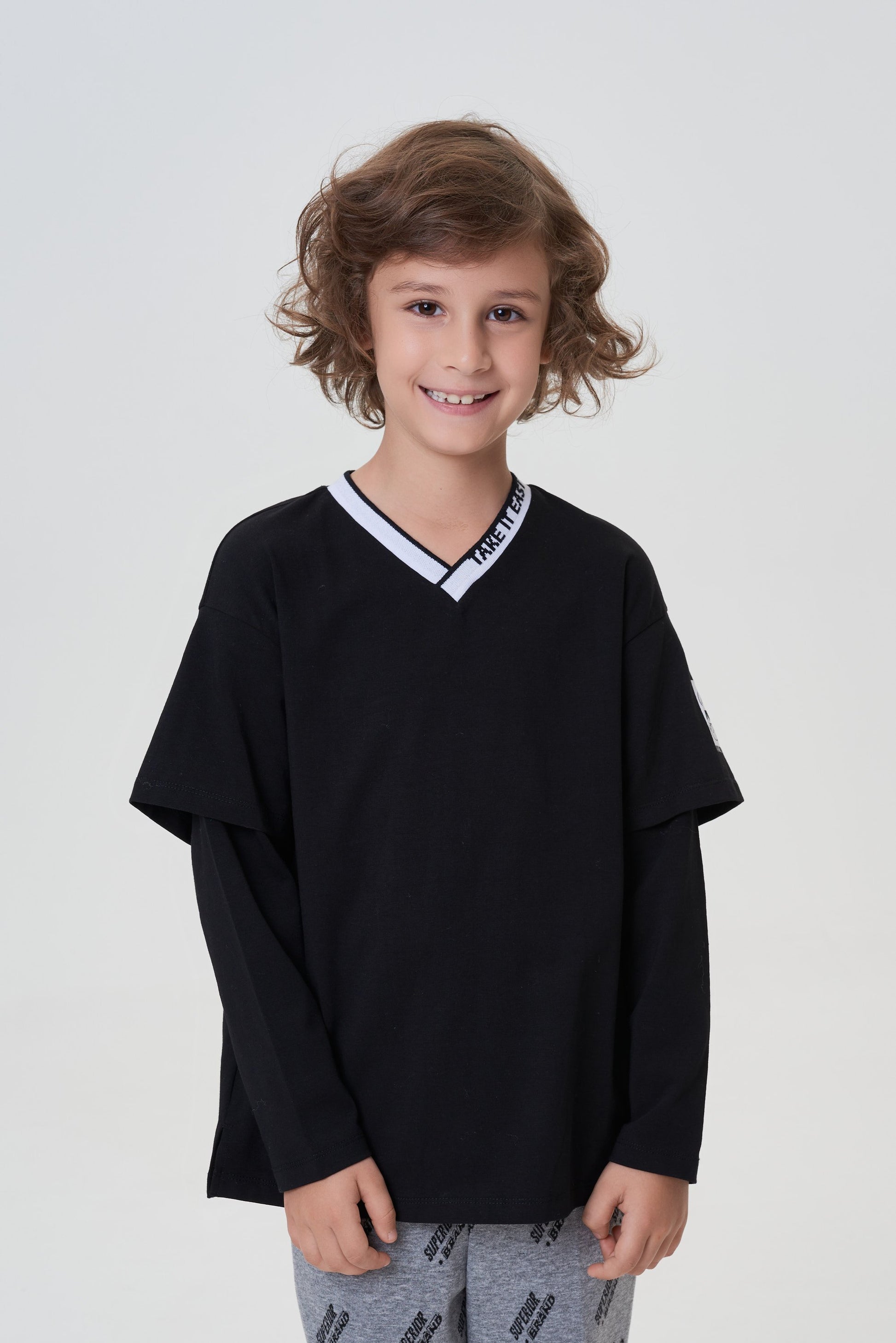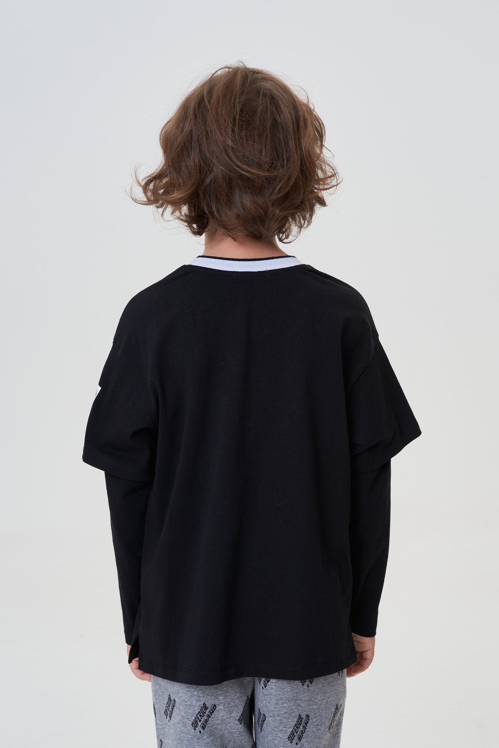 Such an item tells the world about your inner ""self."" A relatively simple model becomes a striking addition to a teenage boy's wardrobe. This designer outfit with unique sleeves and chic casual decoration is designed for outings, friendly gatherings, and fashionable gatherings. A stylish and comfortable black long-sleeve jumper made from cotton jersey is perfect for an energetic young man.