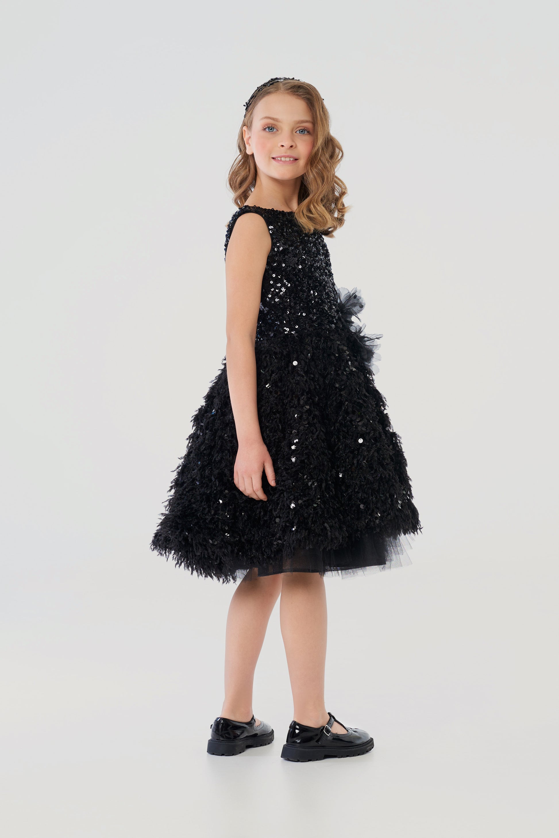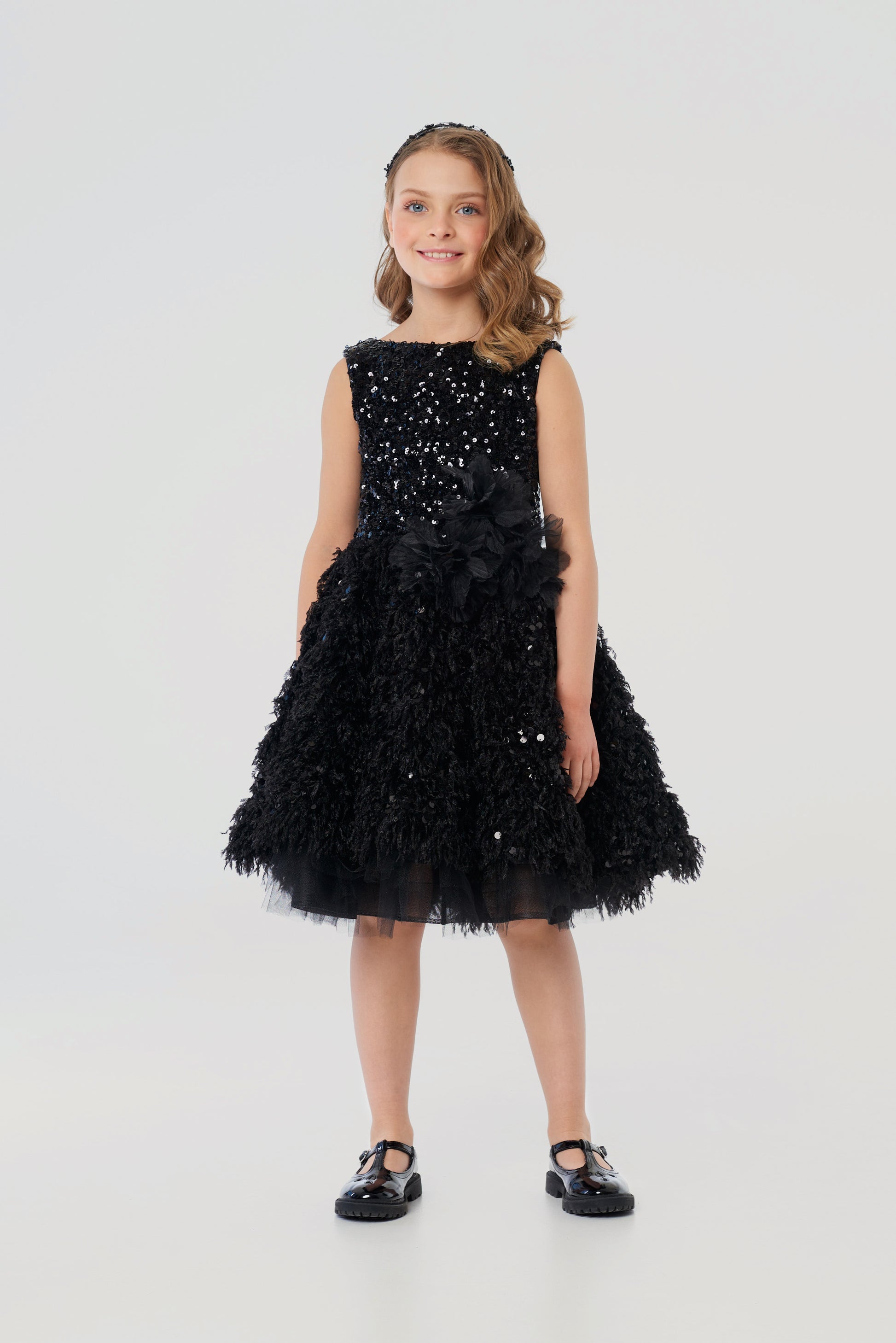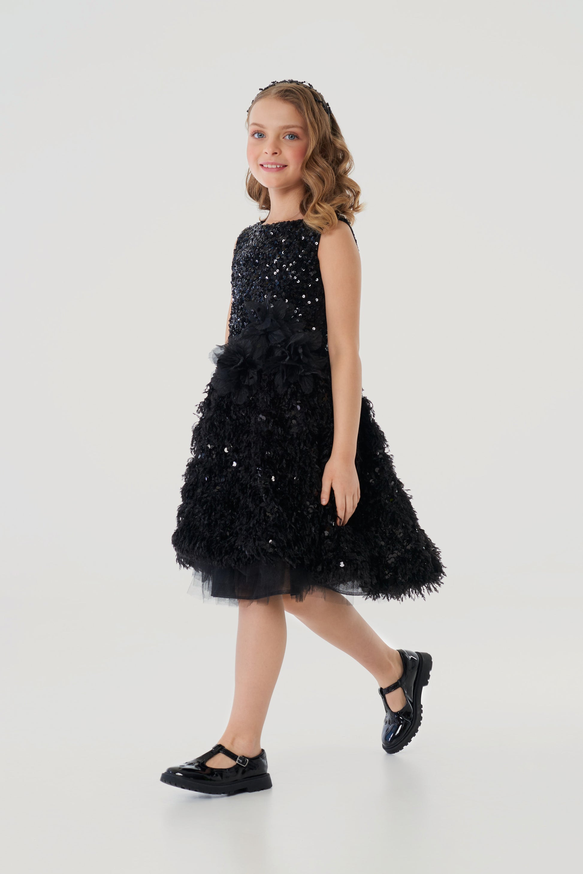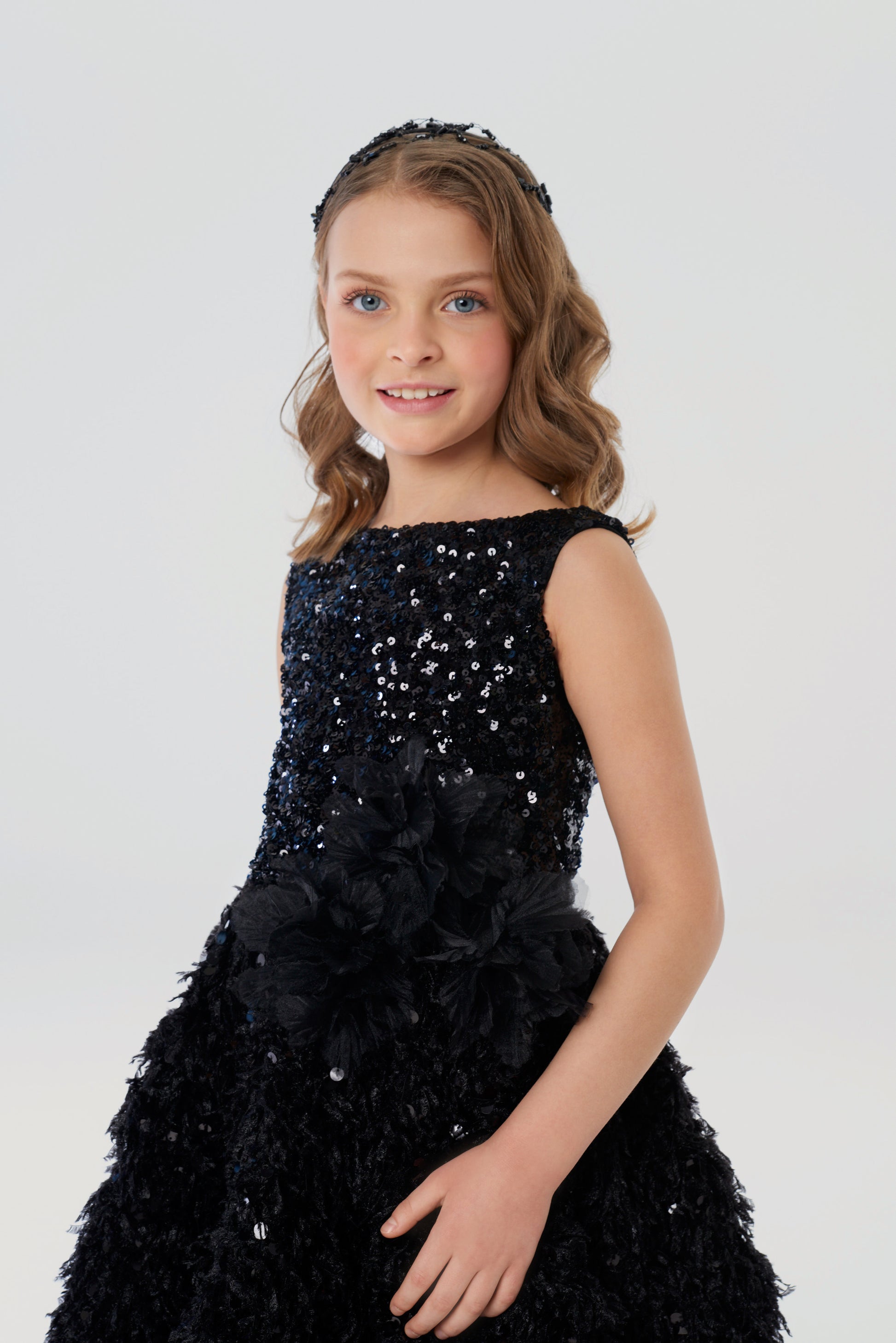 Elevate your little fashionista's style with our Feather Fluffy Skirt Shining Top Dress. This elegant black dress features a semi-fitted silhouette that accentuates curves and adds a touch of sweetness. The shimmering sequins and fluffy skirt create a unique and light effect, while the large voluminous flowers add an original and attractive touch. Perfect for any occasion, she'll love the combination of luxury and charm.