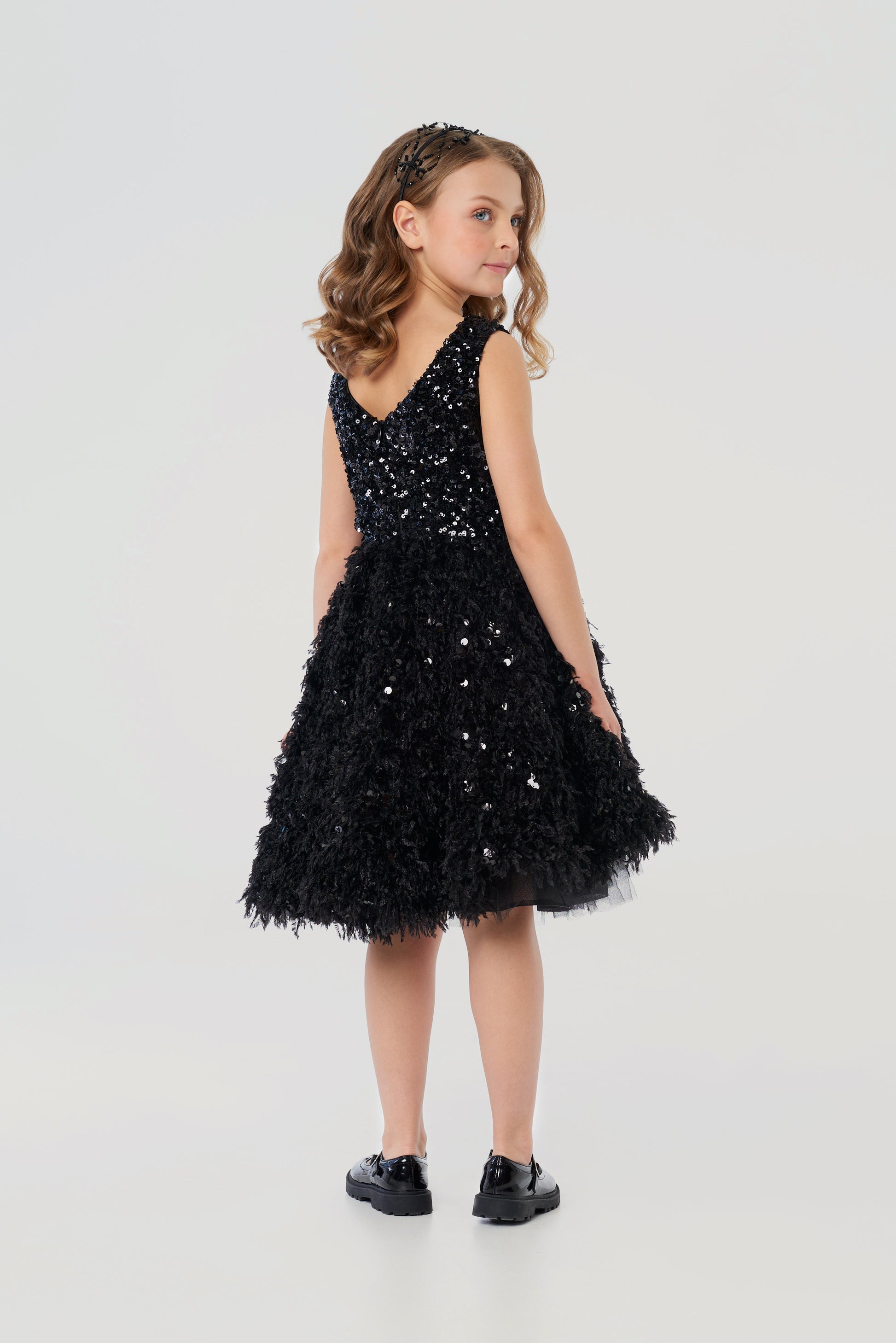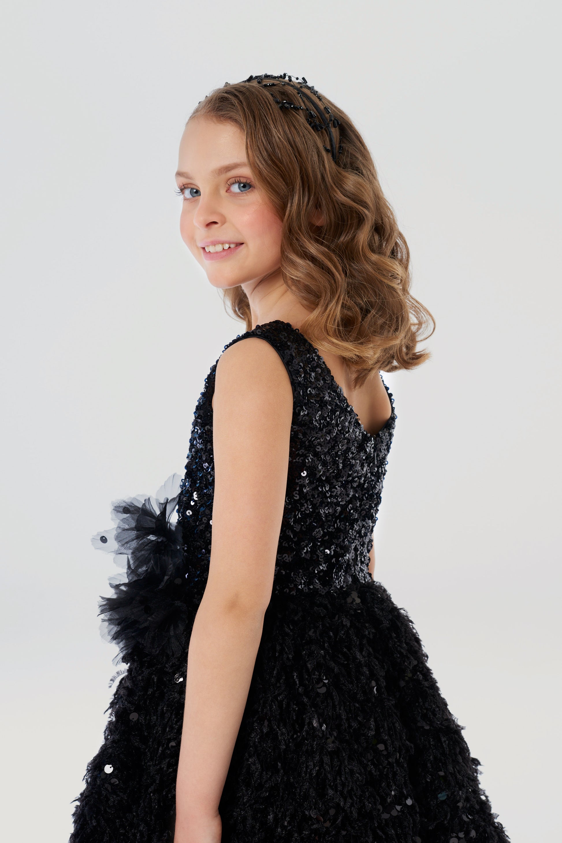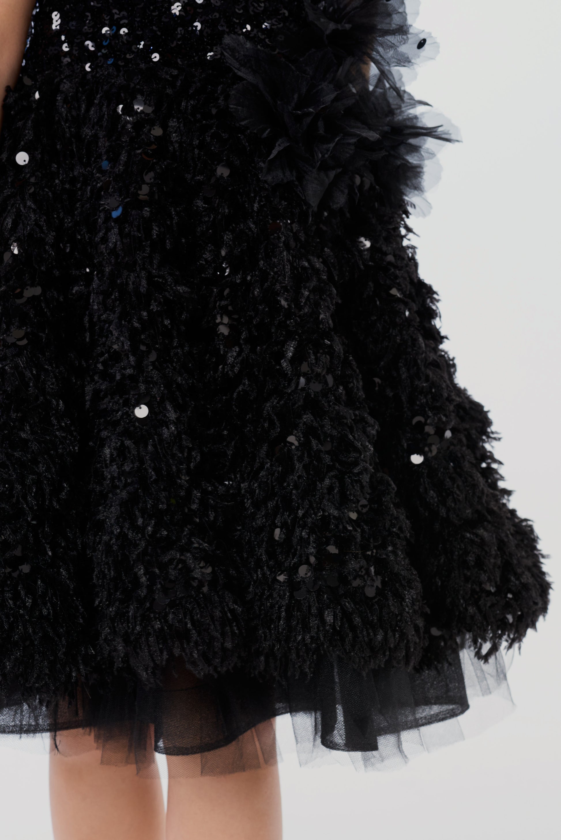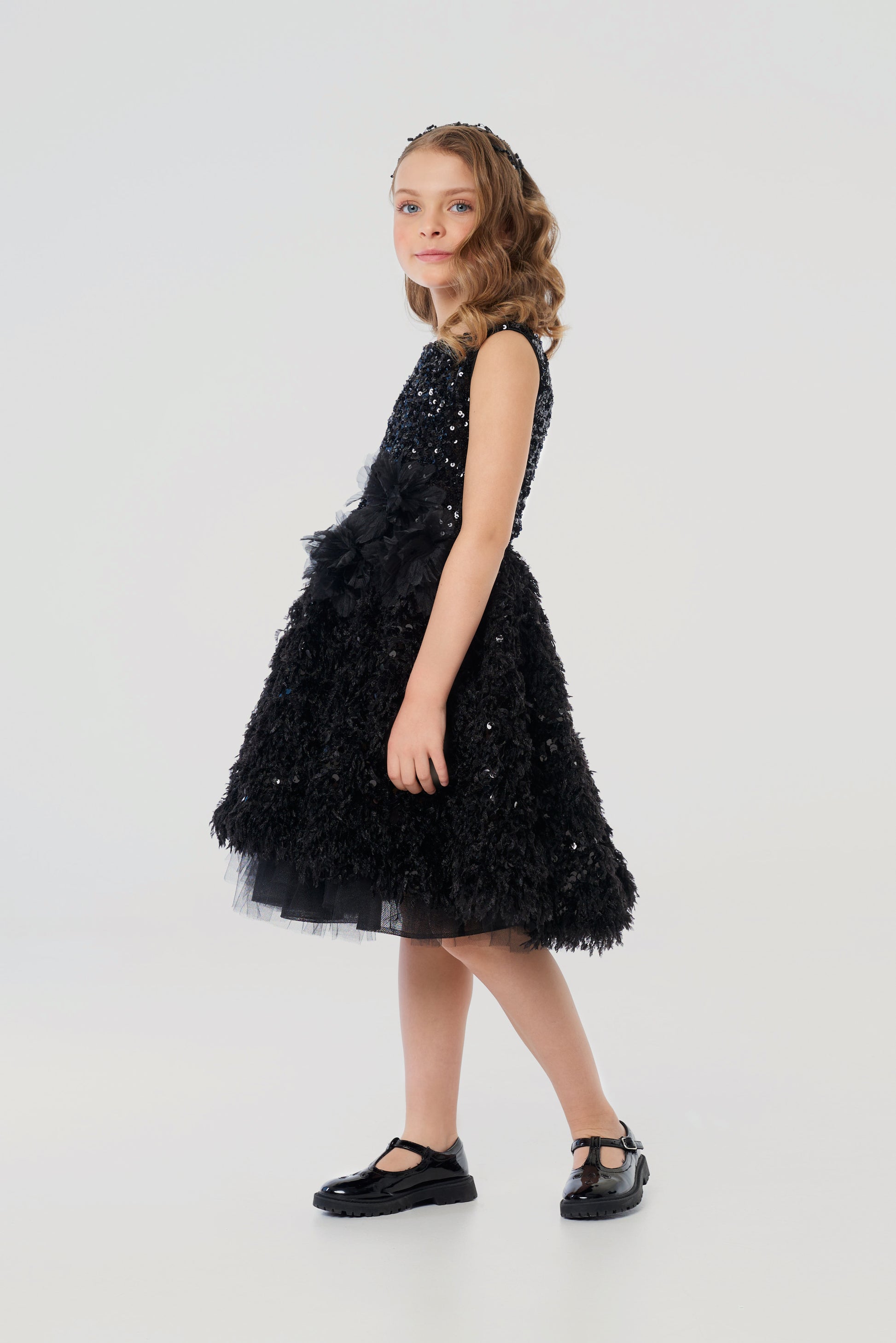 Elevate your little fashionista's style with our Feather Fluffy Skirt Shining Top Dress. This elegant black dress features a semi-fitted silhouette that accentuates curves and adds a touch of sweetness. The shimmering sequins and fluffy skirt create a unique and light effect, while the large voluminous flowers add an original and attractive touch. Perfect for any occasion, she'll love the combination of luxury and charm.
