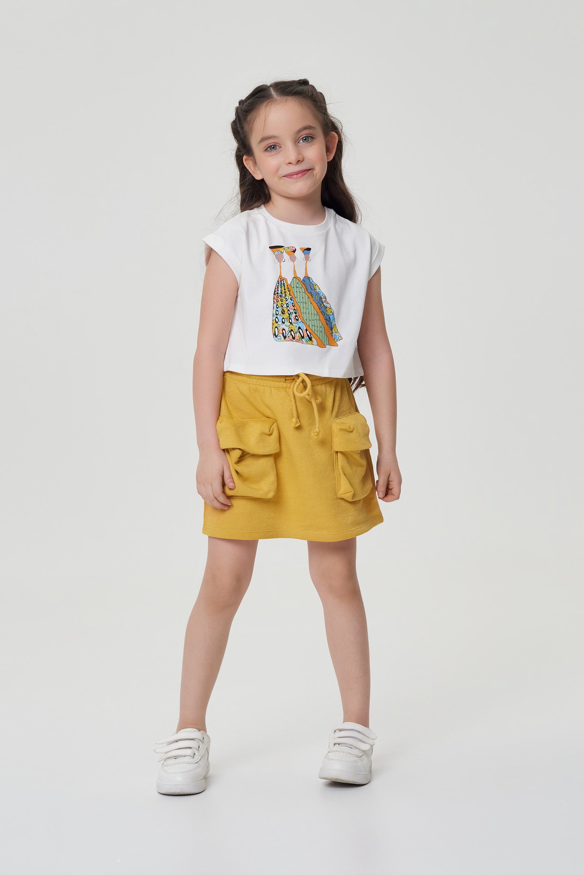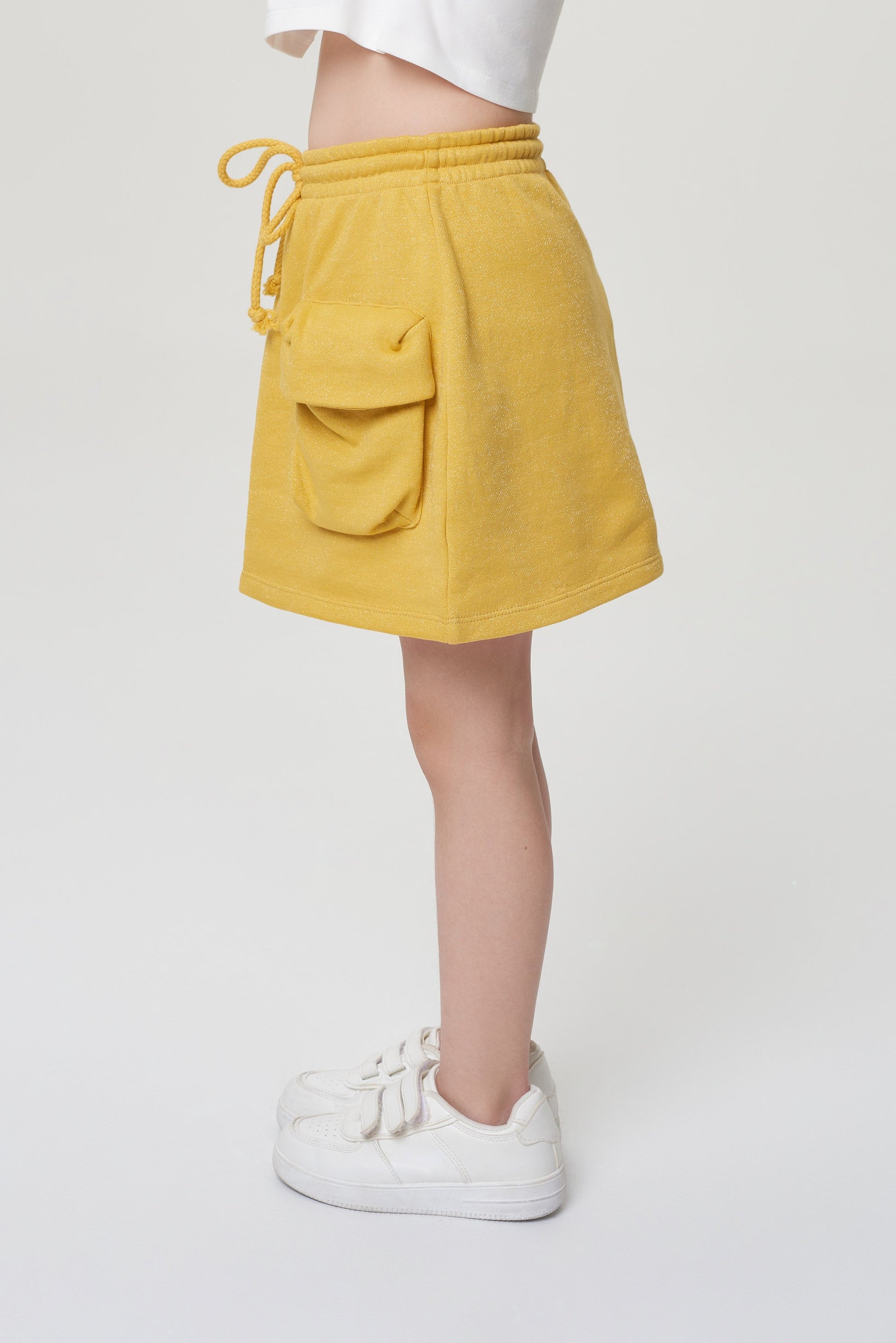 The skirt in a trendy curry color can be easily combined with T-shirts, sweatshirts and hoodies.