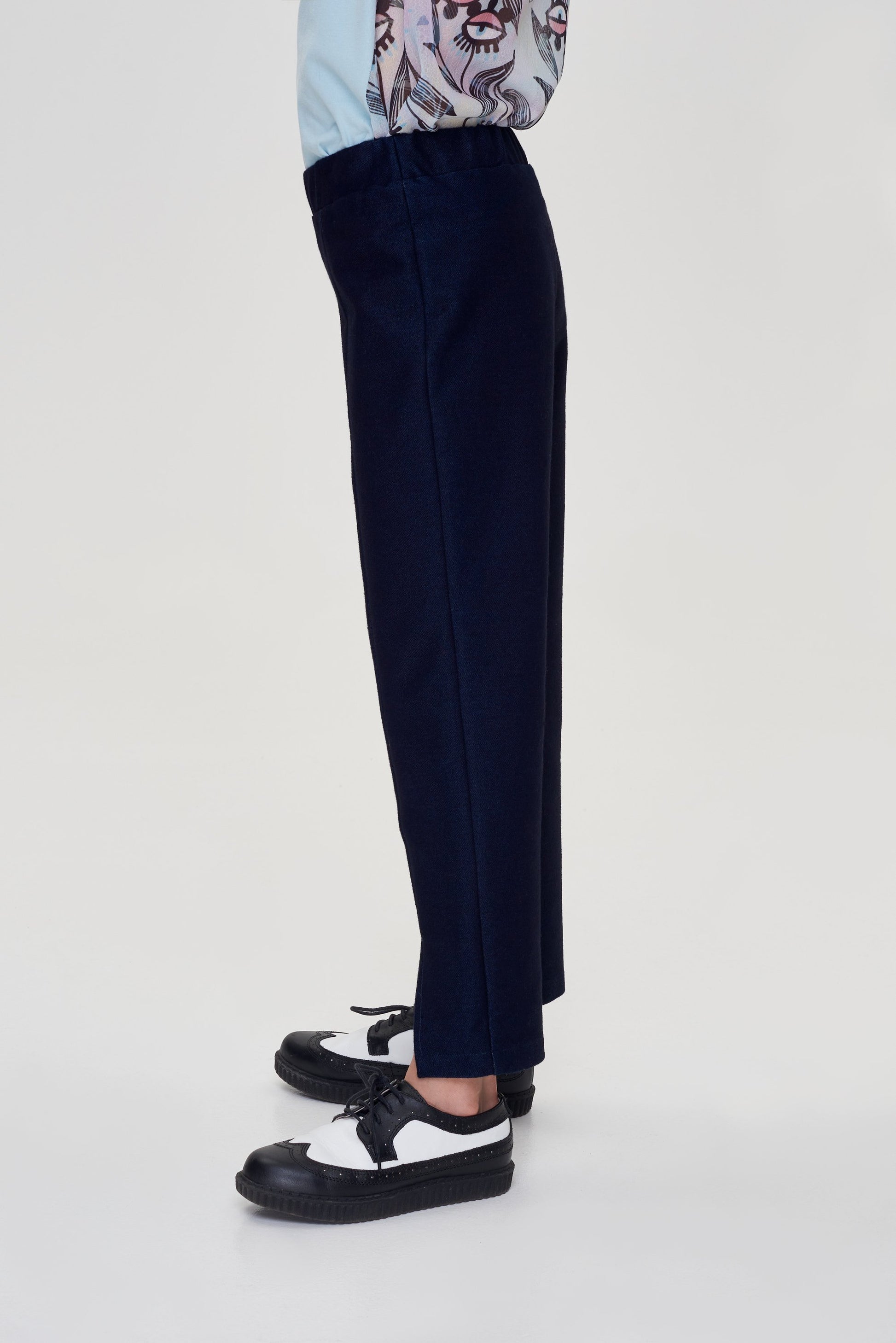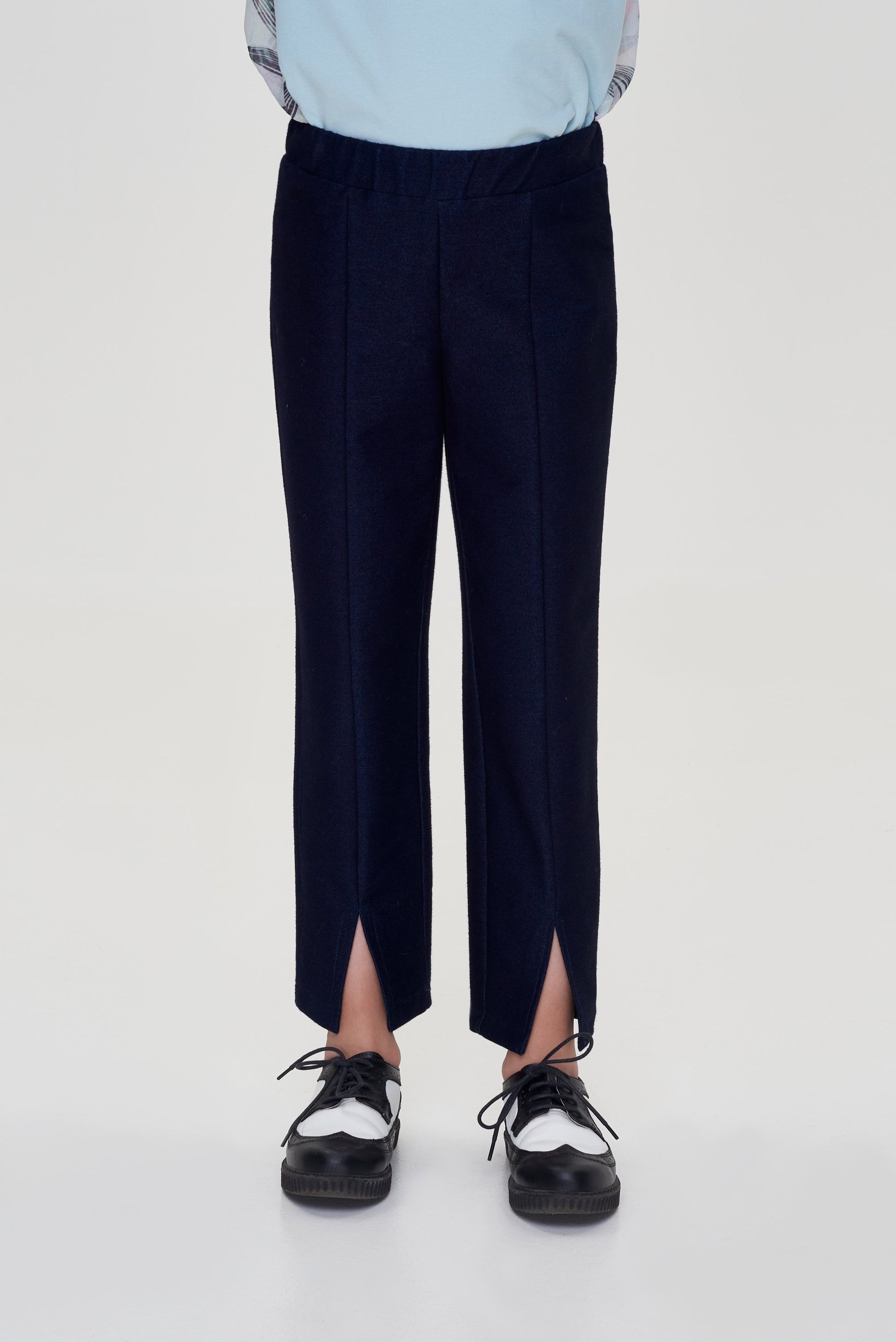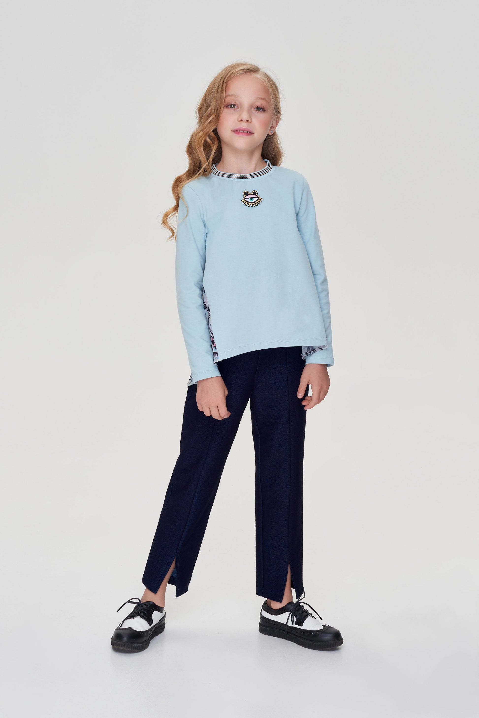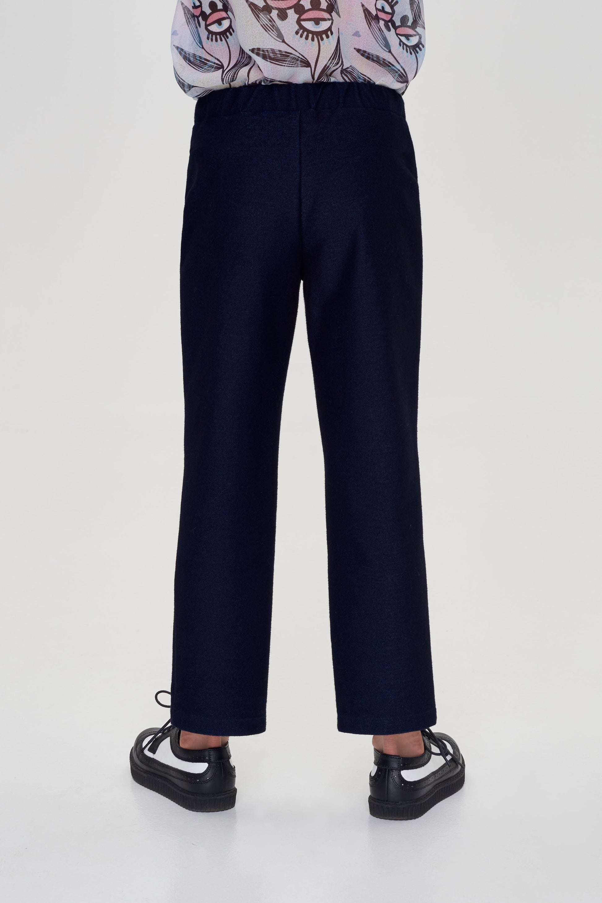 Stylish strict trousers for a girl are made of knitwear that imitates denim. Such comfortable ""jeans"" will easily find a set in the form of blouses and T-shirts. The trouser has a straight silhouette, the central stitched arrows downwards form cuts, giving the silhouette more convenience. The elastic belt made it possible to do without a clasp. High-quality blended fabric retains its shape and color even after repeated washings.