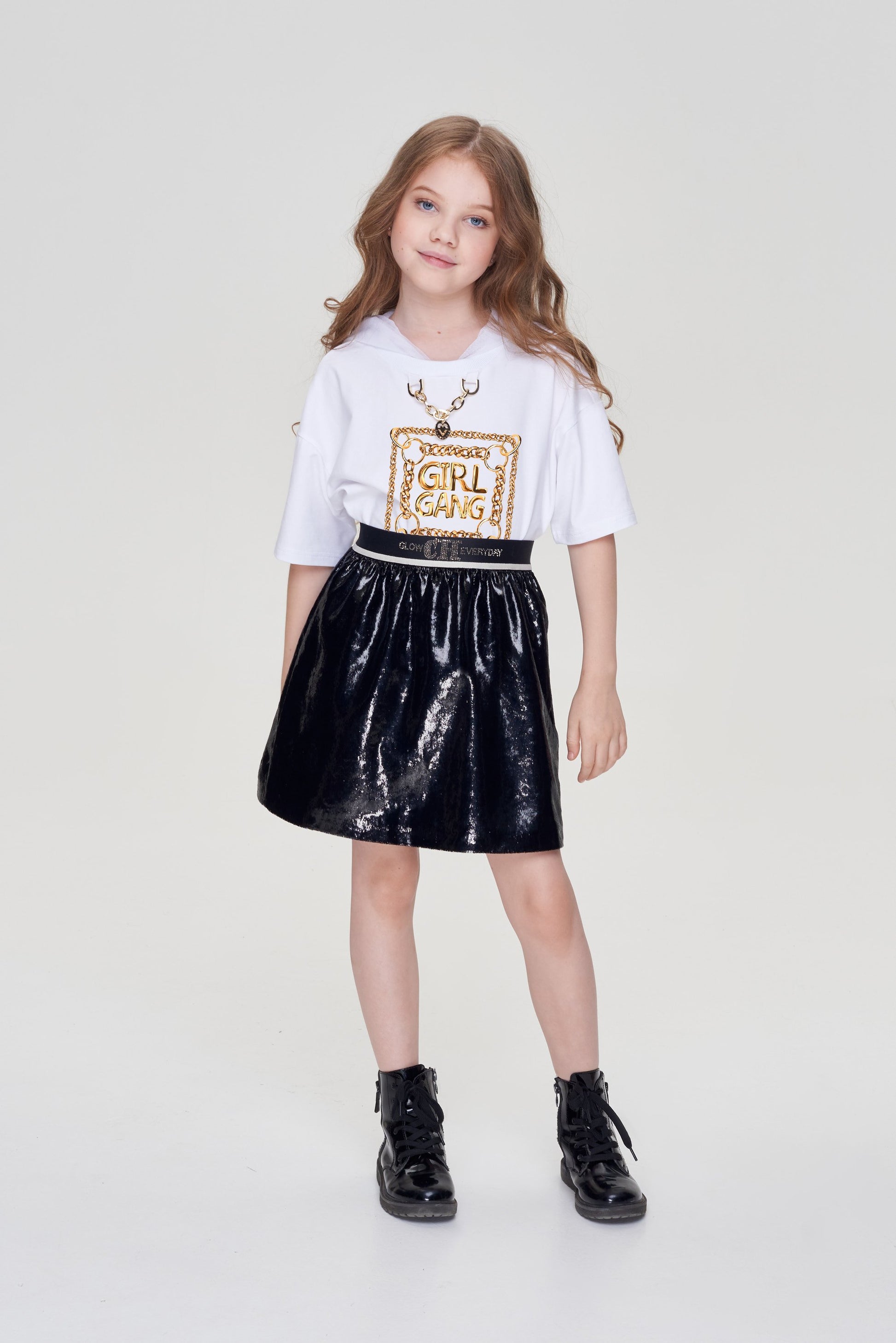 Fashionable midi length skirt is made of metallized fabric, which gave the model a modern sound. Natural viscose lining provides comfort to the child. A free straight silhouette, created with the help of assemblies on the belt, does not constrain movement. The skirt is great for creating spectacular festive looks, easily combined with any top due to the basic black color.