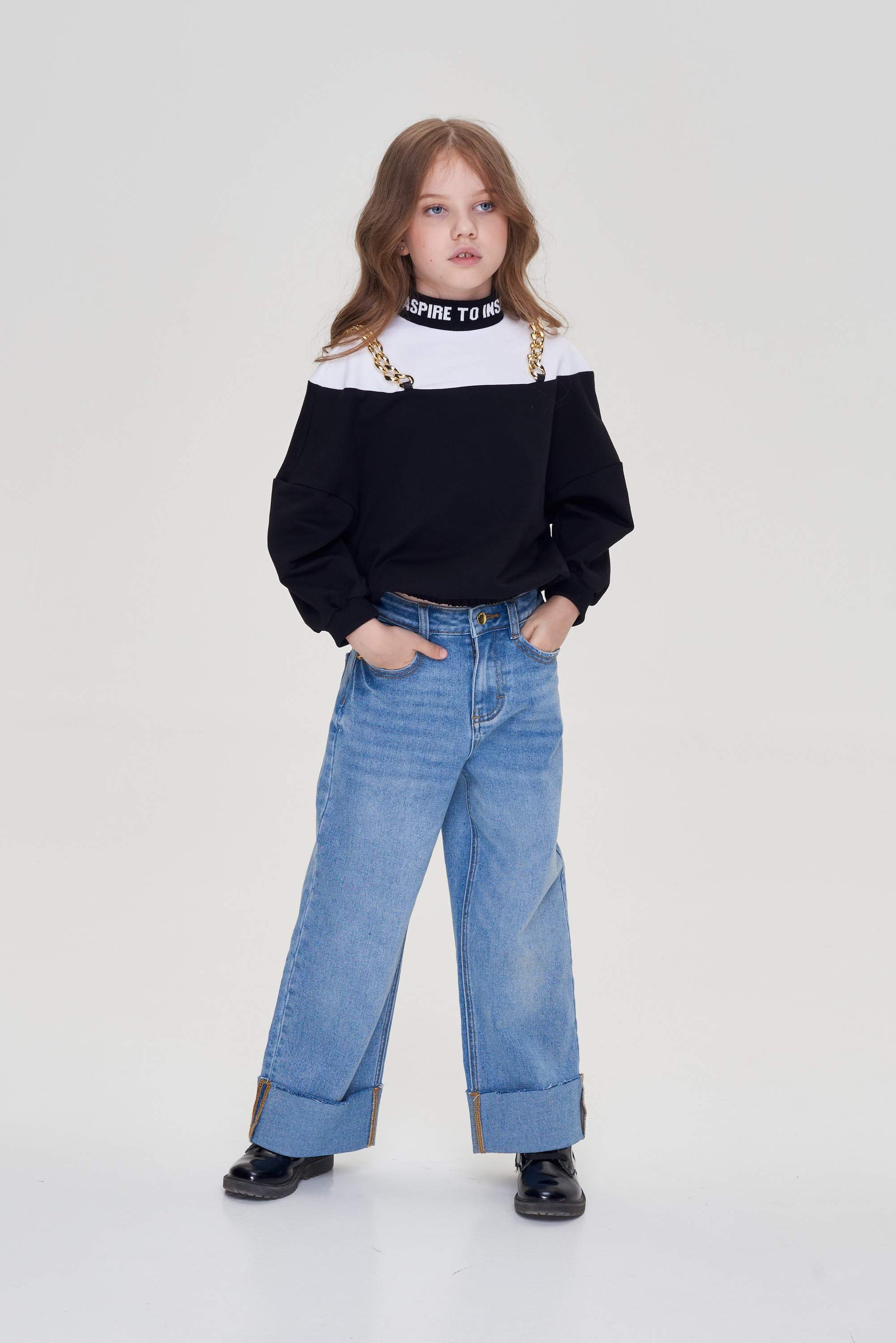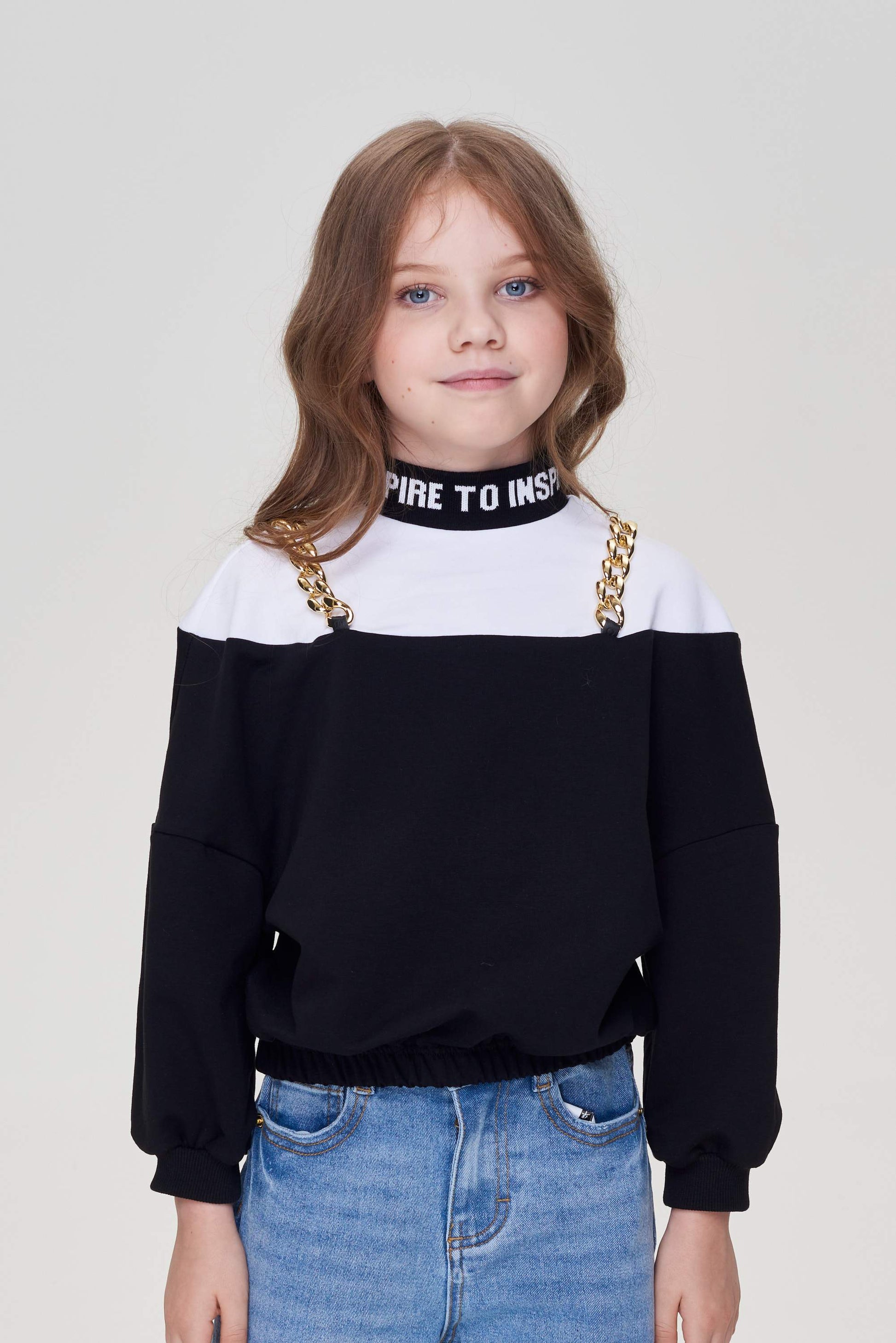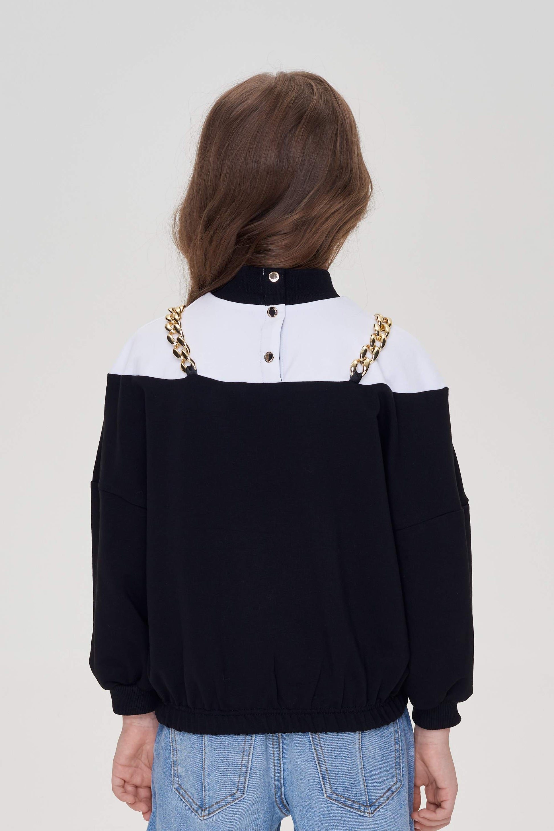 A combined fashionable jumper for girls is created for modern little fashionistas. Natural knitted knitwear holds its shape well and is pleasant for delicate children's skin. The spectacular design consists of a free silhouette and decorative strap chains. The neck of the jumper is decorated with an elastic stand collar with a funny inscription. The edges of the sleeves and the bottom of the product are treated with elastic inserts for ease of fit.