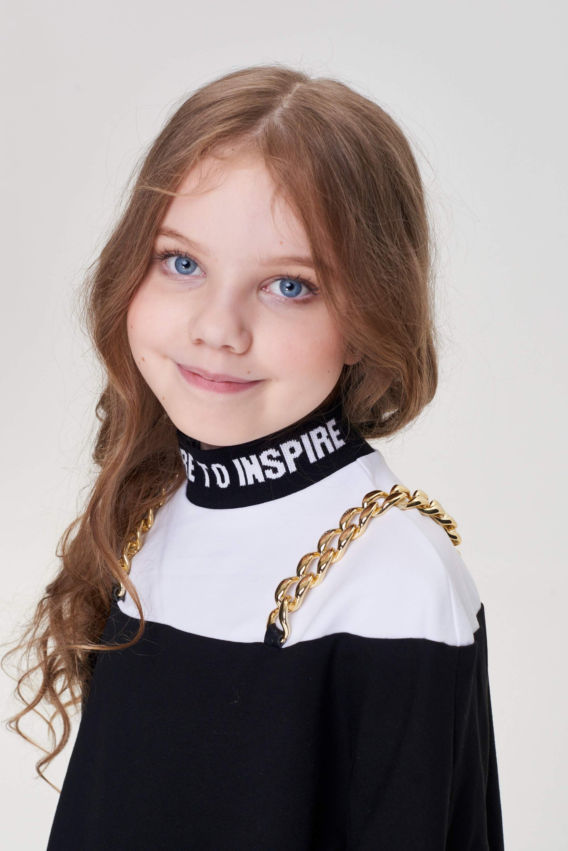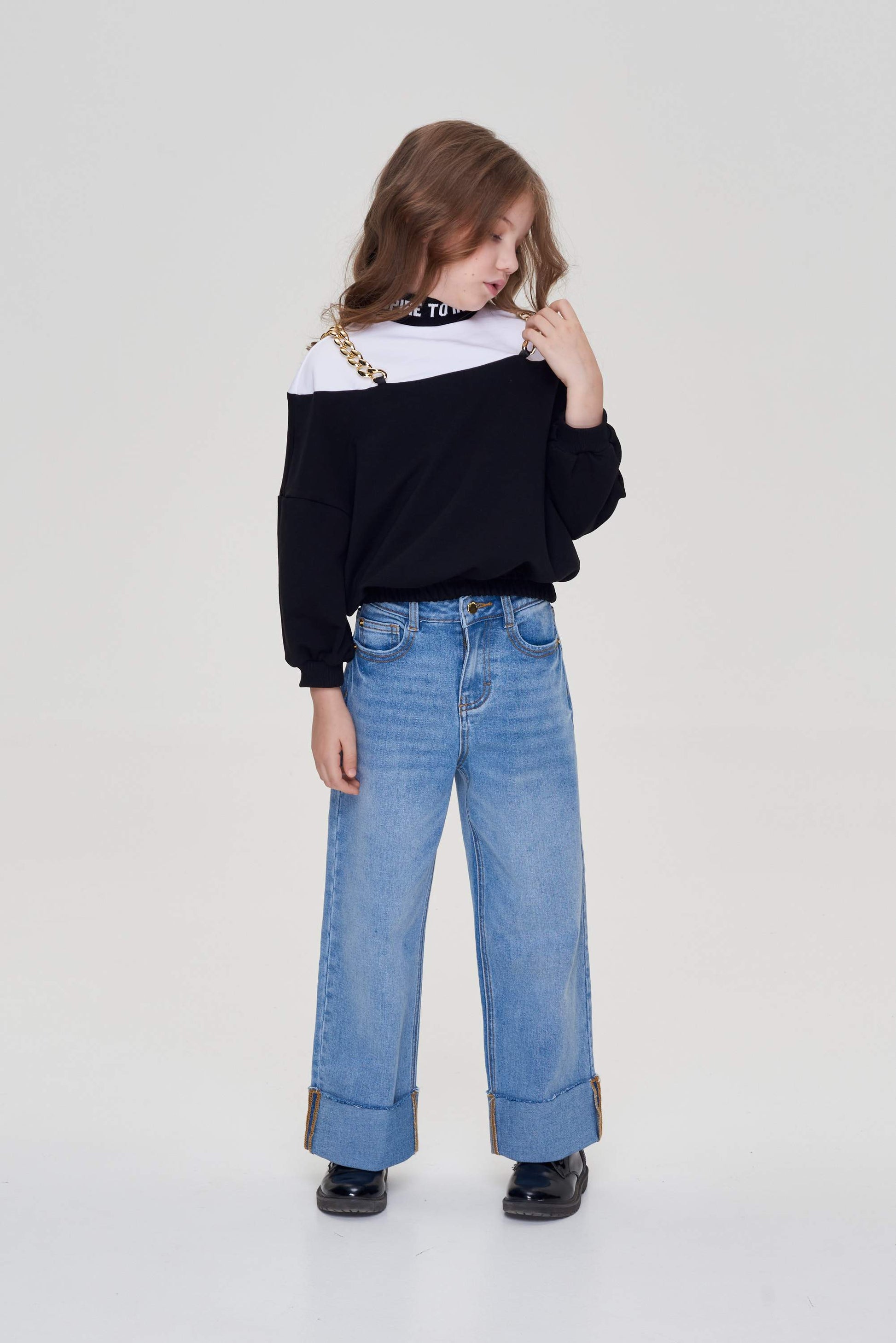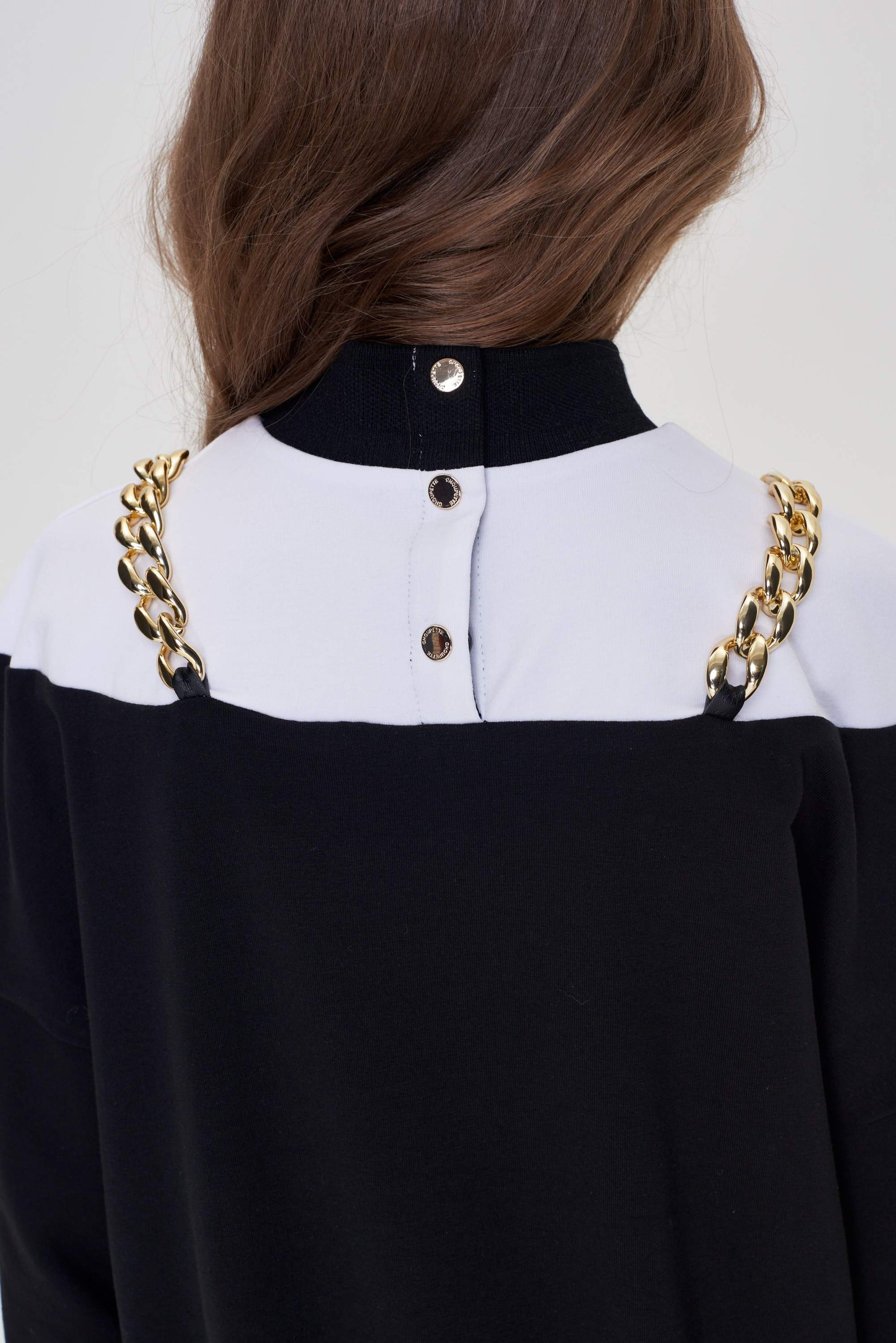 A combined fashionable jumper for girls is created for modern little fashionistas. Natural knitted knitwear holds its shape well and is pleasant for delicate children's skin. The spectacular design consists of a free silhouette and decorative strap chains. The neck of the jumper is decorated with an elastic stand collar with a funny inscription. The edges of the sleeves and the bottom of the product are treated with elastic inserts for ease of fit.