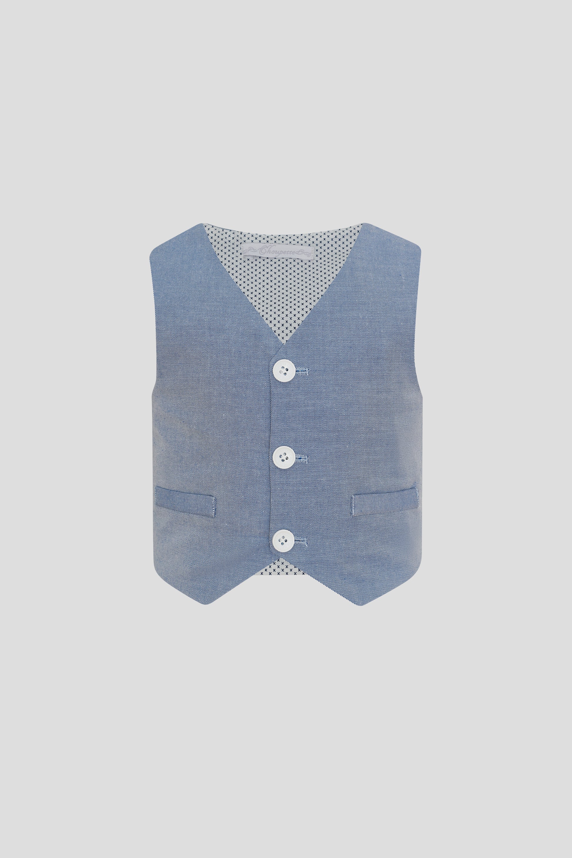 An elegant waist coat for boys is perfectly designed as the costume for his very first party. Crafted with textured fabric it carries an emphatically adult design, which creates a touching contrast with the age of the baby. The iconic style indicates traditional details like a curly bottom and a clasp with three buttons. On the shelves, there is an imitation of slotted pockets with a leaf.
