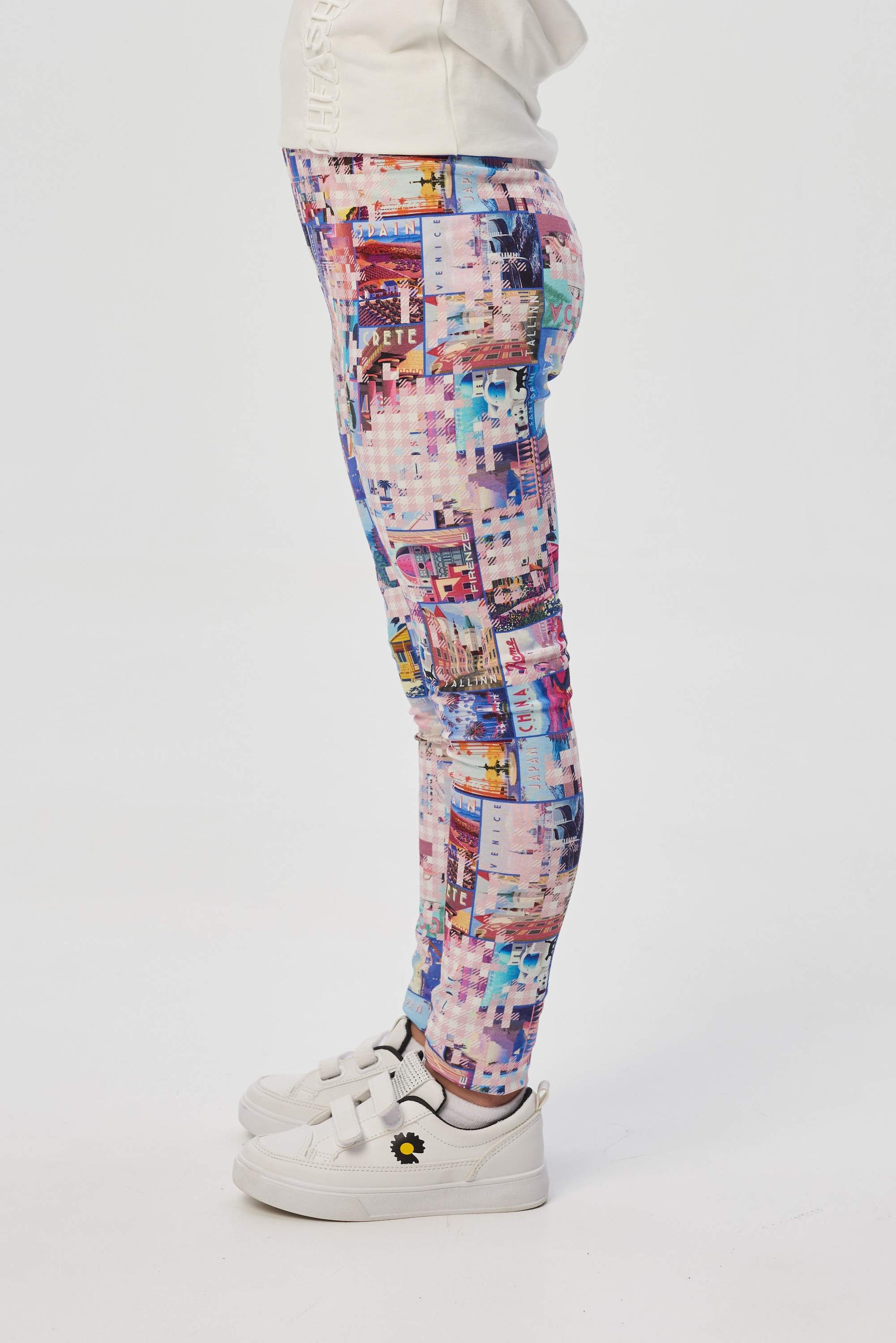 Leggings with a proprietary print for a girl will like a young fashionista who likes to spend time in constant movement. A seamless model with an abstract pattern in a white-pink-blue gamut. A wide stange belt provides a comfortable landing at the waist.