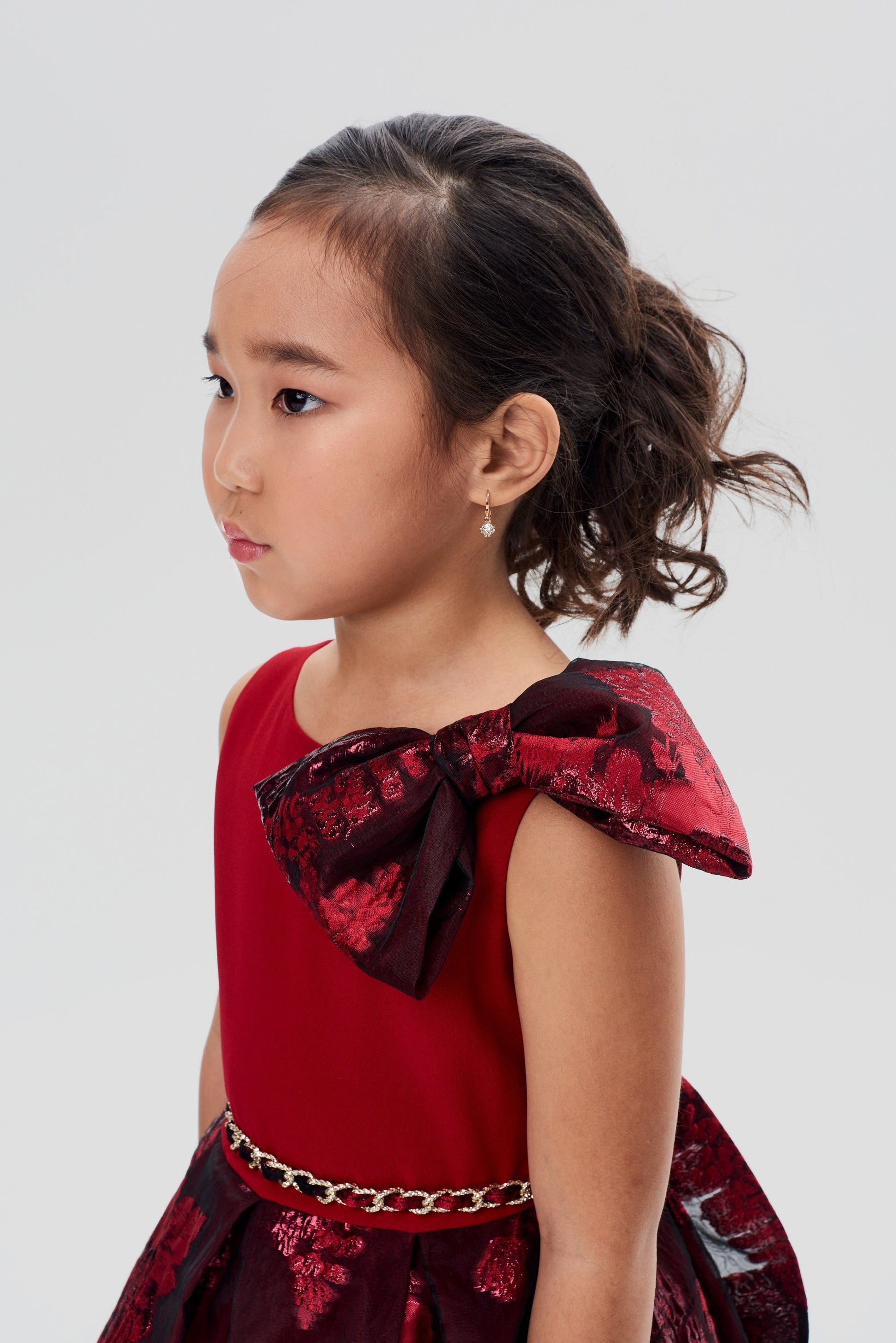 Luxurious cotton-lined ball gown for girls. It's hard to look away from the bright outfit. The real Carmen? Red color is one of the most favorite among active restless fashionistas. A fitted, off-the-shoulder bodice with a plunging back cut into a full skirt in translucent, airy weave with a designer print. There is a nice bow at the waist at the back, the same decor is on the shoulder. The original detail is a shiny chain on the belt.