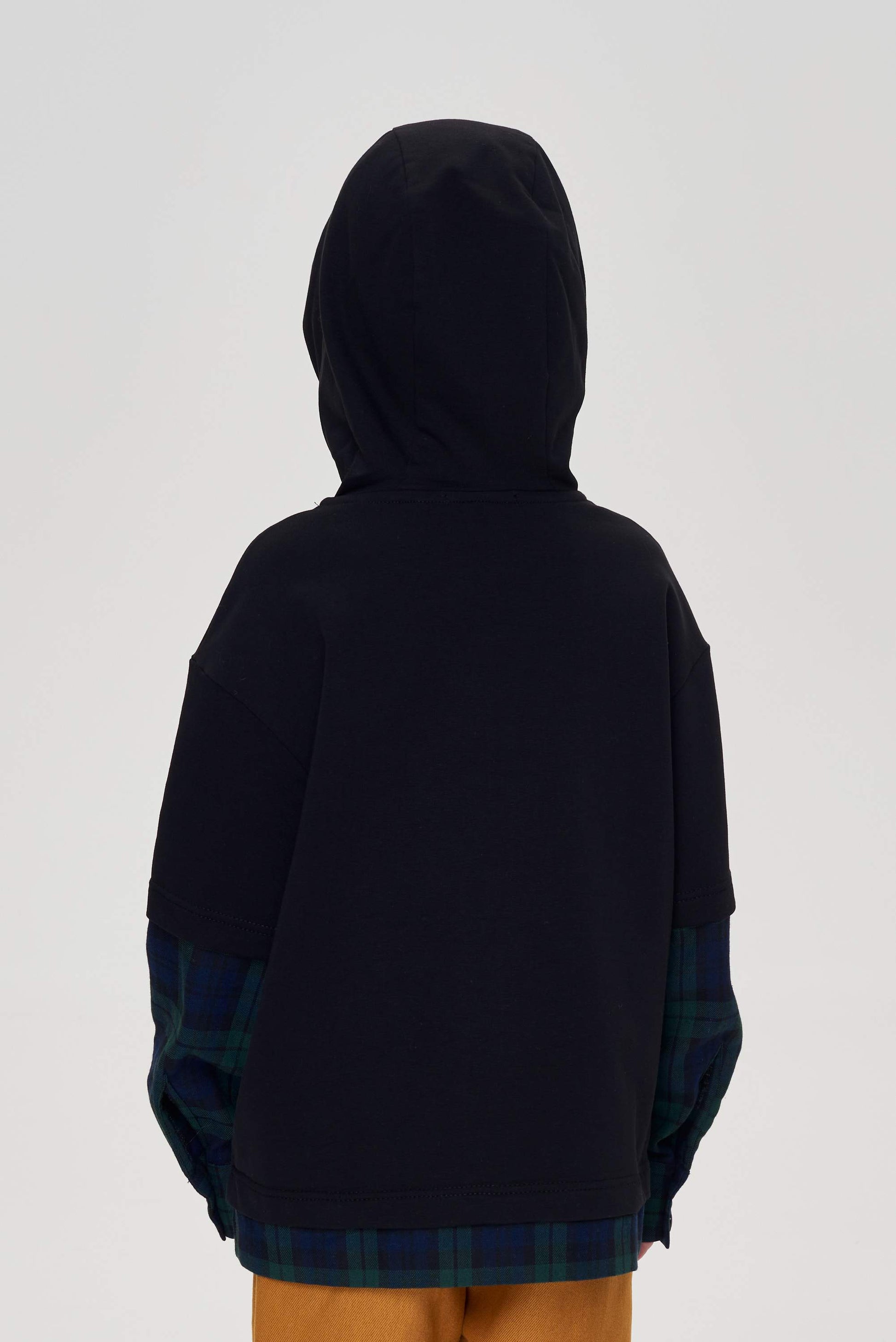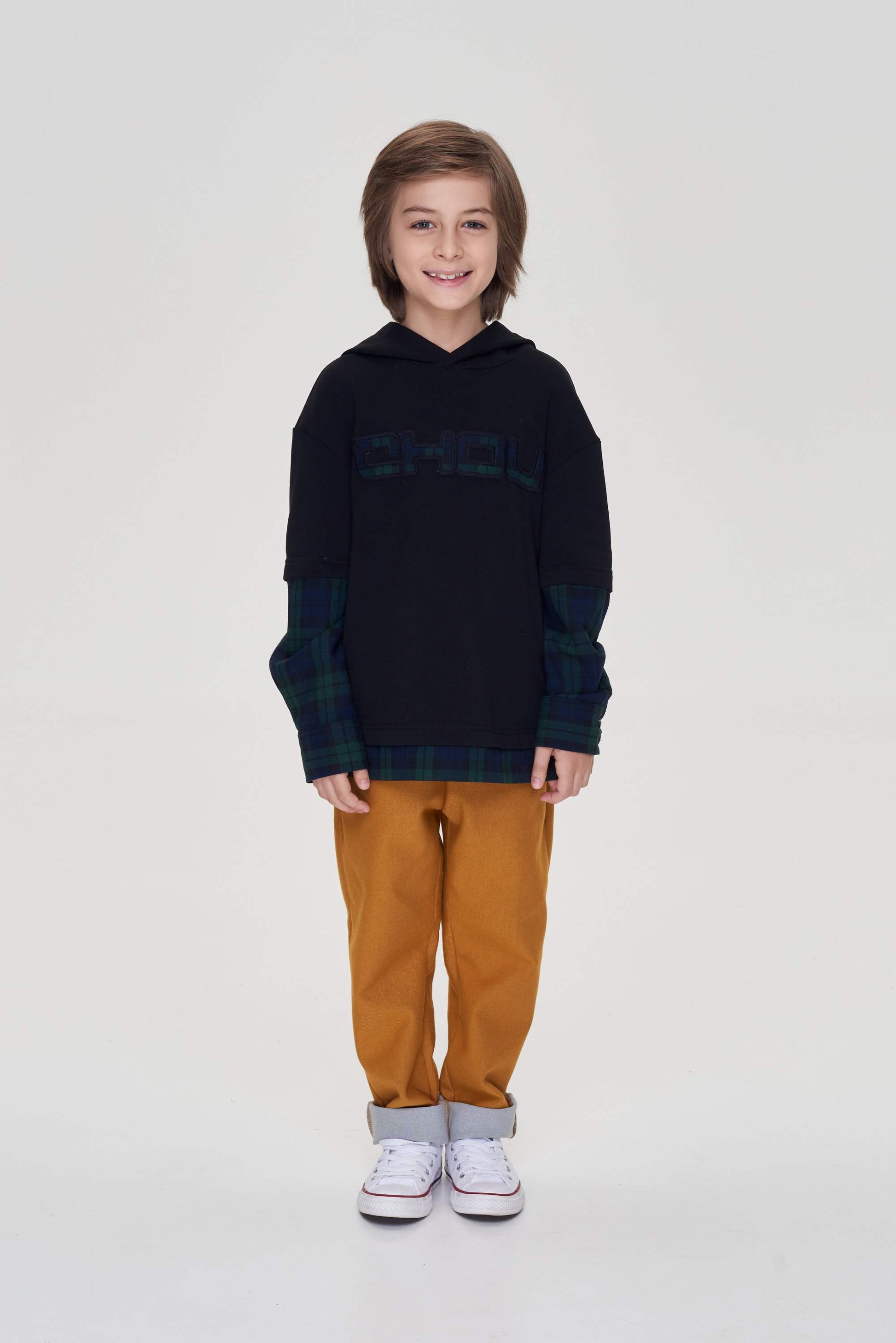 Great solution! An interesting outfit with a hood will allow you to stand out among your peers. The original combined sweatshirt for a boy, the decoration with a fashionable cage looks very impressive. A comfortable product in the style of Family Look from cotton knitwear will become a beautiful and convenient option for everyday wear, such a thing will make a wonderful tandem of loose trousers and sneakers. Your child will look stylish and modern.