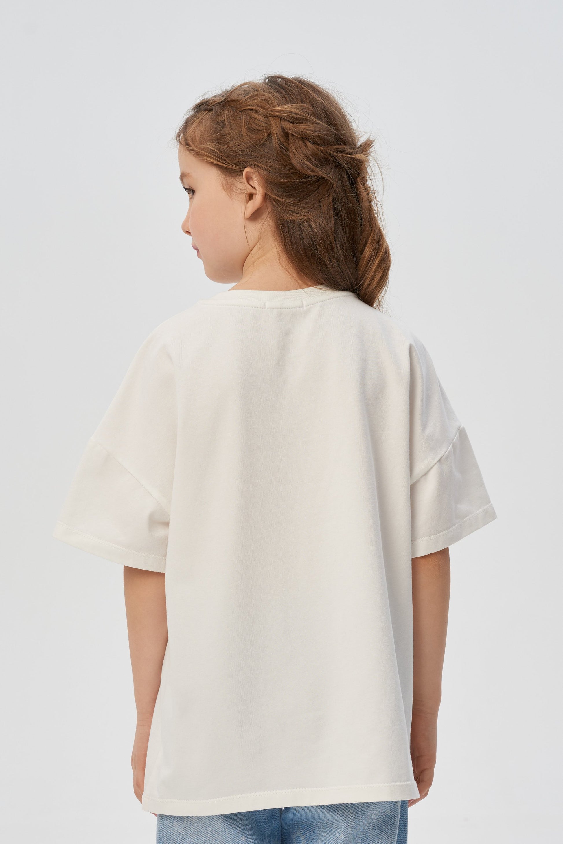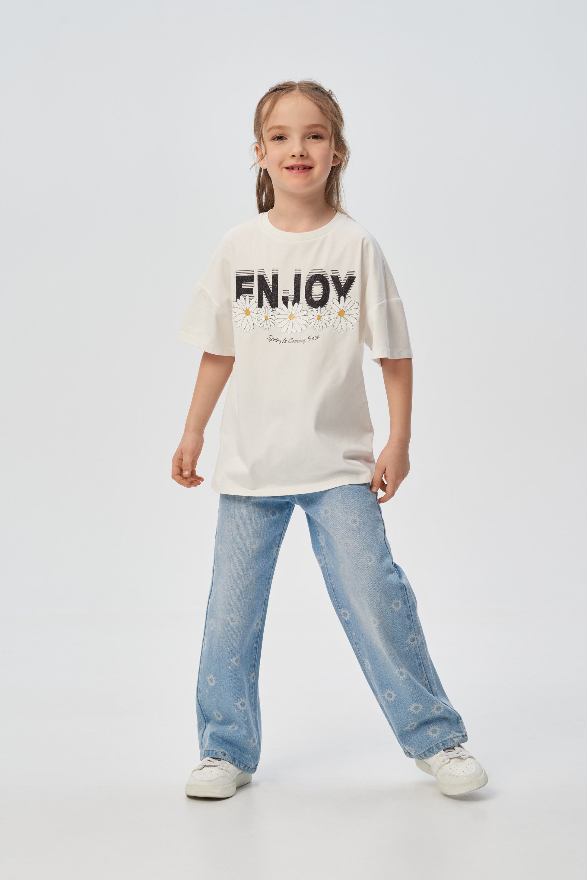 A white straight cut T -shirt for a girl is a great option for every day. A short sleeve model, a semicircular neckline is processed with a white fake. In front of a contrasting print with a voluminous inscription "Enjoy" in the half-crowd of daisies.