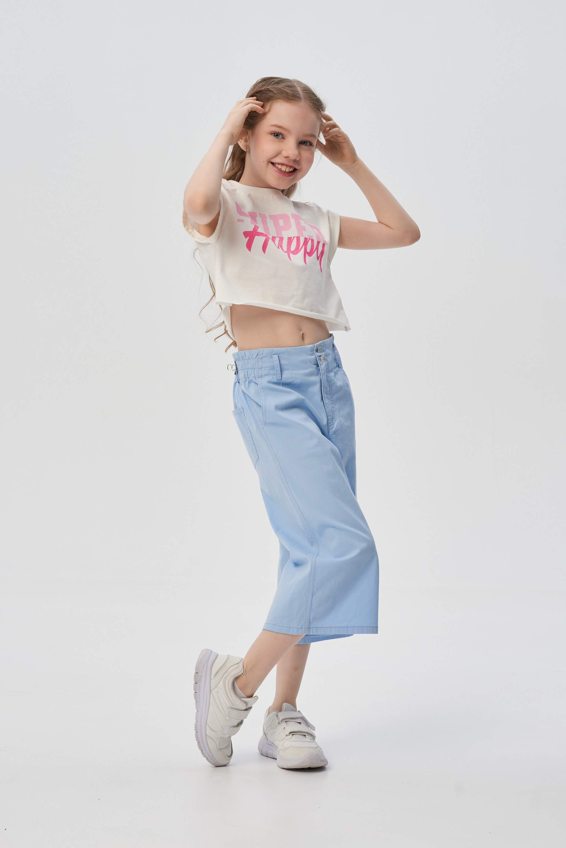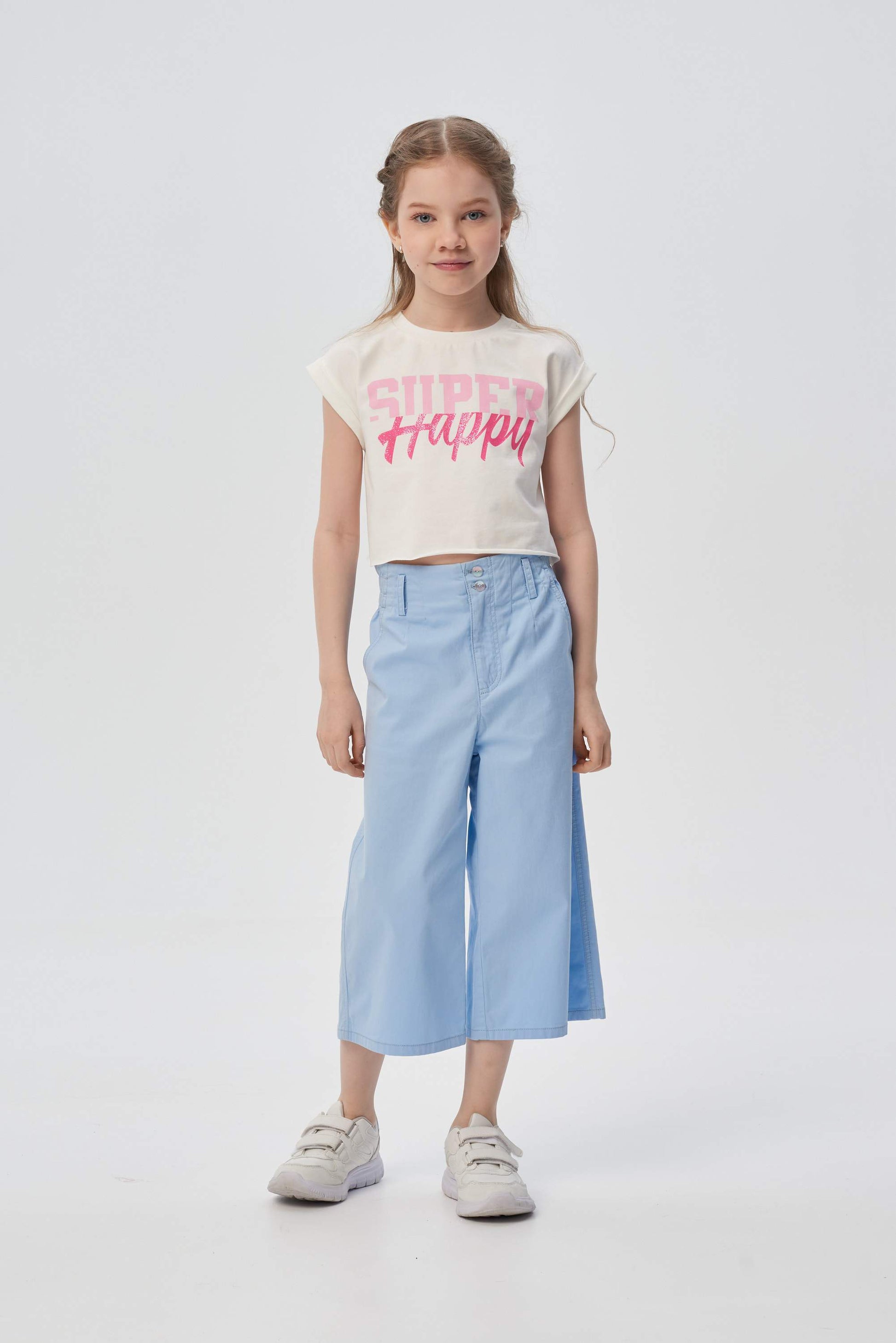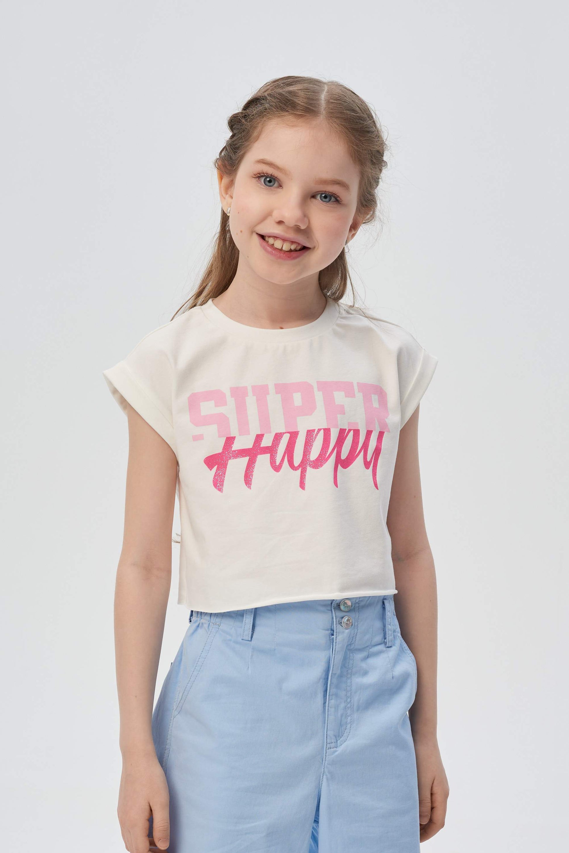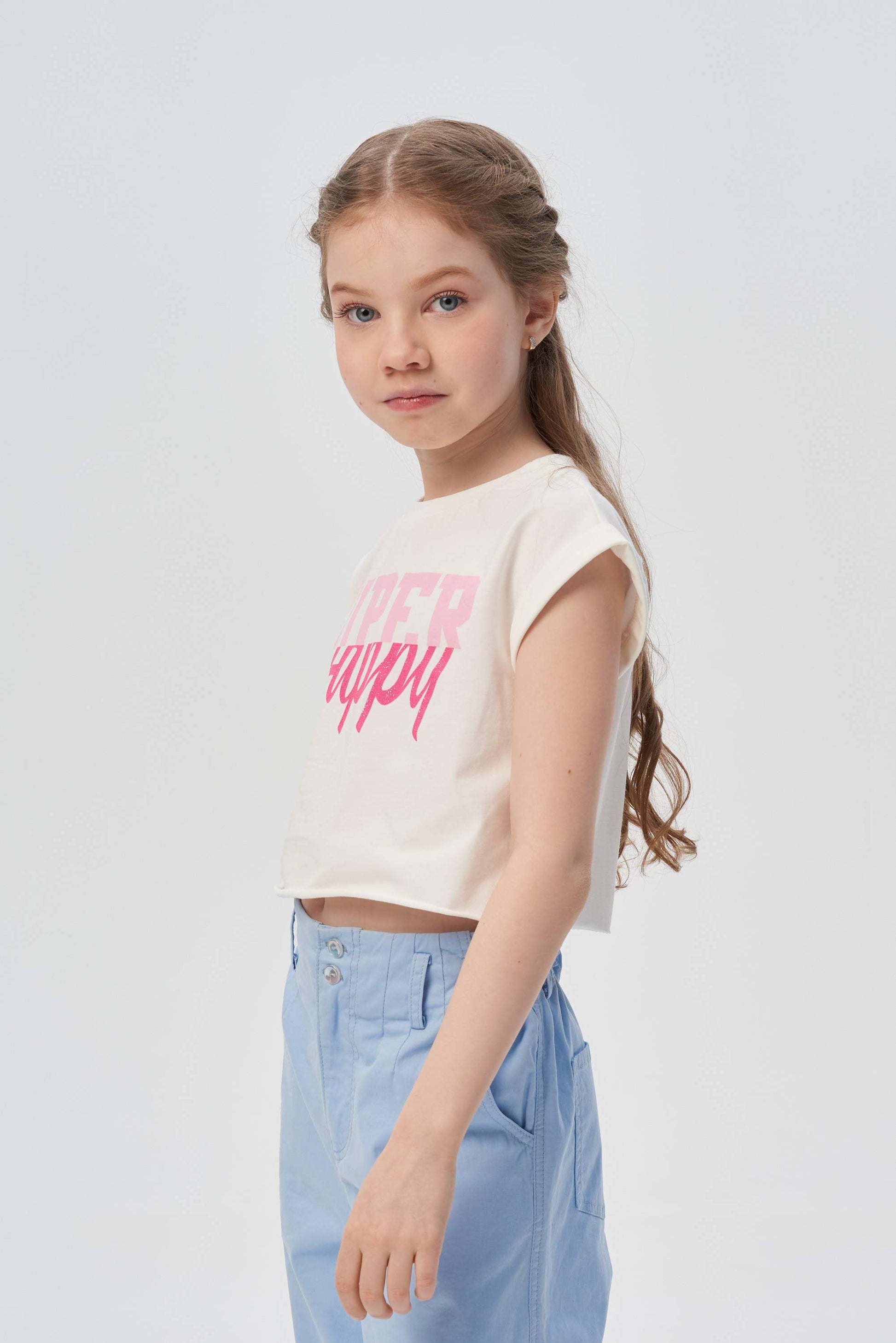 A wonderful model for a girl. Croup-tops confidently ascended the fashion podium this season! Such an element of the wardrobe approaches any style of clothing and sits perfectly on the figure. The short top of the stylish shade of Ecru goes well with various skirts, trousers and shorts. A cotton model with wing sleeves is decorated with a bright design print.