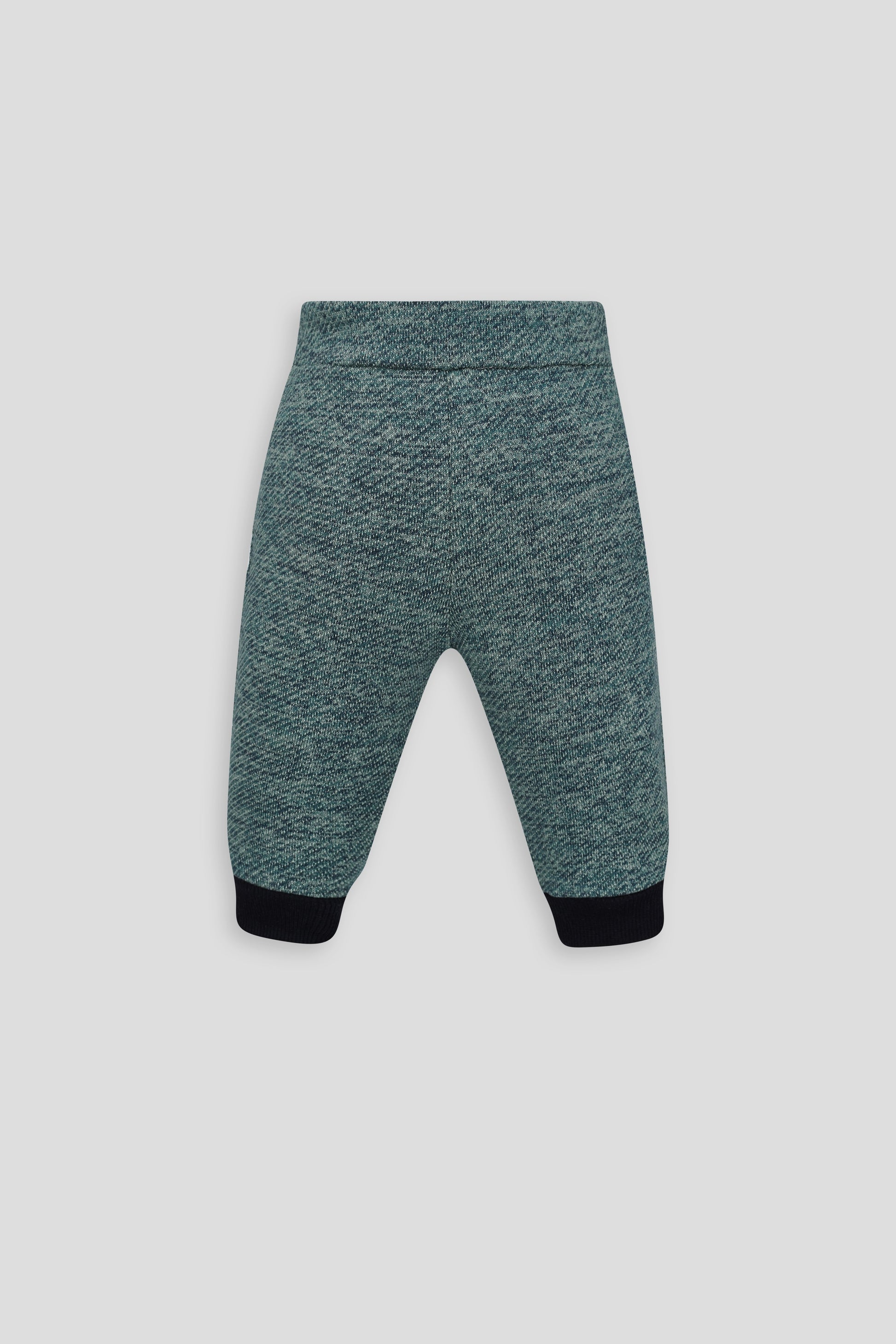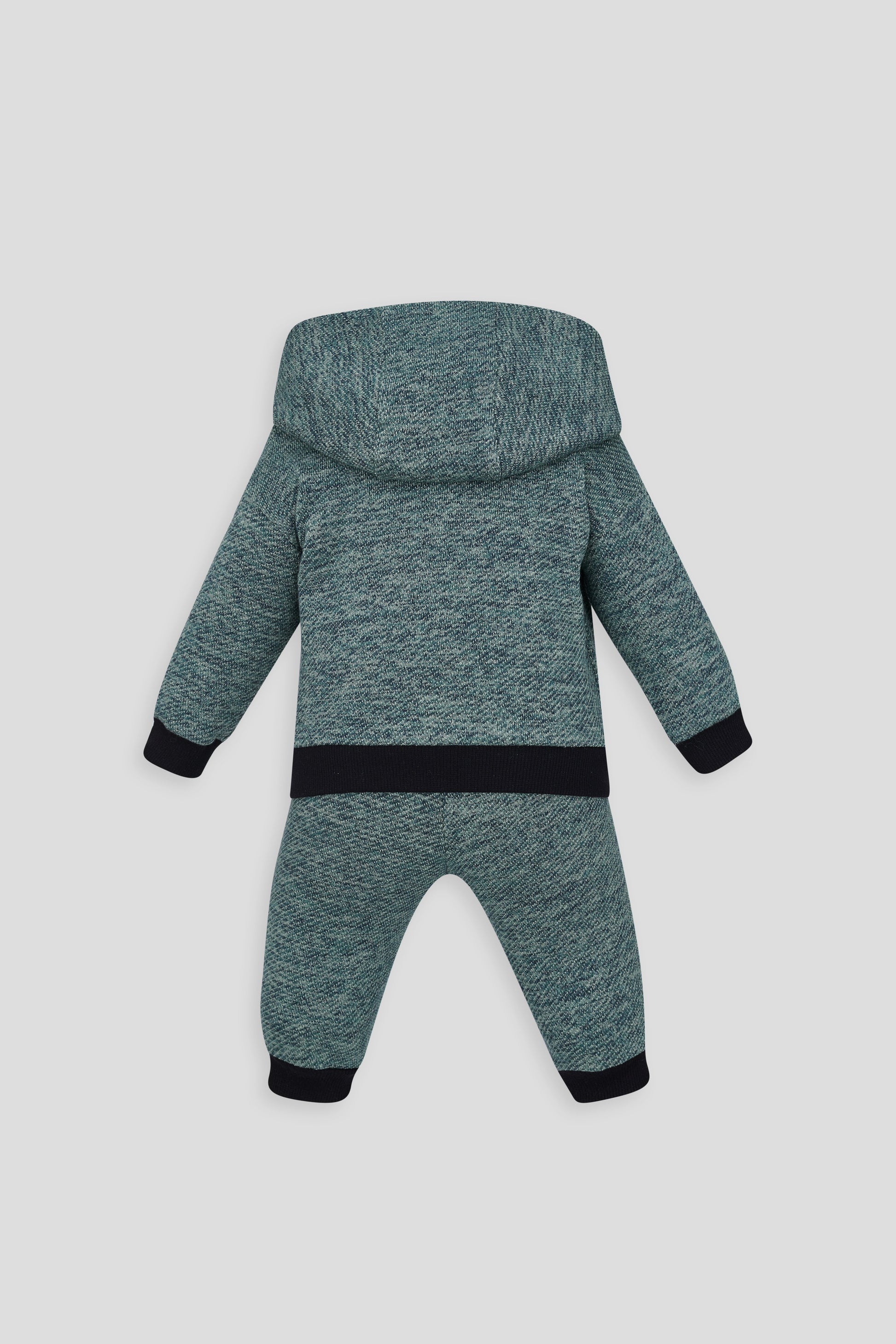 Fashionable pantsuit for the boy is made of soft footer of turquoise shade with a mélange pattern. The jacket with a zipper is decorated with an unusual textured application that will attract the child's attention. A cozy hood will serve as an additional insulation for the baby's head. Contrasting inserts with a checkered pattern on the sleeves echo the same inserts on the trousers. The suit made of natural fabric is pleasant to the delicate skin of the baby, does not stretch and perfectly manifests itself in wear.