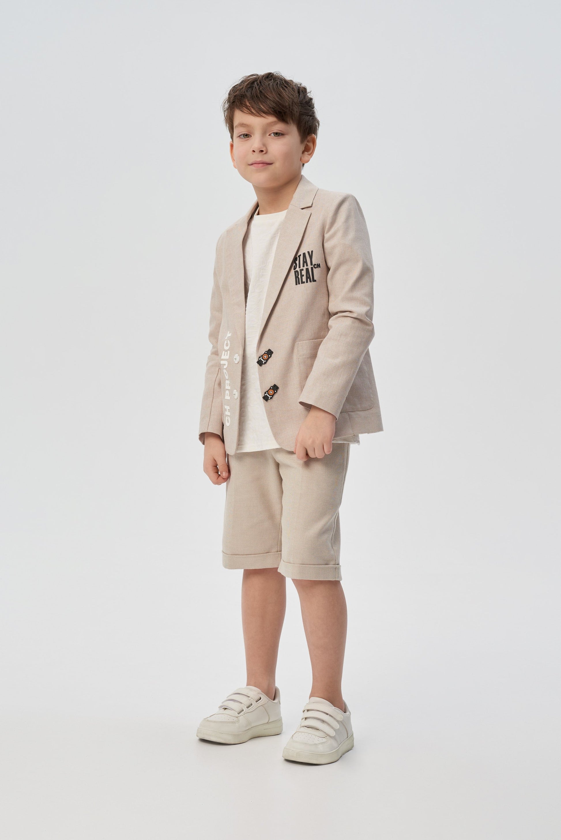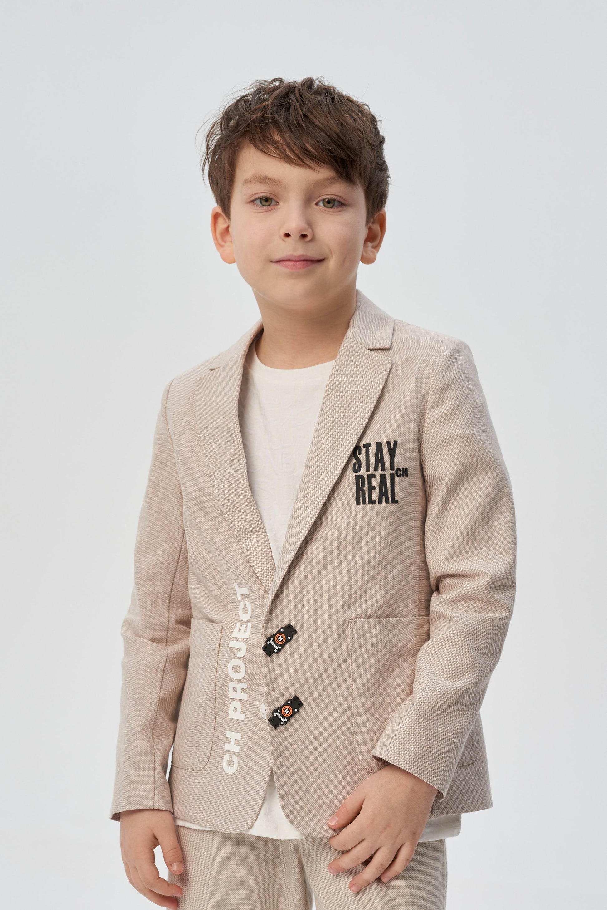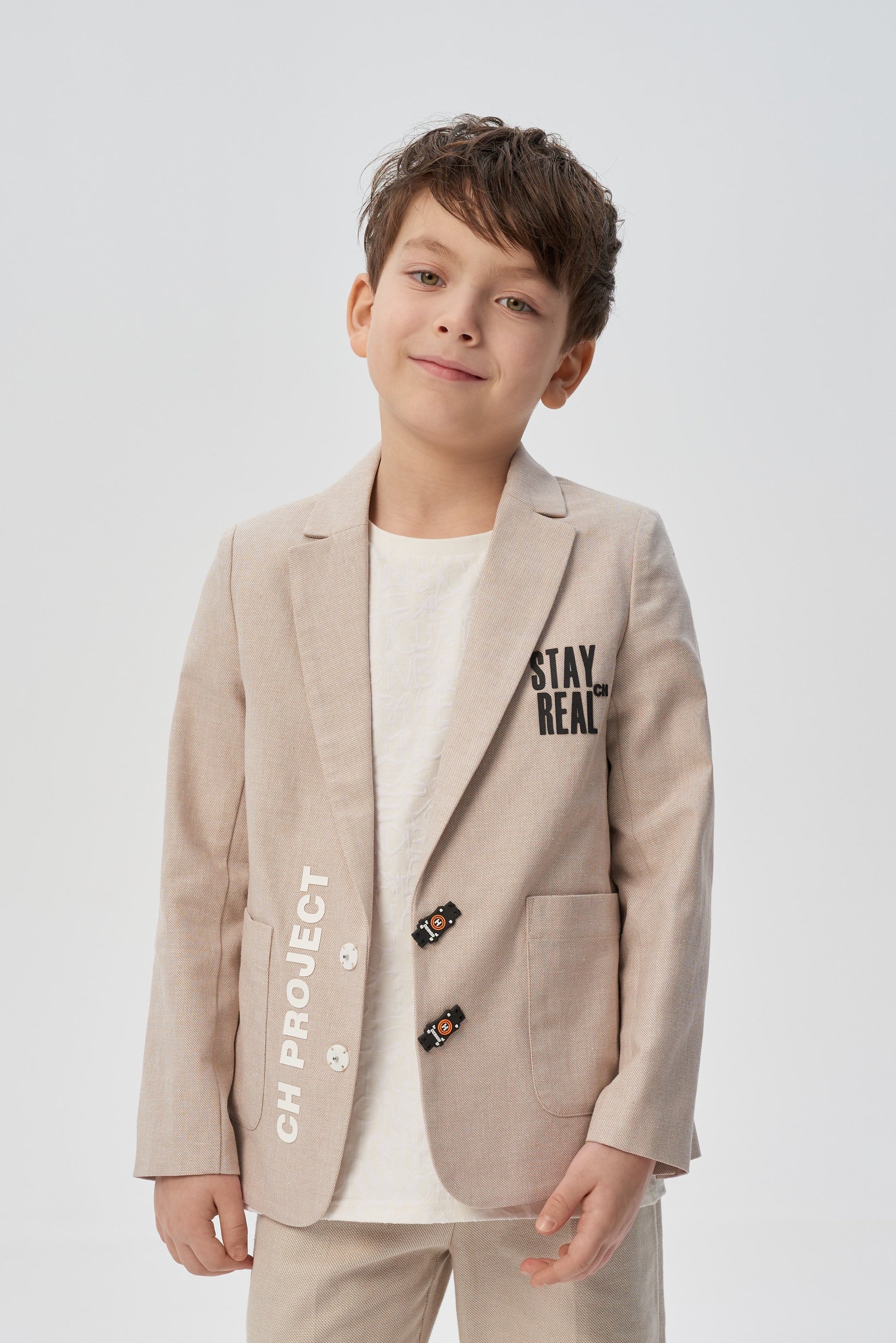 A stylish single-breasted jacket for a boy is an indispensable thing for special occasions at school or kindergarten. A magnificent model of a semi-adjacent silhouette is made of dense cotton fabric of a noble sandy color. Fastening with two black buttons of an unusual shape. Front two patch pockets. Contrasting letter prints on both shelves bring a casual touch to the design.