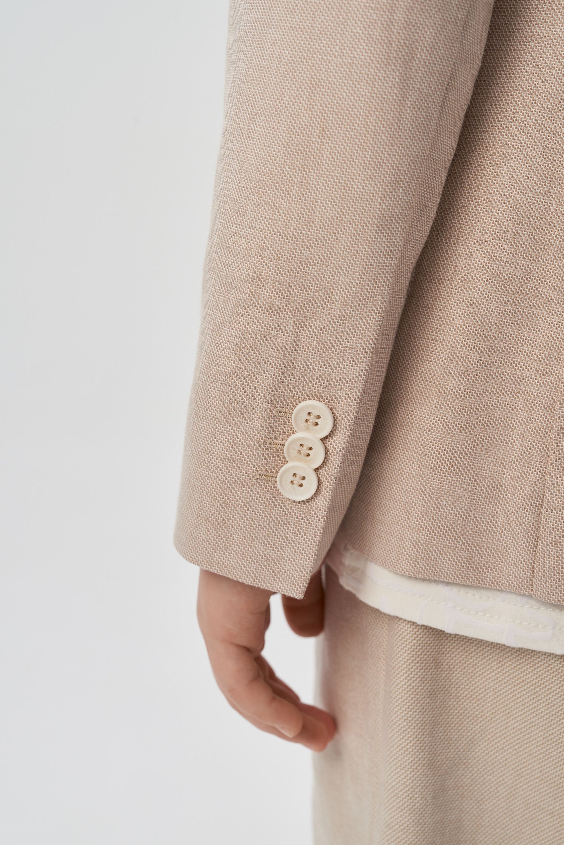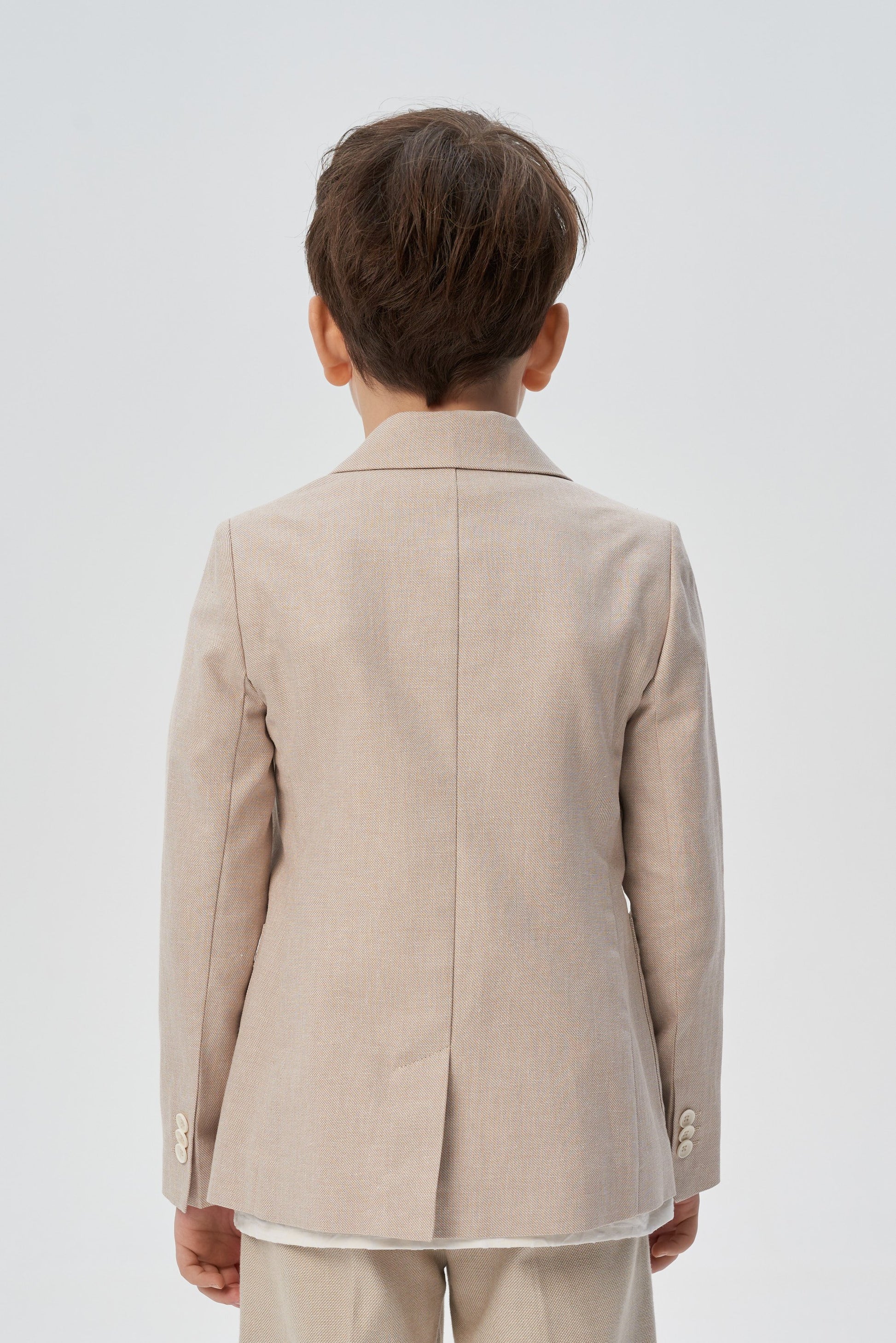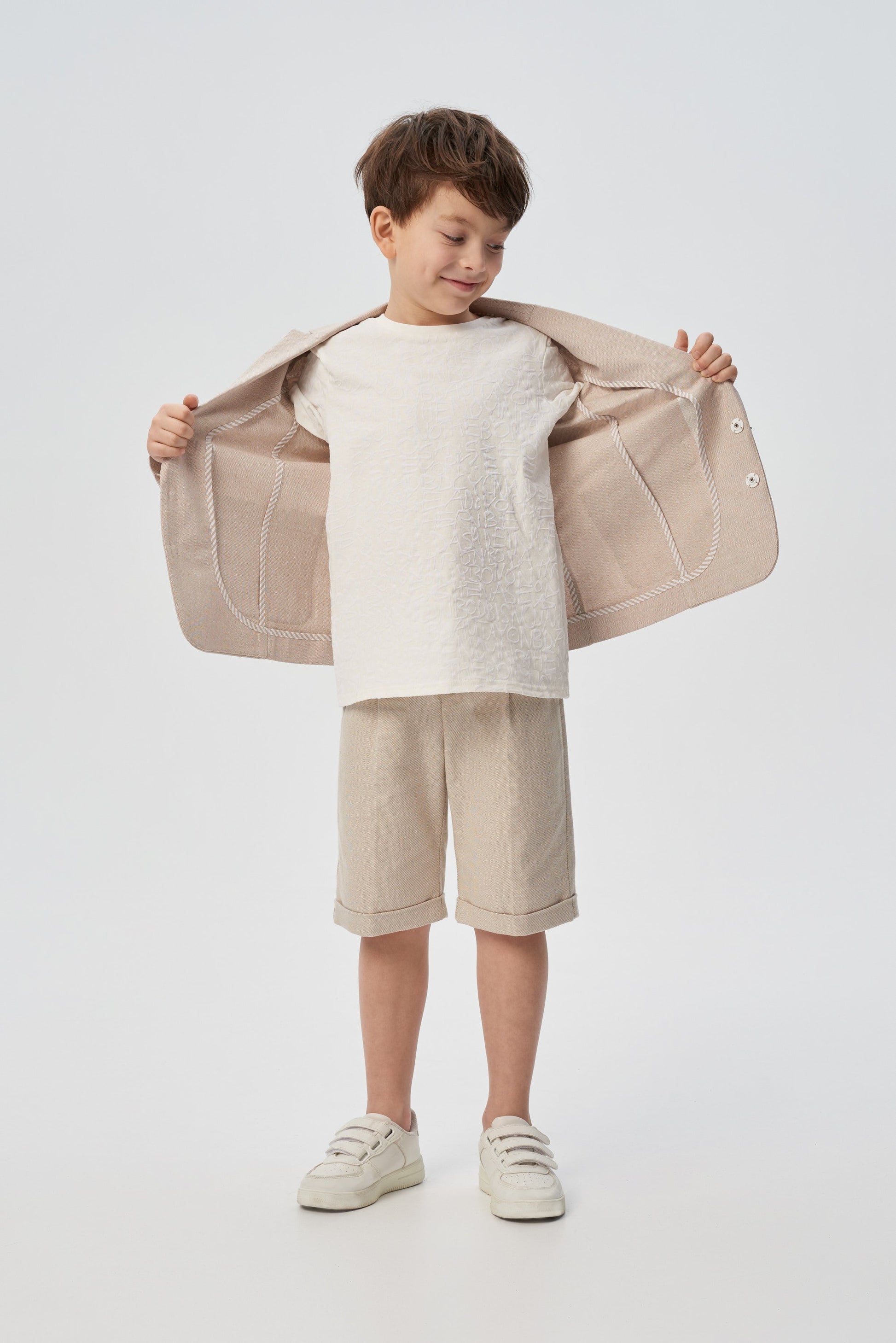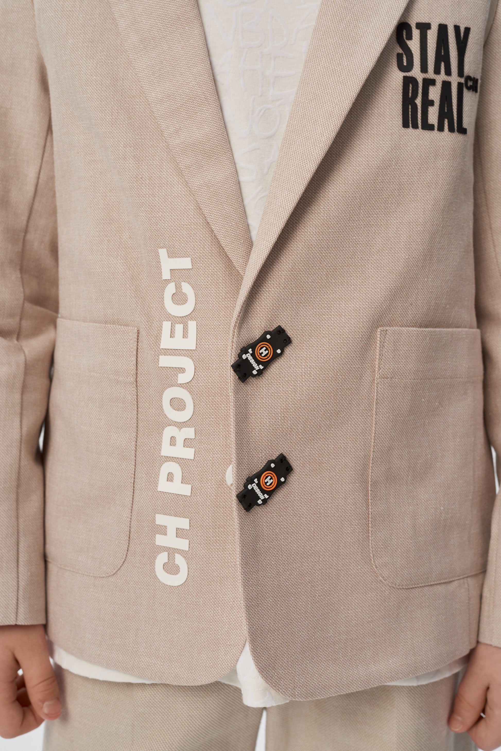 A stylish single-breasted jacket for a boy is an indispensable thing for special occasions at school or kindergarten. A magnificent model of a semi-adjacent silhouette is made of dense cotton fabric of a noble sandy color. Fastening with two black buttons of an unusual shape. Front two patch pockets. Contrasting letter prints on both shelves bring a casual touch to the design.