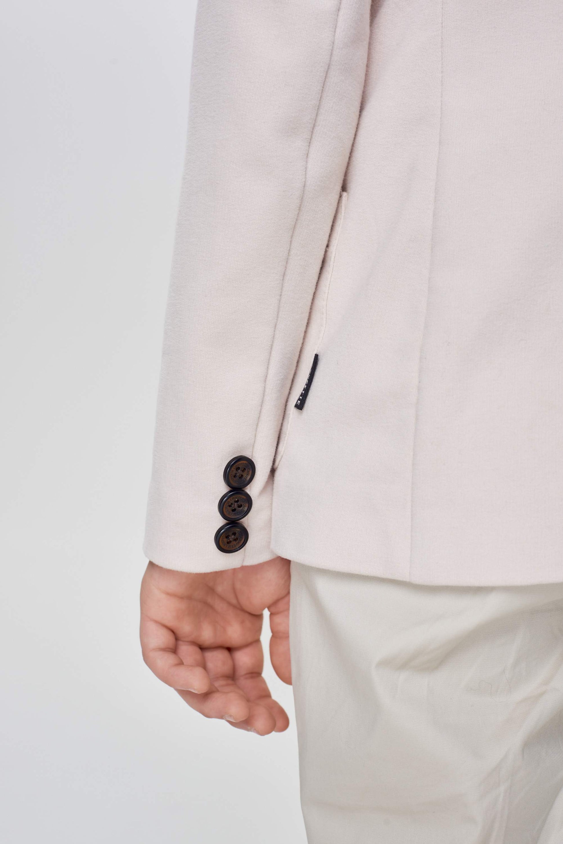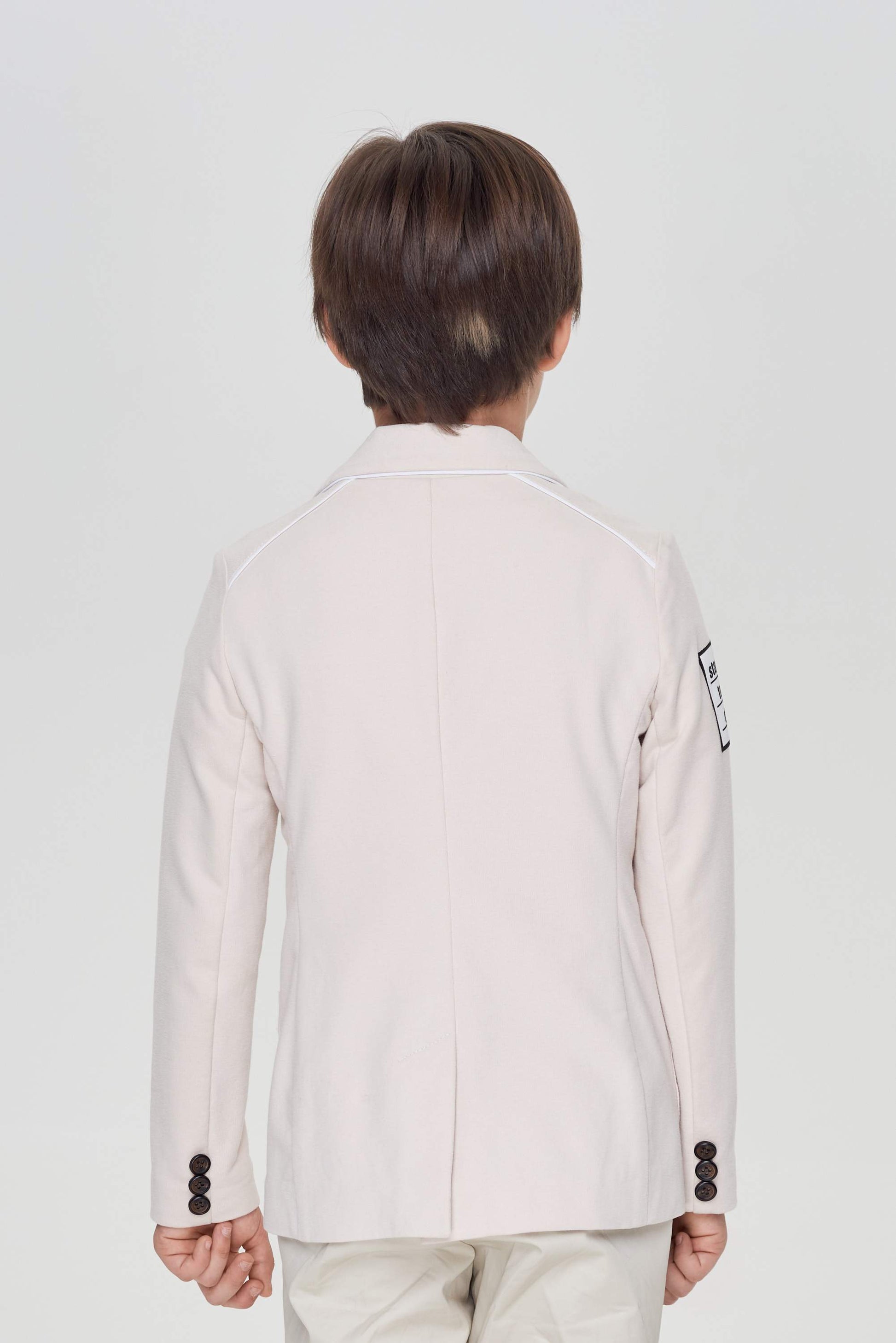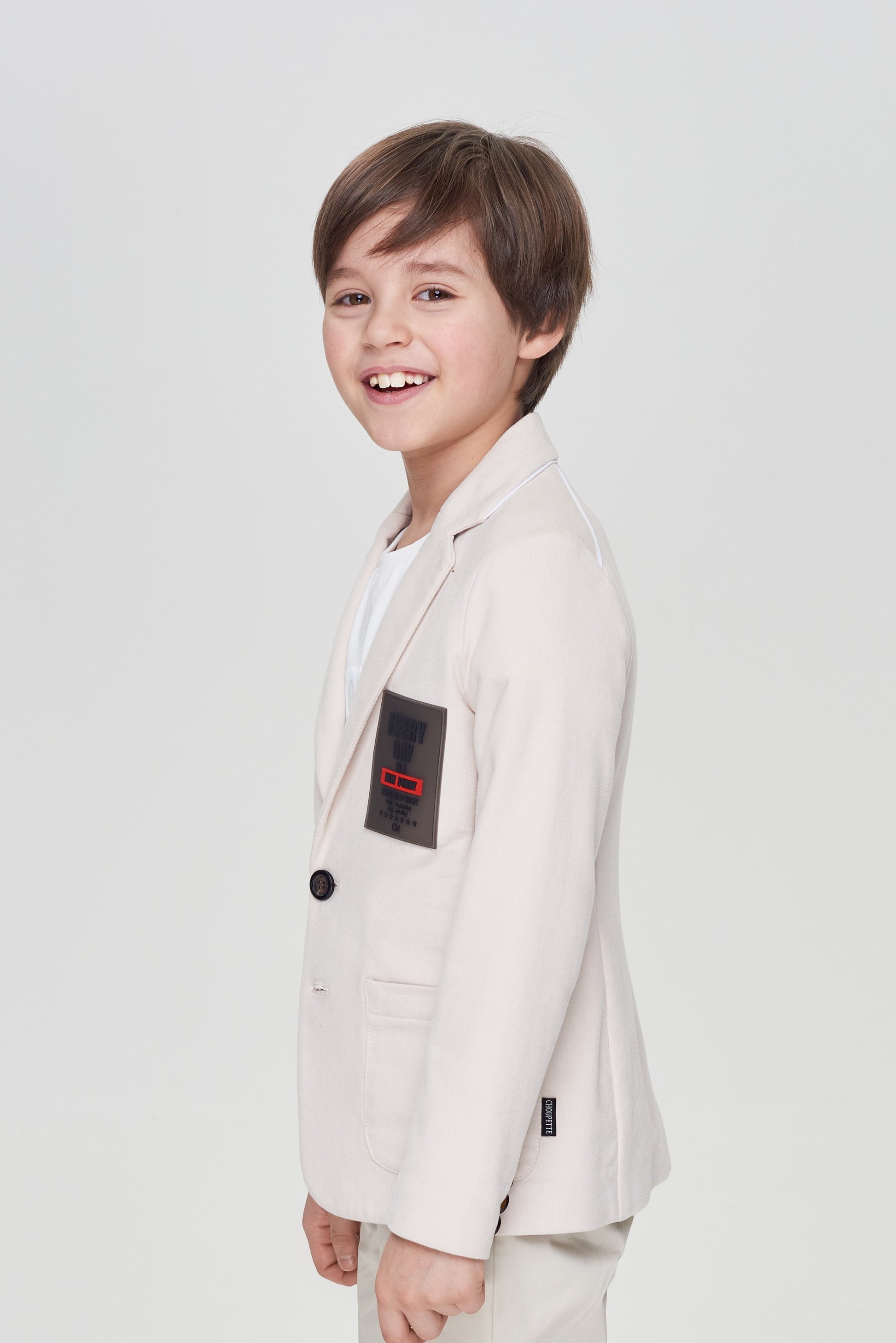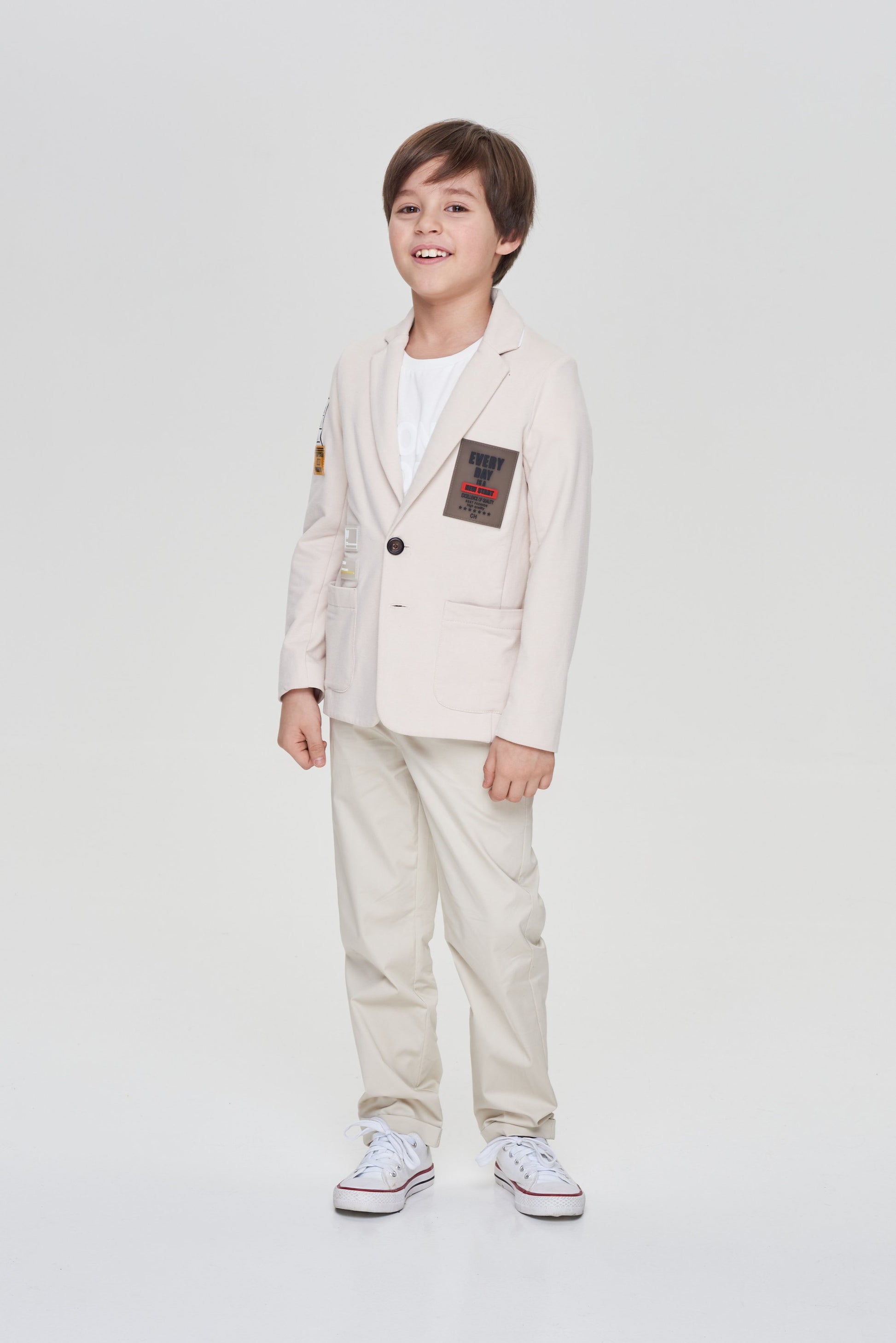 A young dandy. A classic double-breasted jacket for a boy will create an elegant image for special occasions. The model with a turn-down collar and pointed lapels is made of plain sand-colored fabric. On the shelves are pockets with a flap. The balser closing on six buttons, the bottom of the sleeves is also decorated with buttons.