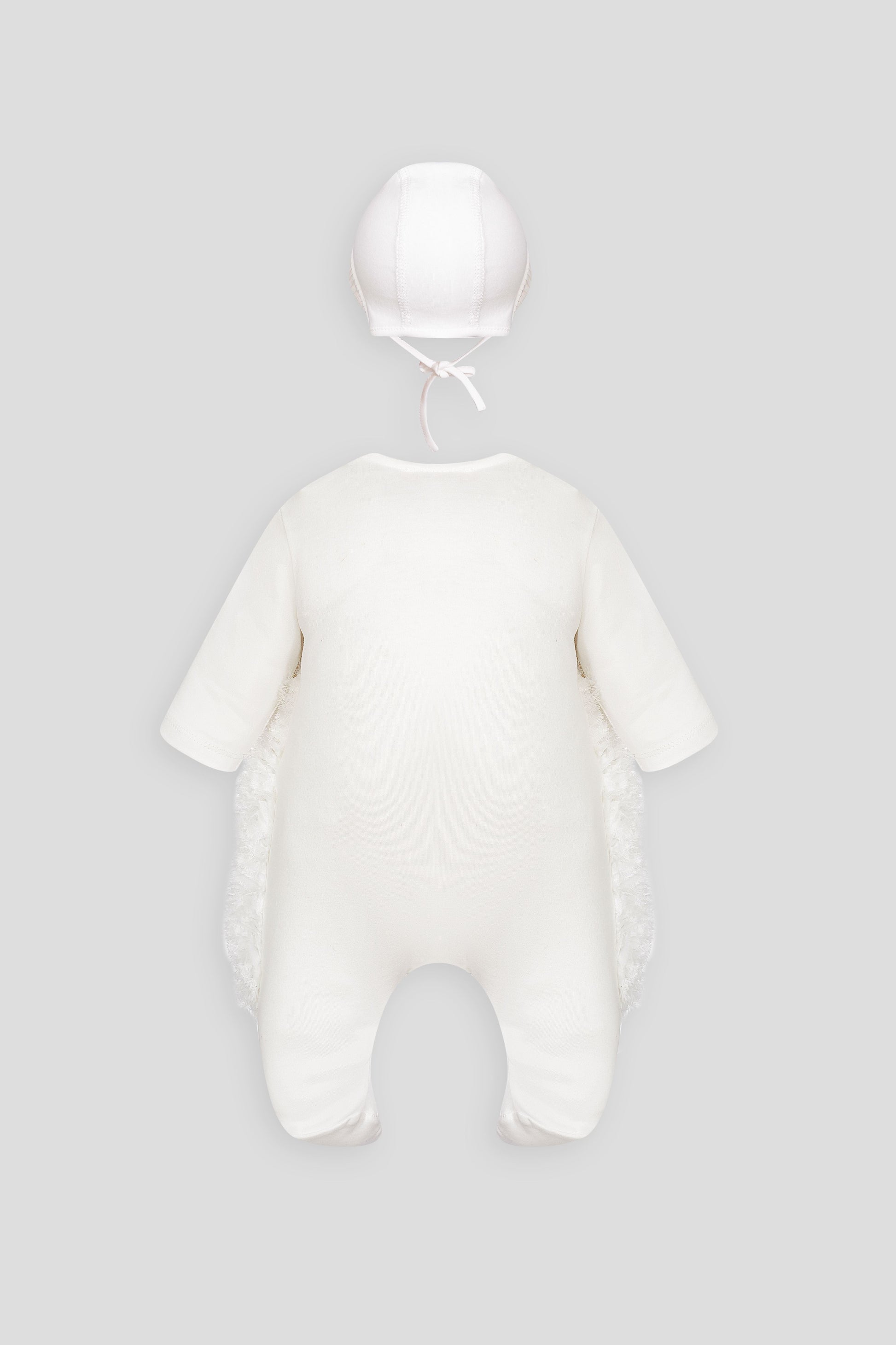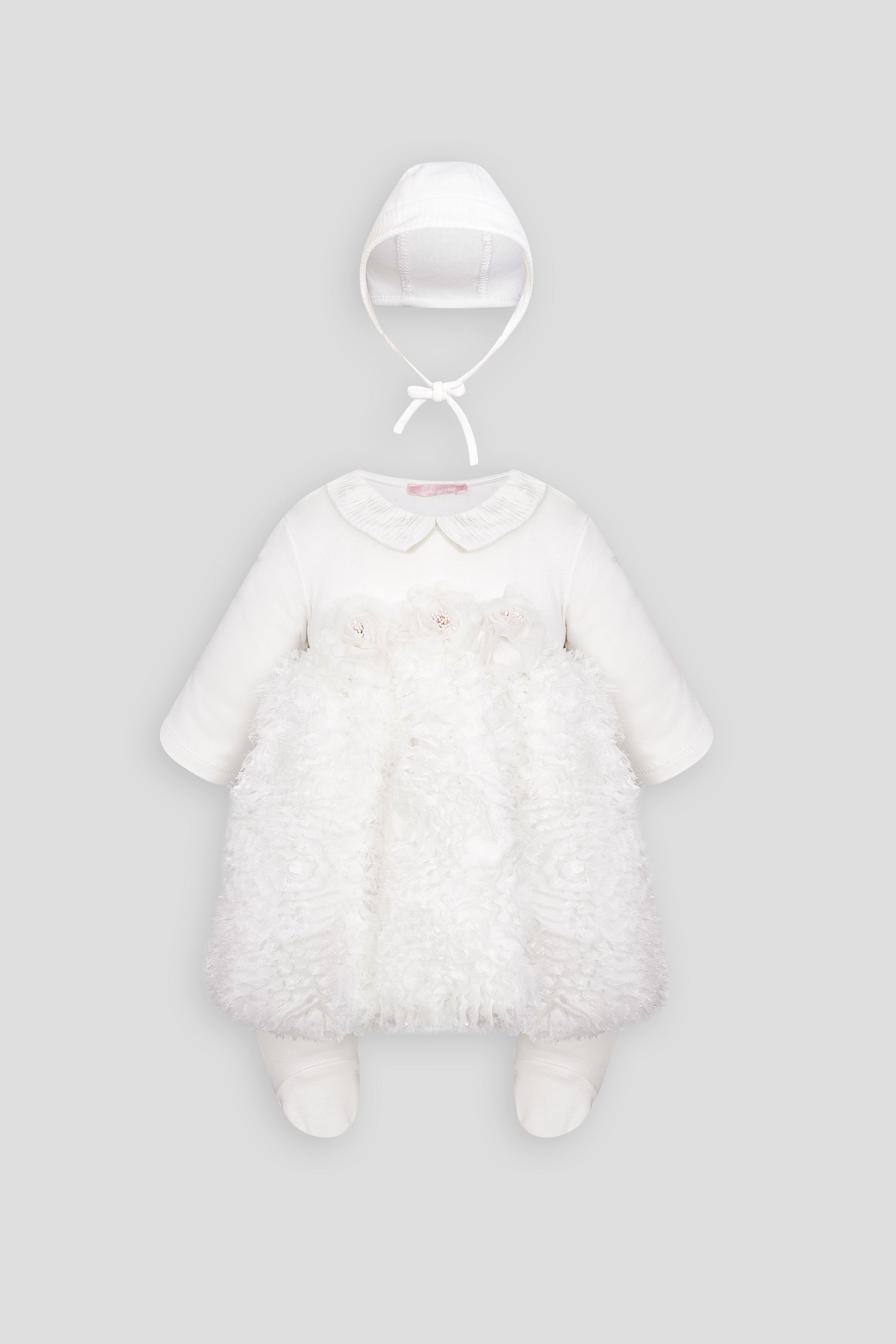 When going for a walk with your baby, don't forget a headpiece to protect them from drafts and bright sunlight. A formal set for girls consists of a delightful romper with a lace skirt and a bonnet. This charming outfit in the 'vanilla ice' shade is designed in a retro style. The finishing touches include a large lapel collar and designer floral decorations on the belt. The lining is made of natural cotton fabric.