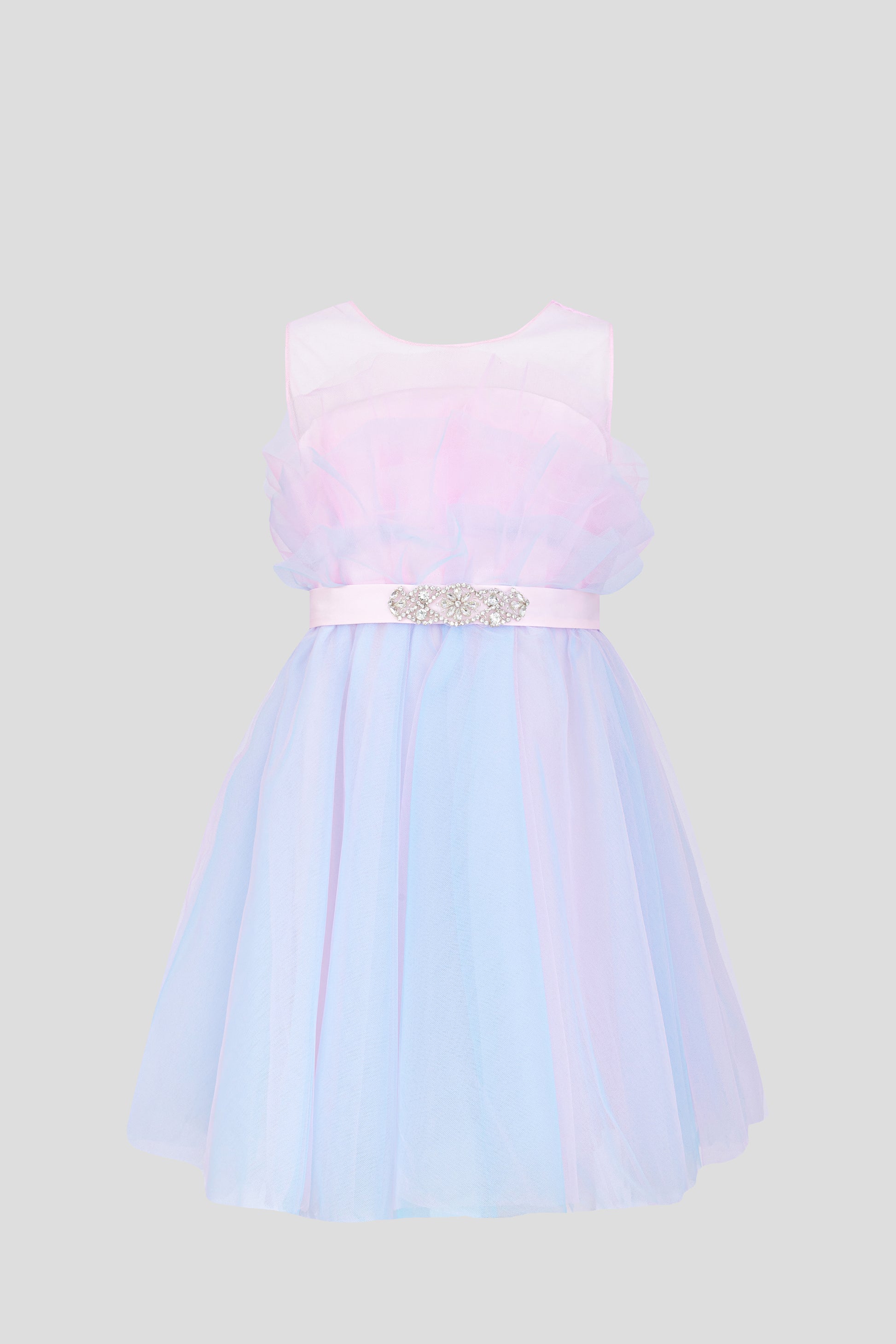 The style of this elegant dress with outstretched shoulders for the girl resembles an inverted downy tulip bud. The basis of the product is made of cotton comfortable for skin. The upper skirt of brilliant tiffany on pink fabric is supplemented by a hem from the translucent tulle, whose edge flirtingly opens up to the eyes. The dress is held on the shoulders with the help of wide transparent straps. The waist emphasizes the belt from tape.