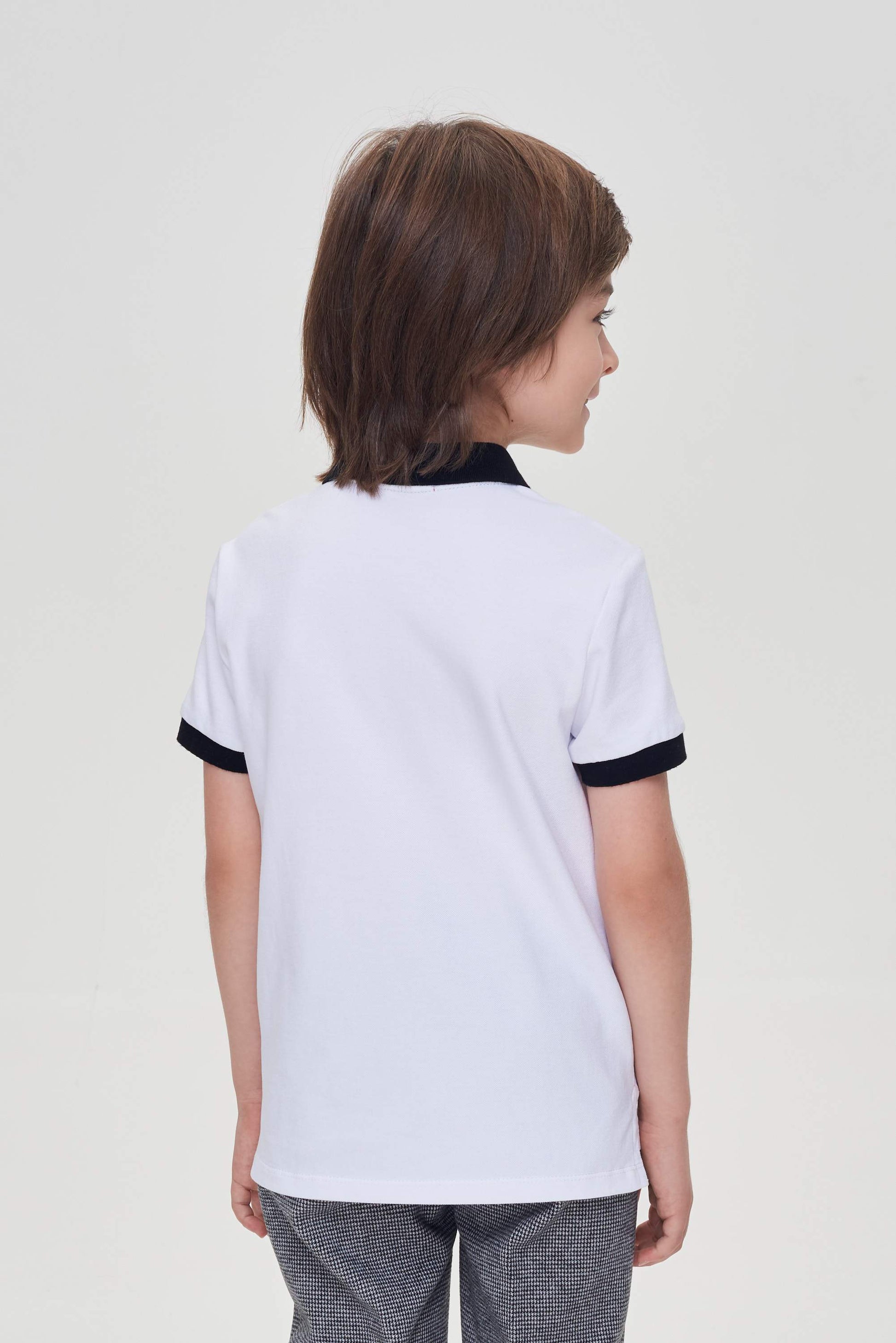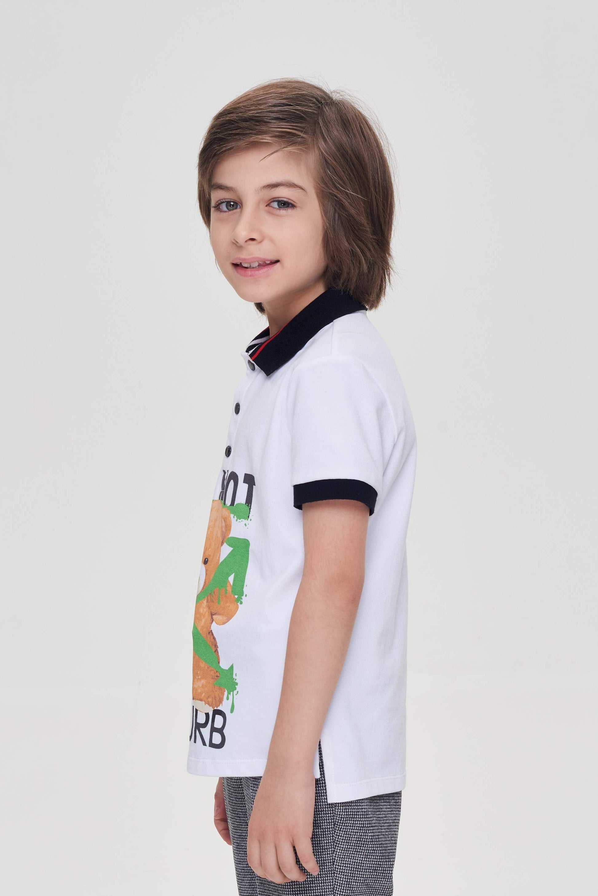 Cotton polo shirt for the boy. A wonderful example of teenage fashion in the style of street style! Such a wardrobe item is combined with many things, you can wear this jumper with jeans, tracksuits, hoodies, sweatshirts or bombers. The original knitted model with short sleeves and a polo collar is sewn from a soft breathable fabric in the shade of ecru. On the chest - creative corporate decor.