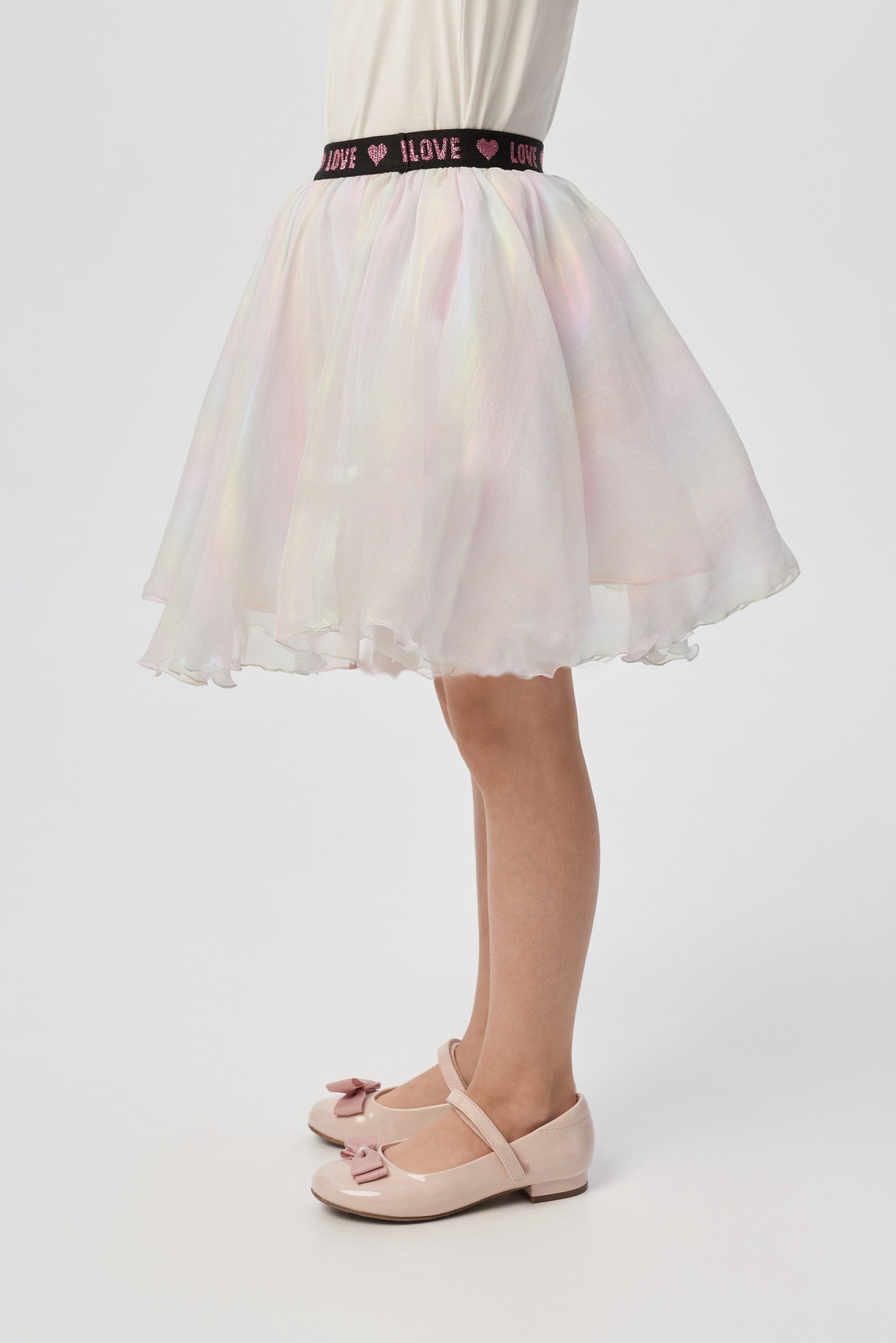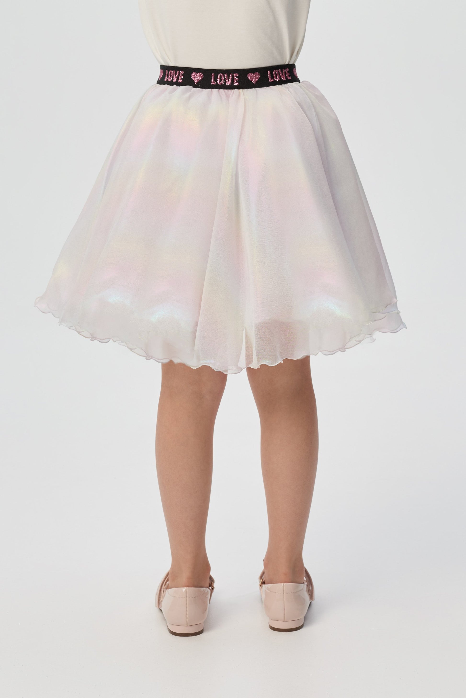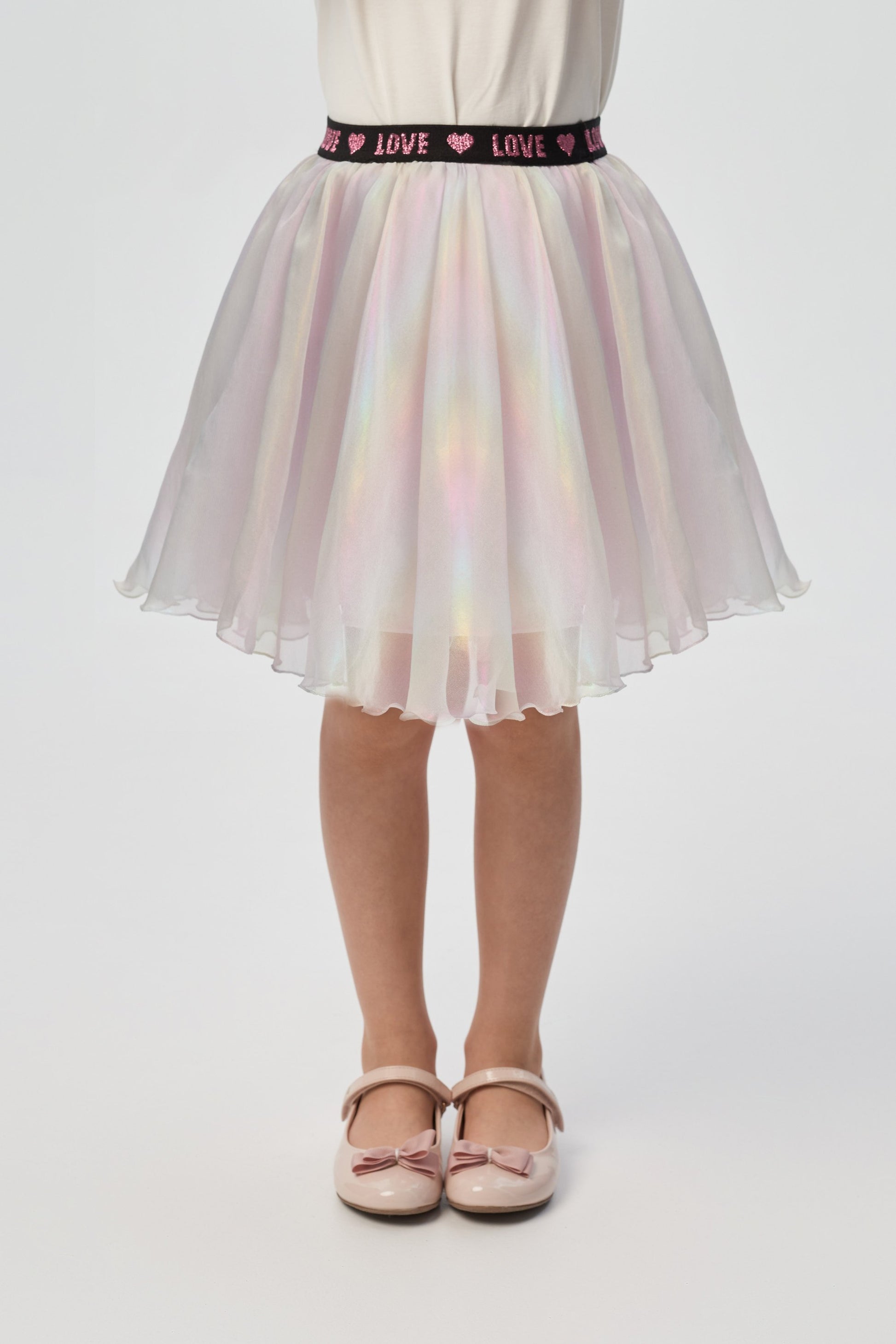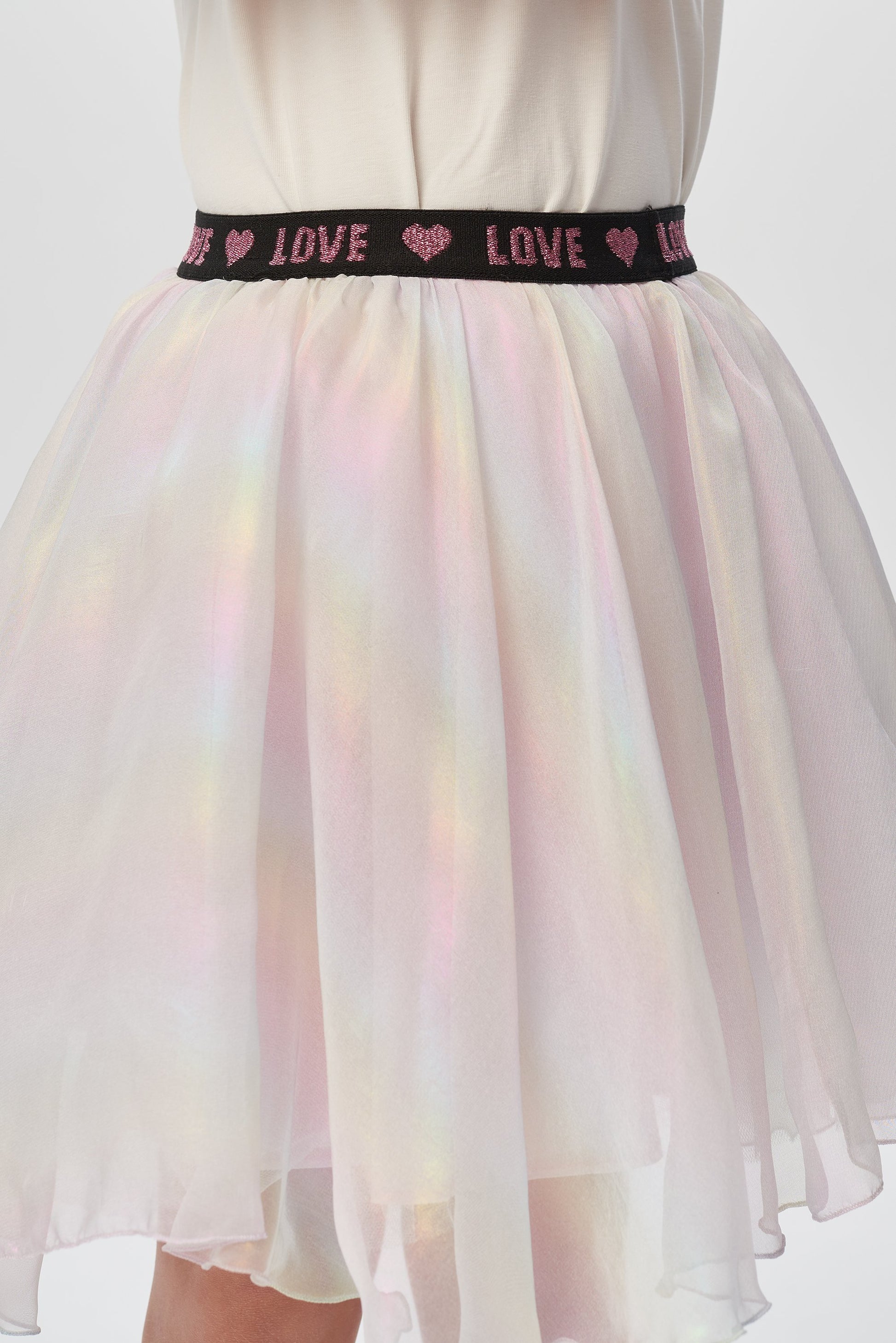 Air skirt for a girl, A skirt on an elastic belt decorated with a text print with hearts. Lush organza has an unusual color of multicolor, which plays with shades. A lining made of natural cotton is responsible for the child's comfort, so nothing threatens the delicate skin of the child.
