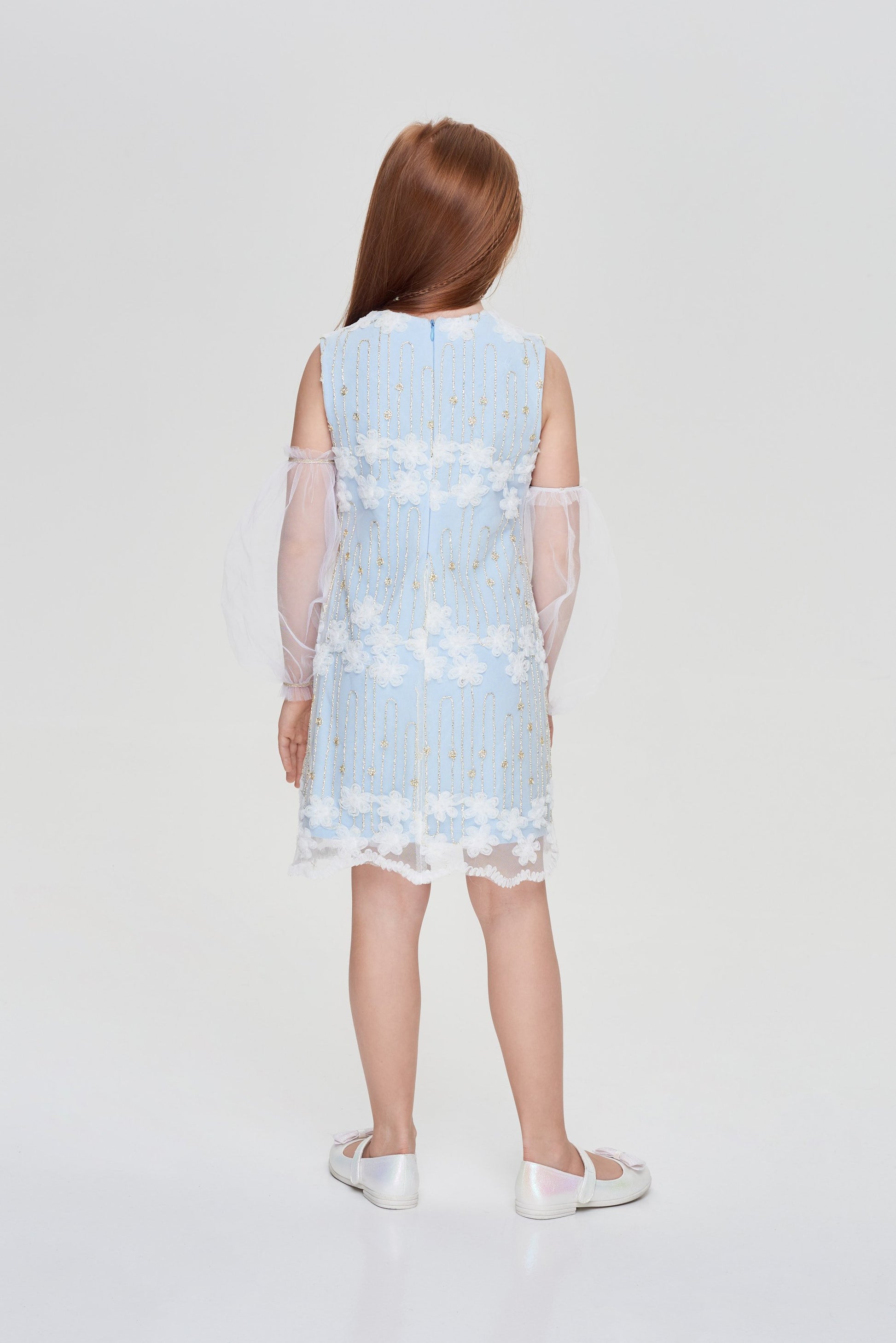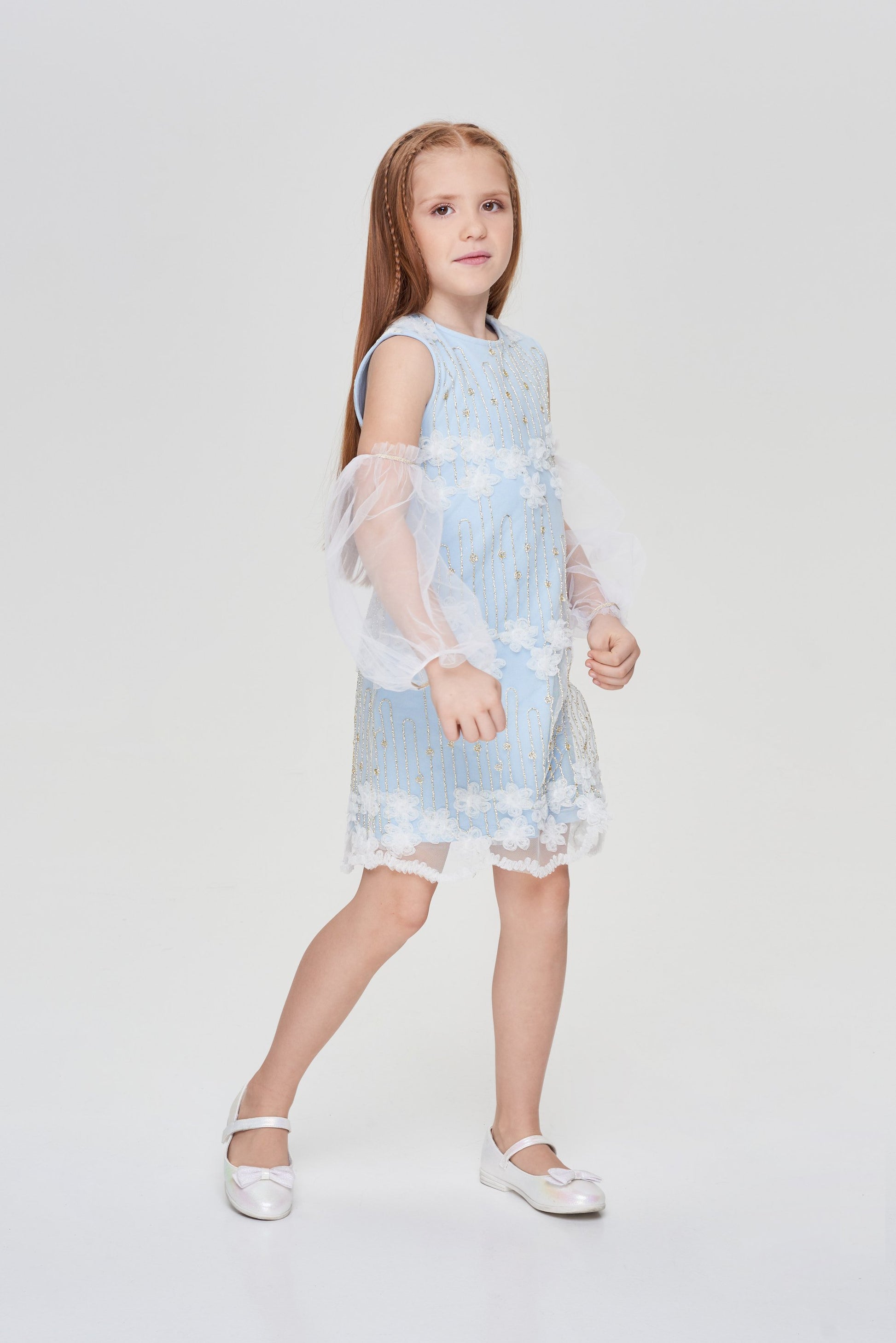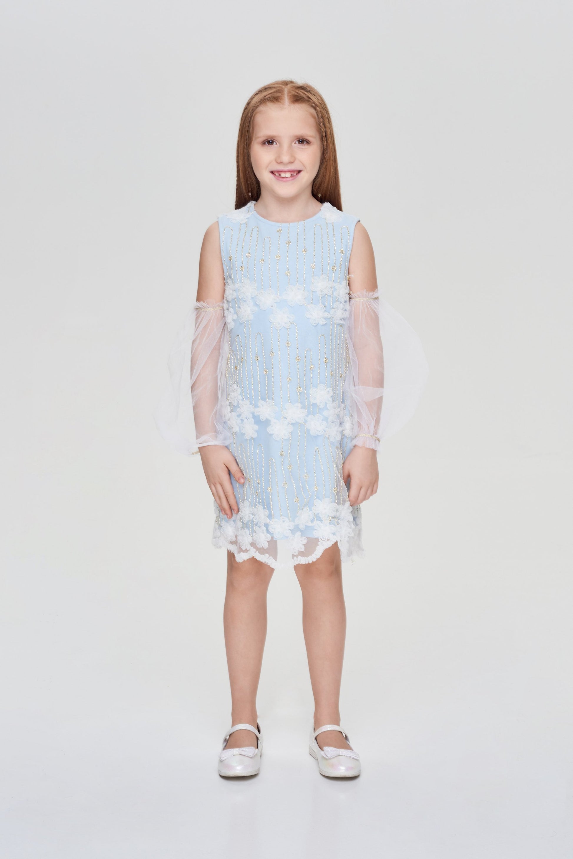 A one-piece flowing dress with open shoulders and removable sleeves, the girl will feel like a fairy. The model of a semi-fitted silhouette, of medium length, with a small round neckline, is made of two layers of fabric in blue tones. The top layer of the product is decorated with embroidery made with gold threads. The design is completed by shining floral applications.